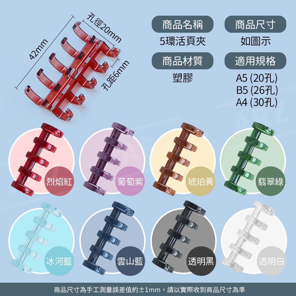 八色 5孔活頁環 可拆環【ARZ 實拍現貨】【D247】活頁本 DIY筆記本 活頁圈 活頁夾 線圈裝訂 活頁孔 活頁扣環烈焰紅,12mm內徑|雲山藍,12mm內徑|冰河藍,12mm內徑|透明黑,12mm內徑|透明白,12mm內徑|翡翠綠,12mm內徑|葡萄紫,12mm內徑|琥珀黃,12mm內徑Loose LeafARZ行動商城