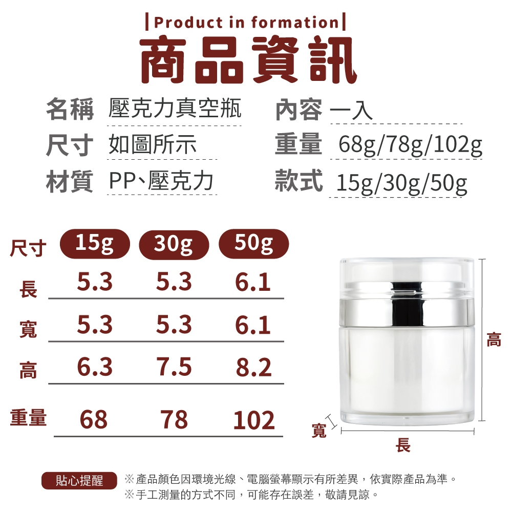 壓克力真空瓶 真空面霜瓶 面霜盒 霜膏瓶 分裝 霜膏 分裝面霜 壓取瓶 壓克力 外出攜帶 旅遊 【小麥購物】【G688】真空瓶|15g|真空瓶|30g|真空瓶|50gTravel Size Bottles & Containers 小麥購物