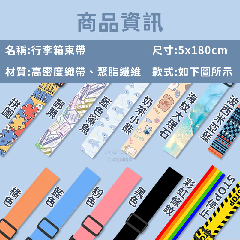 行李箱束帶 實拍影片 行李箱綁帶 台灣出貨 行李帶 行李束帶 旅行箱束帶 束帶 旅行束帶 旅行箱綁帶【STHF13】粉|橘|藍|波西米亞藍|郵票|拼圖|藍色鯊魚|黑|彩虹條紋|海紋大理石|奶茶小熊|STOP停止|彩虹波形紋Luggage StrapsBANG 潮流男女裝服飾、流行生活百貨專賣