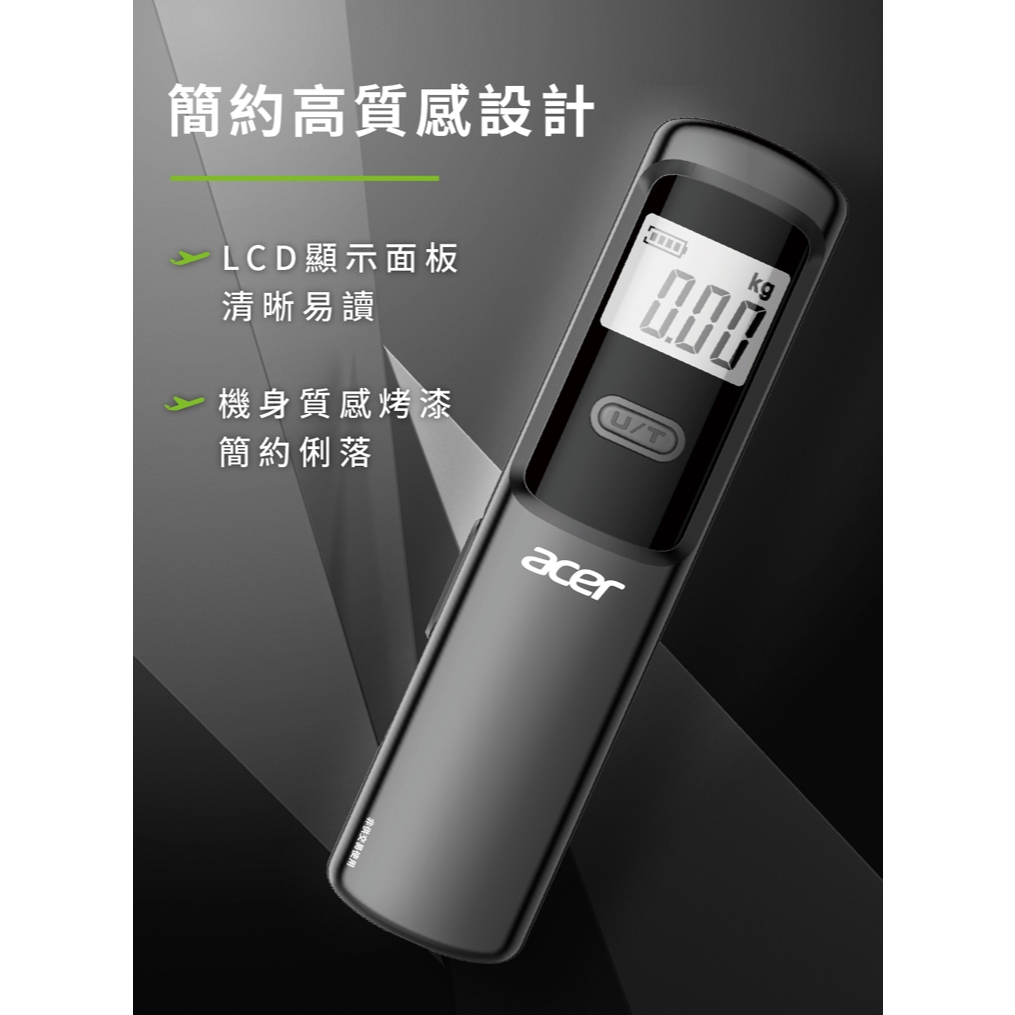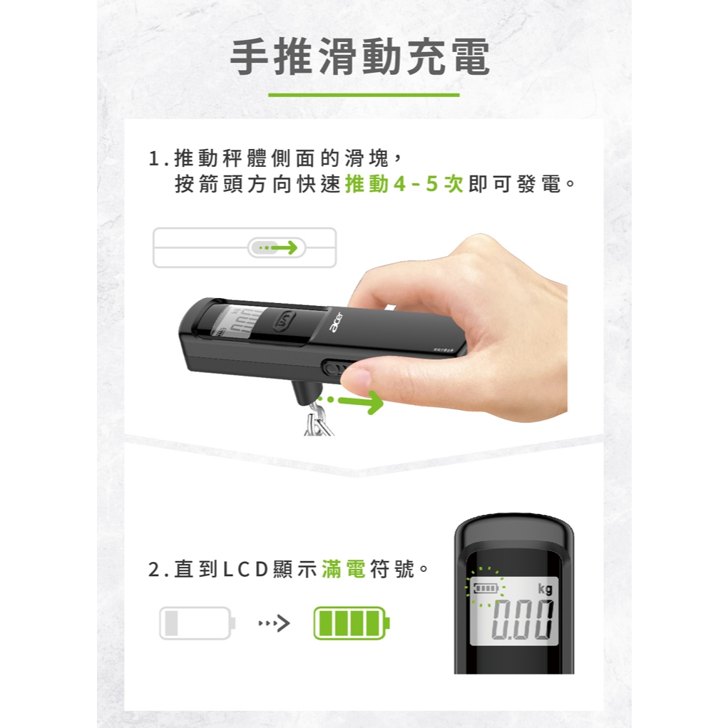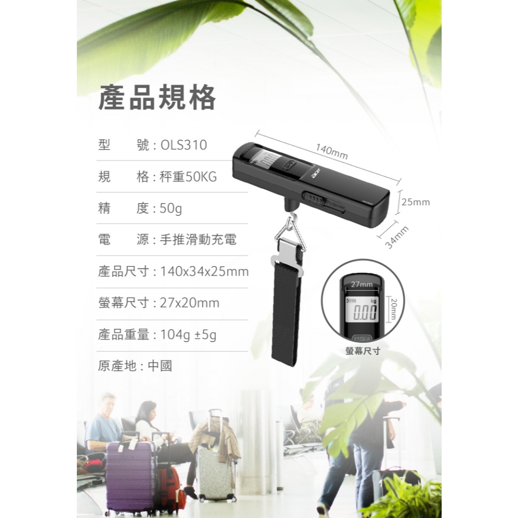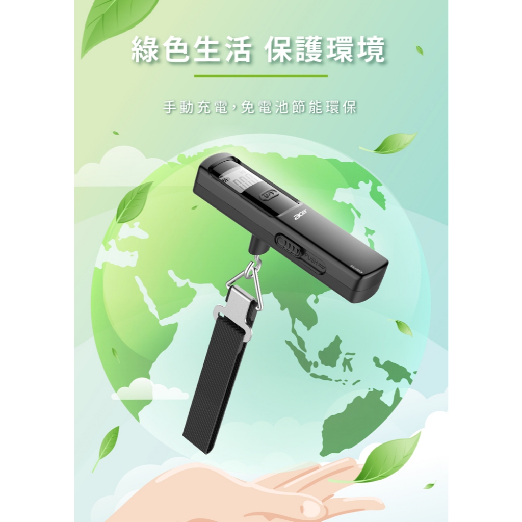 公司貨 最大秤重50公斤【Acer宏碁】免用電池數位手推滑動充電行李秤 OLS310 免電池式 吊秤電子秤手提秤旅行秤1入|2入Luggage Scales【E-MAN】電氣男數位購物商城