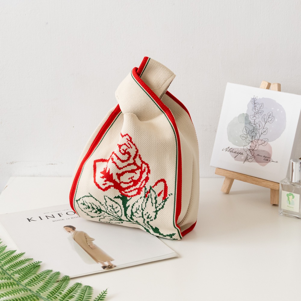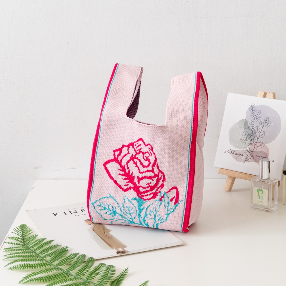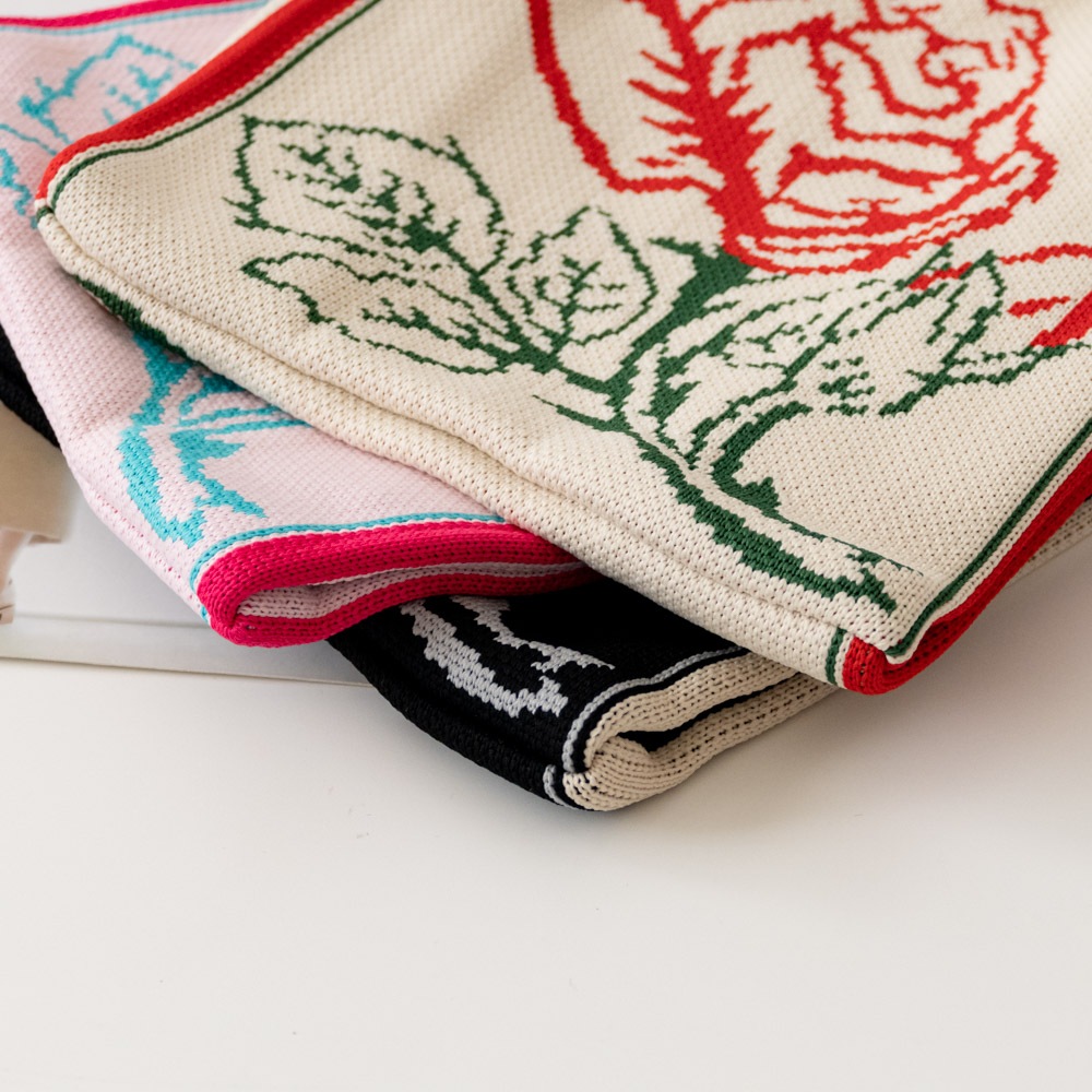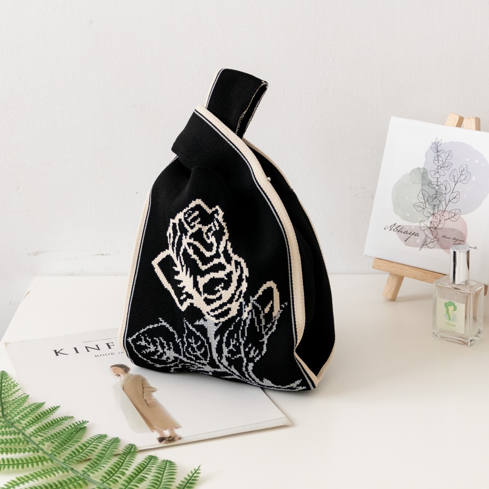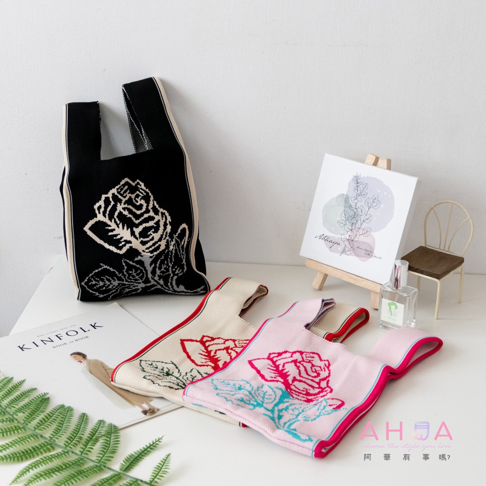 AHUA阿華有事嗎 拼色縷空大玫瑰針織手提包 B0104 韓系包包 百搭配件 包包 袋子 手袋 肩包米底紅玫瑰|淺粉底粉玫瑰|黑底米玫瑰AHUA 韓國襪子品牌旗艦店