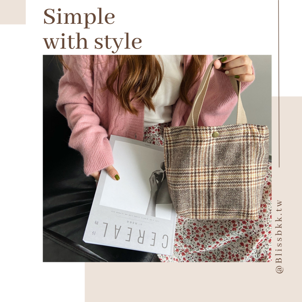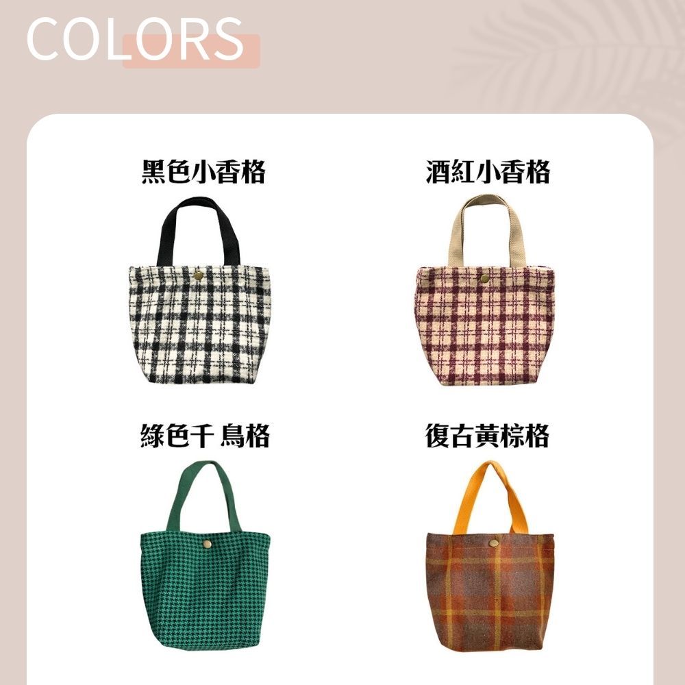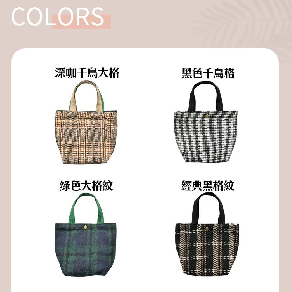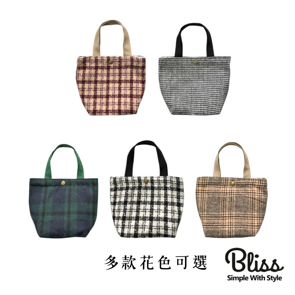手提毛呢小布包 手提包 手提袋 便當袋 手拿包 餐袋 野餐袋 毛呢包 台灣現貨深咖千鳥大格|黑色千鳥格|綠色大格紋|經典黑格紋|黑色小香格|酒紅小香格|綠色千鳥格|復古黃棕格Bliss ~ 各國流行包款 泰國原廠化妝保養品