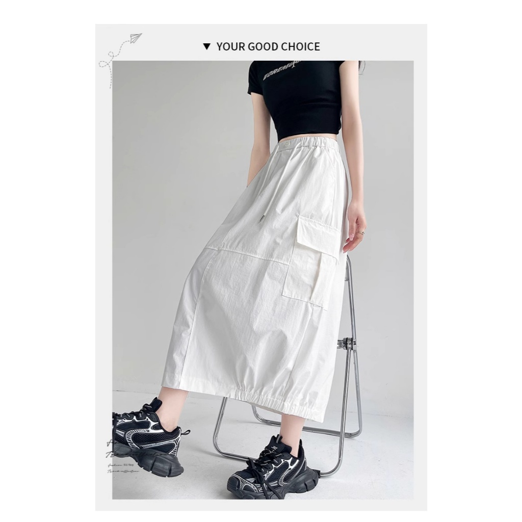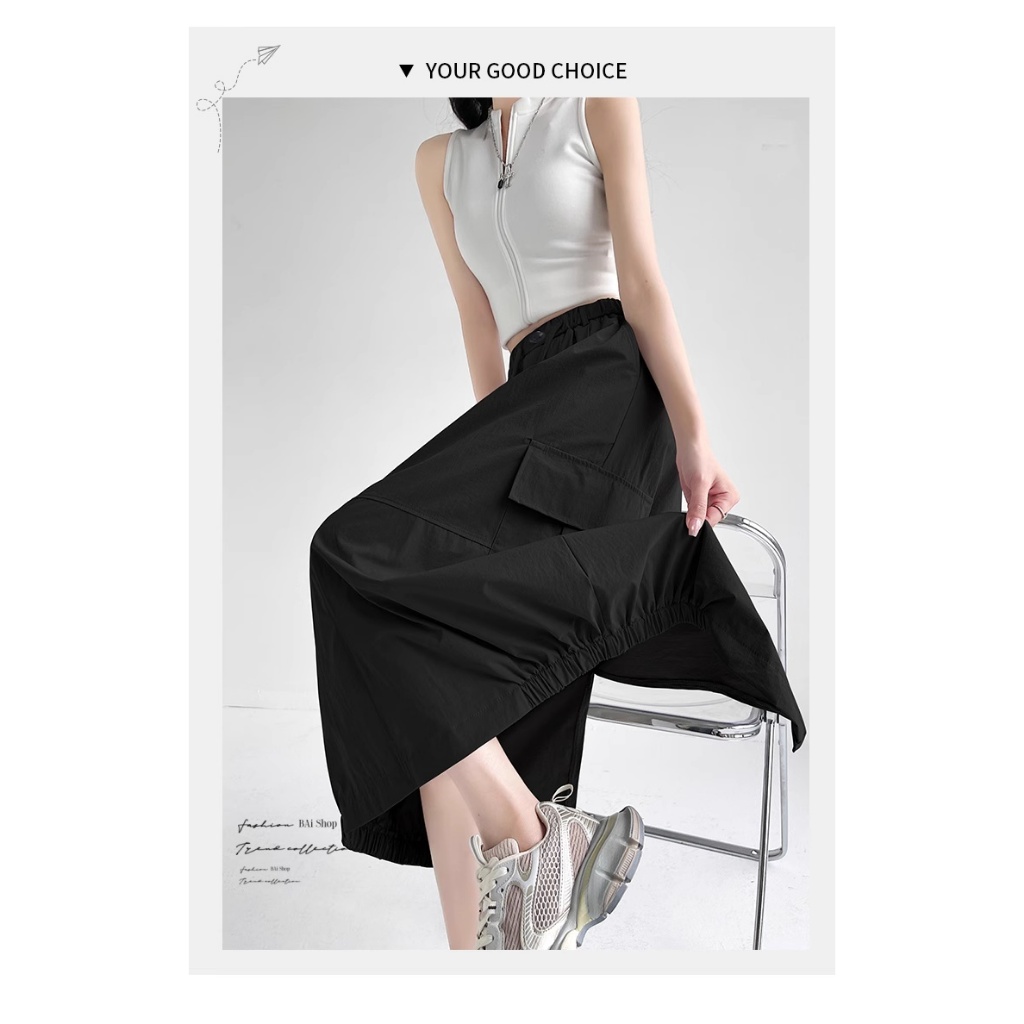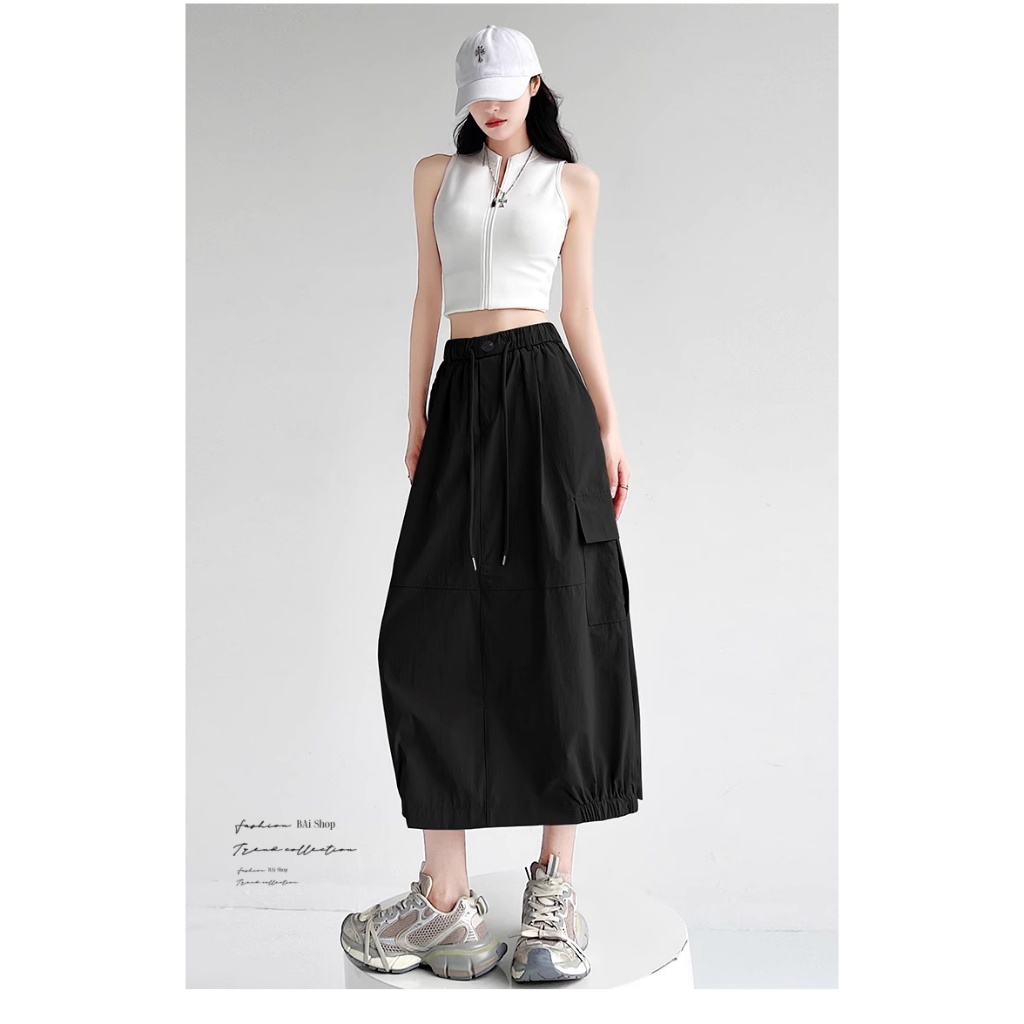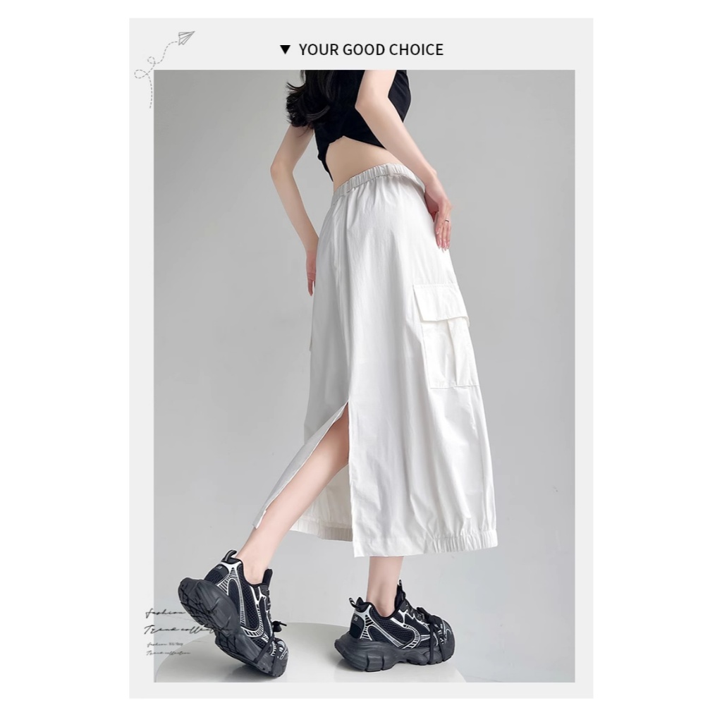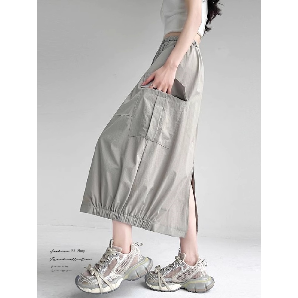 BAi白媽媽 涼感冰絲裙/工裝風 後開叉鬆緊腰-台灣現貨 隔日到貨【350418】白(01)|黑(02)|綠灰(10)BAi白媽媽 品牌旗艦店