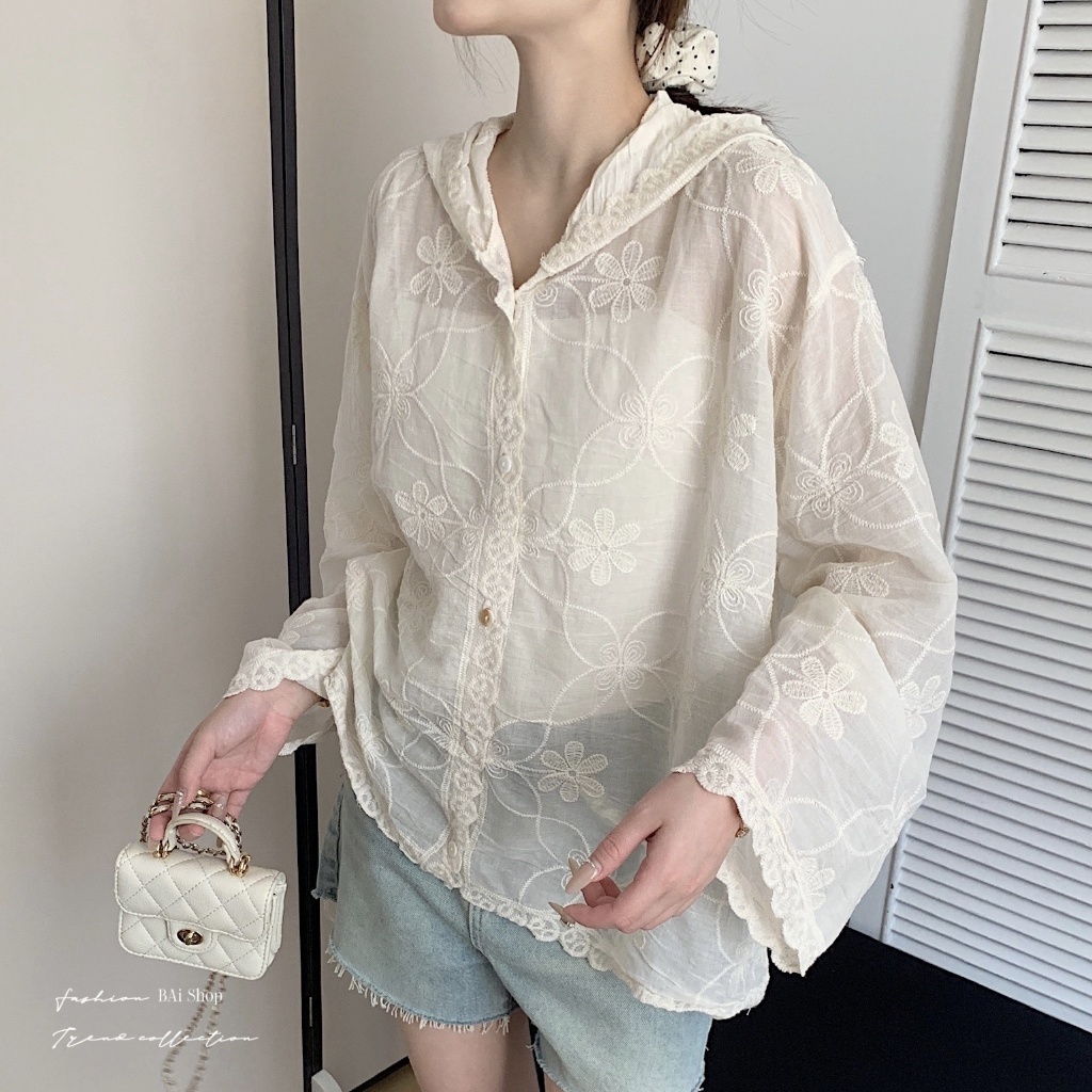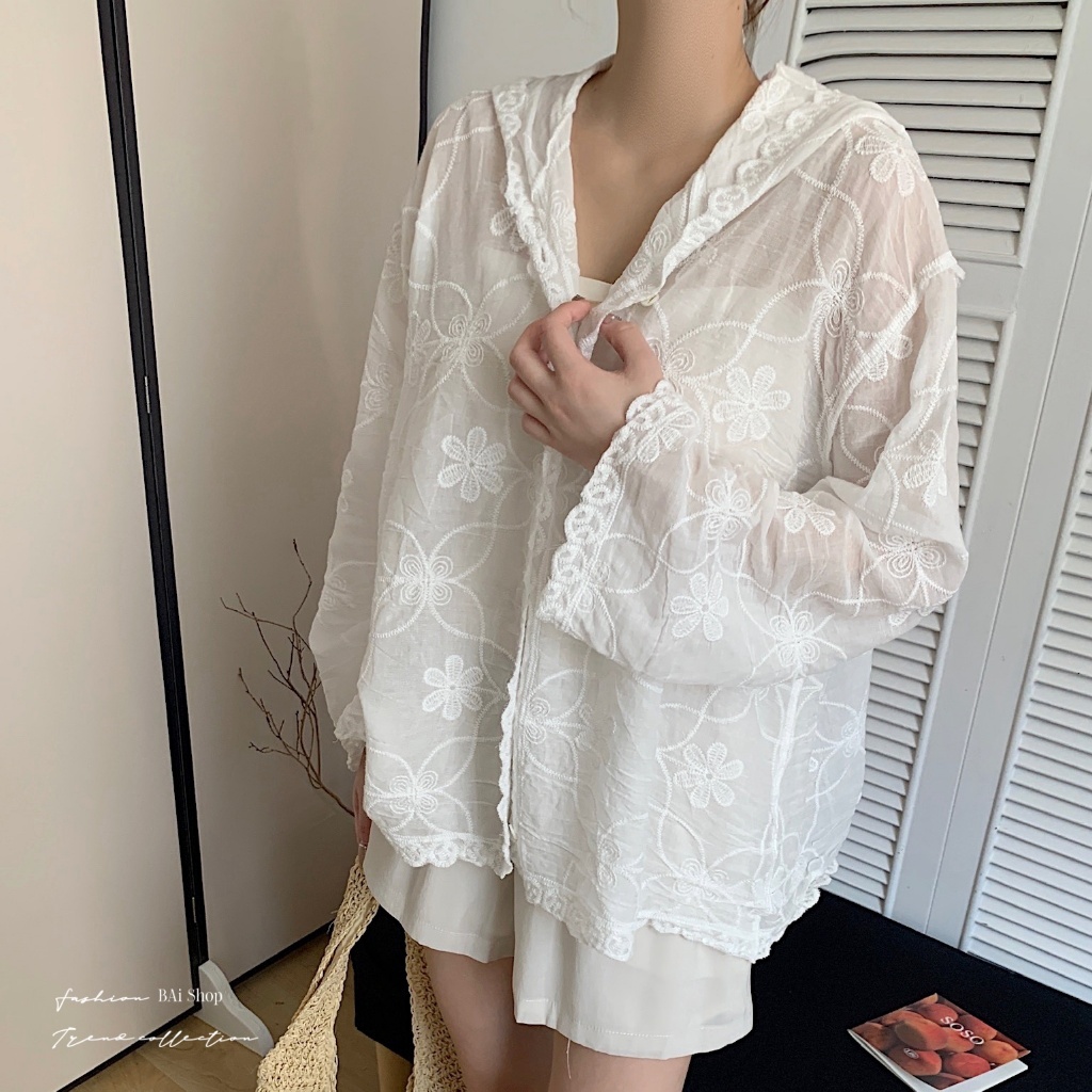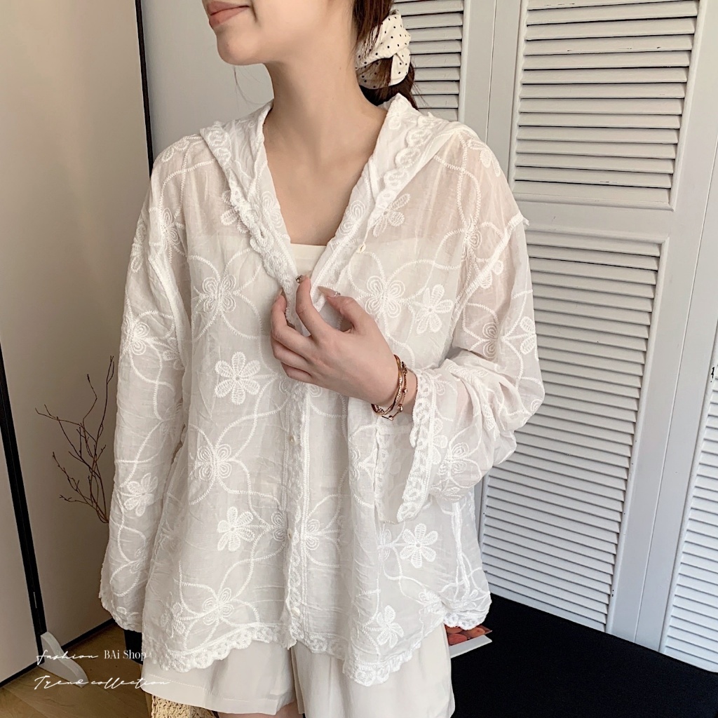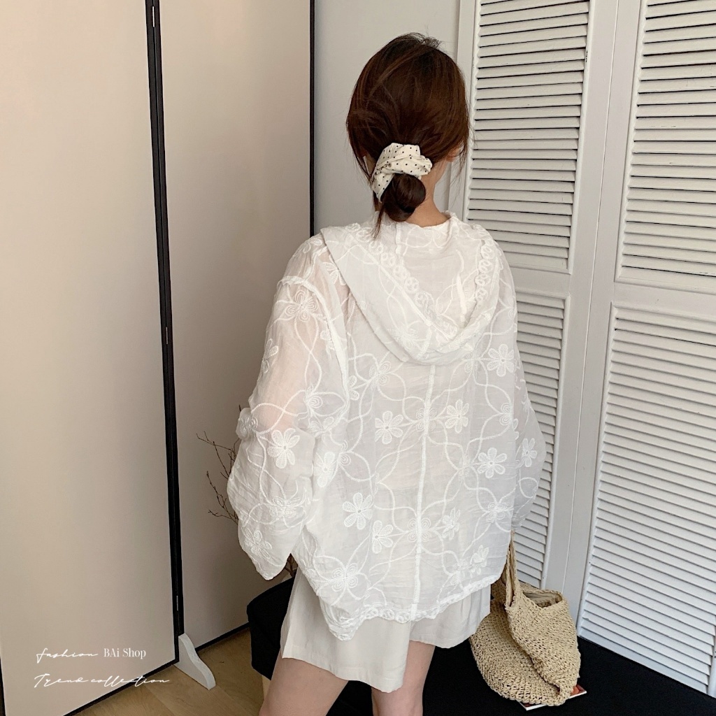BAi白媽媽 刺繡花朵連帽衫/鈎花寬鬆防曬 Outerwear-【350516】白_透(01)|杏_透(22)JacketsBAi白媽媽 品牌旗艦店