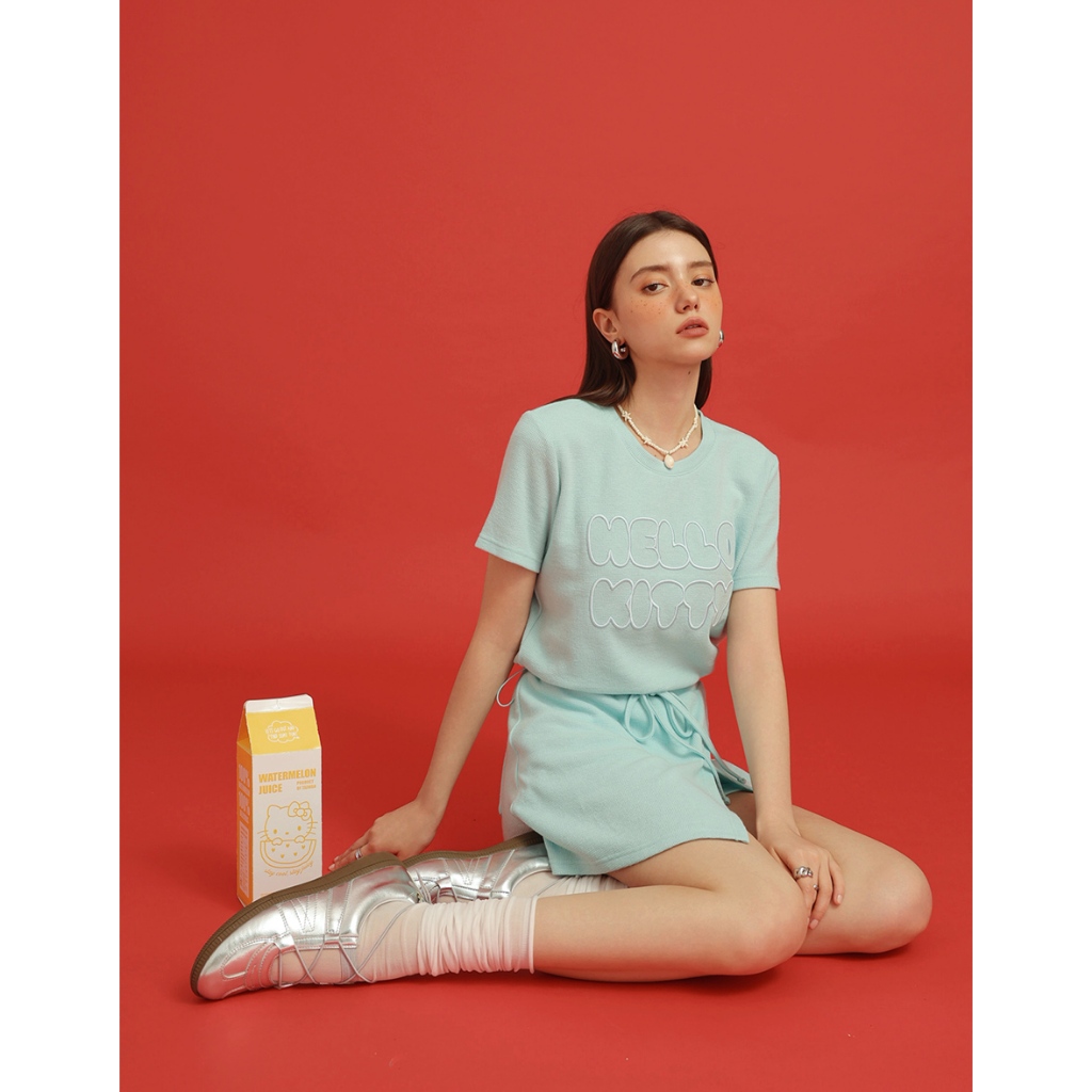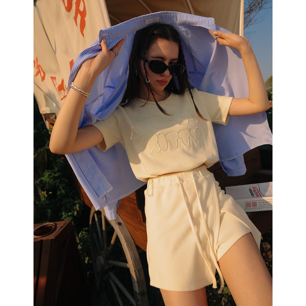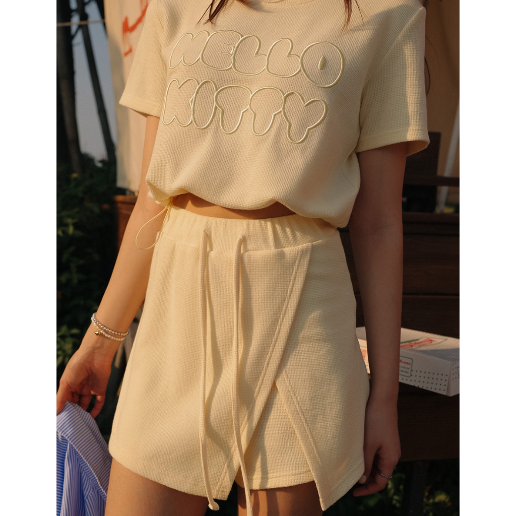 AIR SPACE PLUS 【Hello Kitty聯名】刺繡字母短袖短褲套裝(黃/淺藍) 女裝 現貨 大尺碼黃,XL|黃,2XL|黃,3XL|淺藍,XL|淺藍,2XL|淺藍,3XLIndividual SetsAIR SPACE