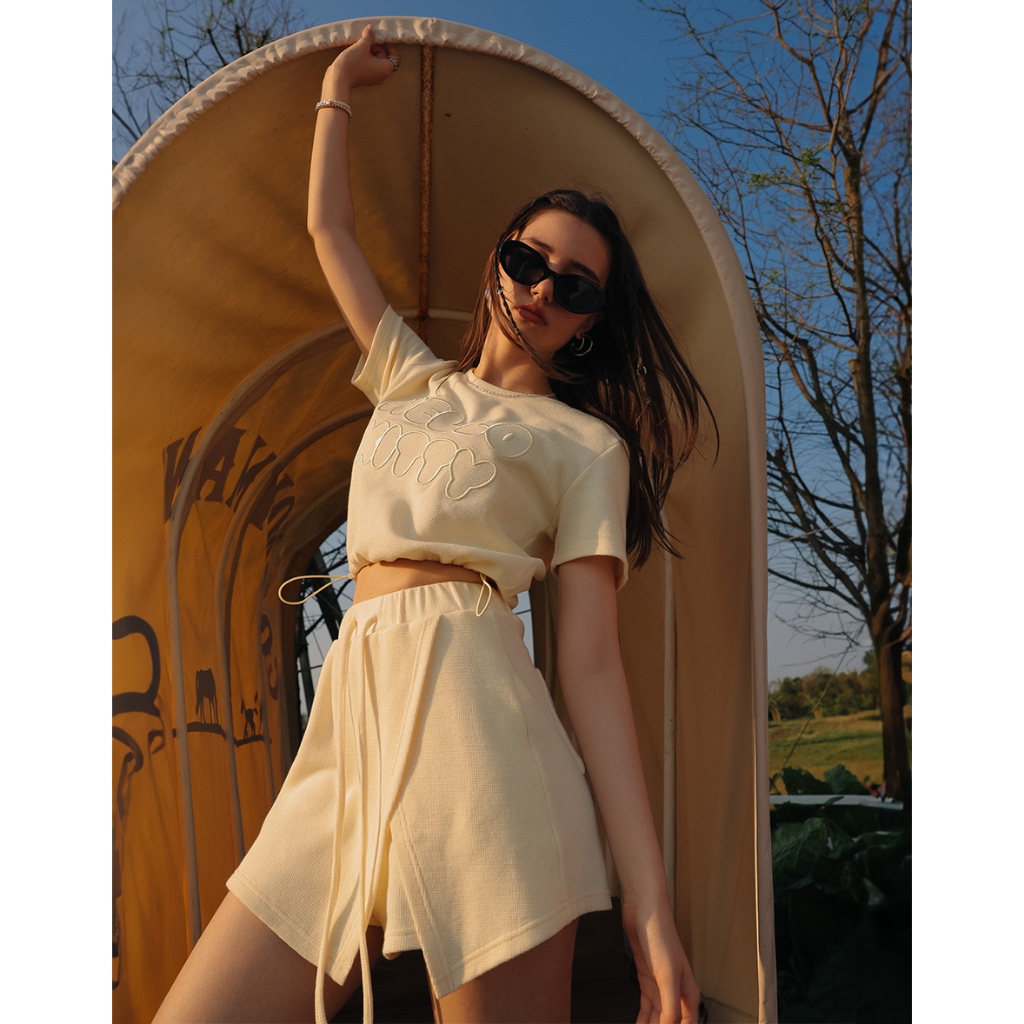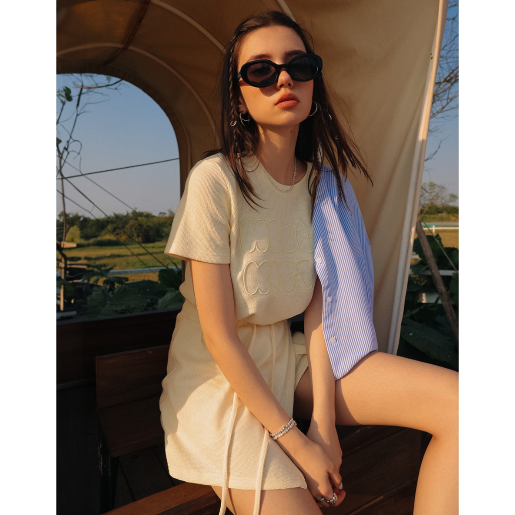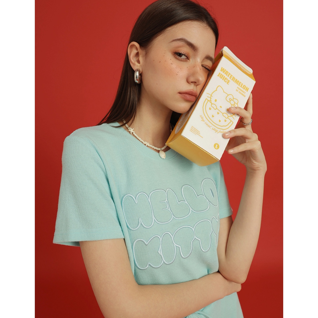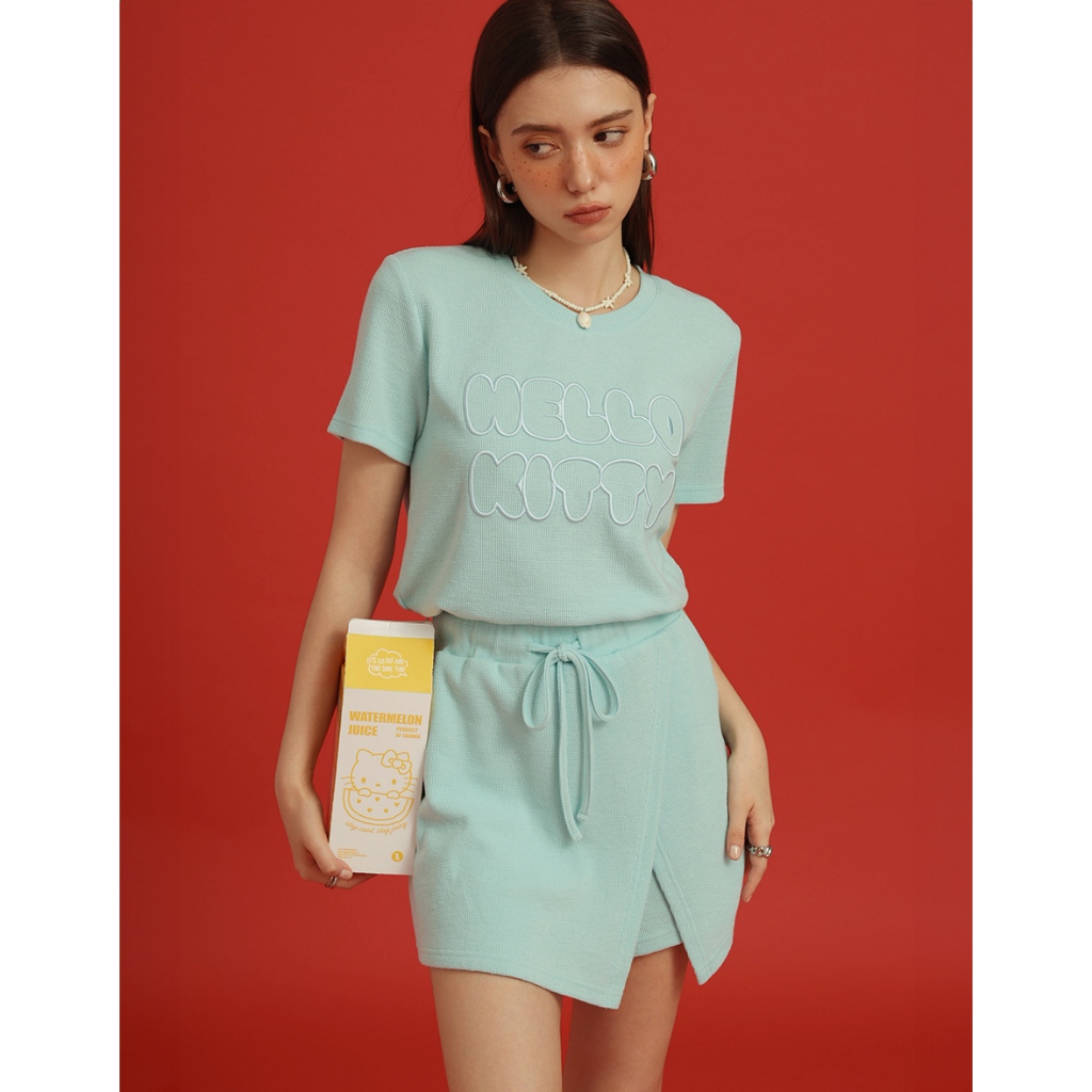 AIR SPACE PLUS 【Hello Kitty聯名】刺繡字母短袖短褲套裝(黃/淺藍) 女裝 現貨 大尺碼黃,XL|黃,2XL|黃,3XL|淺藍,XL|淺藍,2XL|淺藍,3XLIndividual SetsAIR SPACE