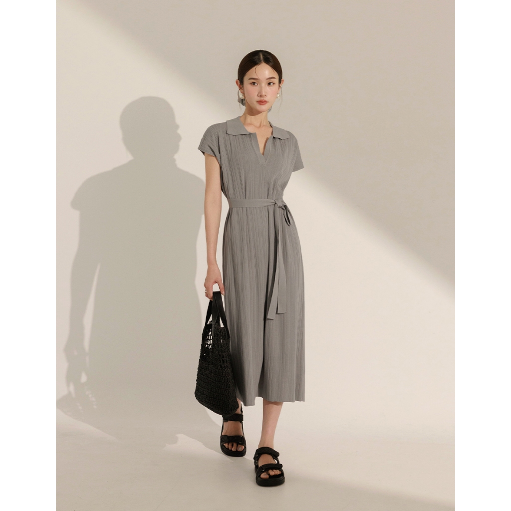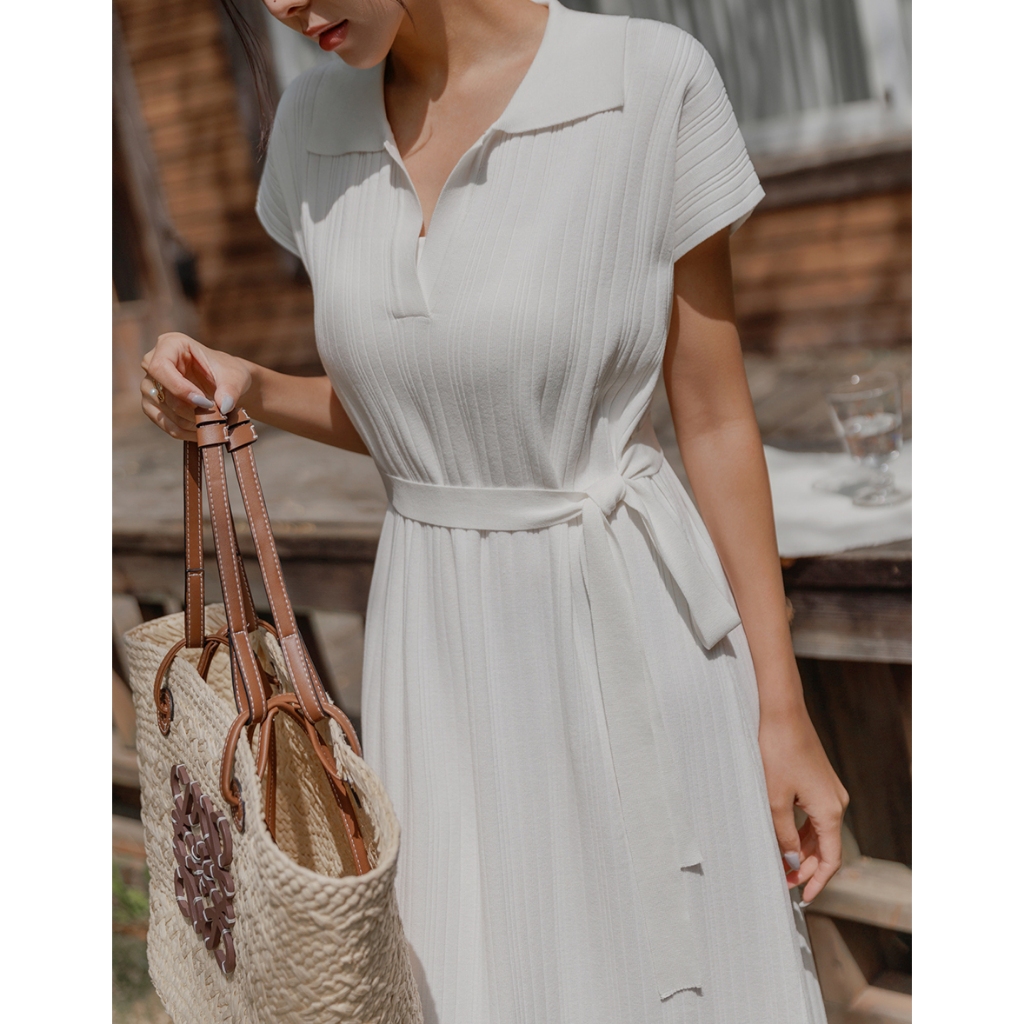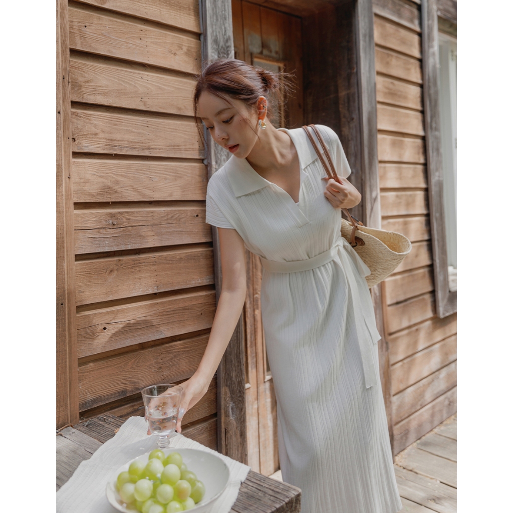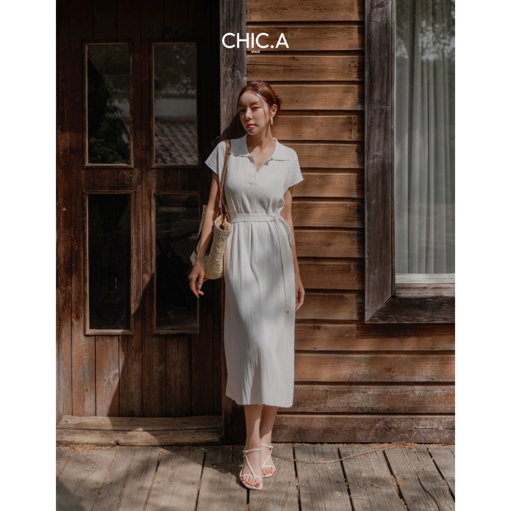 CHIC A SPACE 翻領連肩袖直紋綁帶長洋裝(白/淺灰) 女裝 現貨白,S|白,M|淺灰,S|淺灰,MAIR SPACE