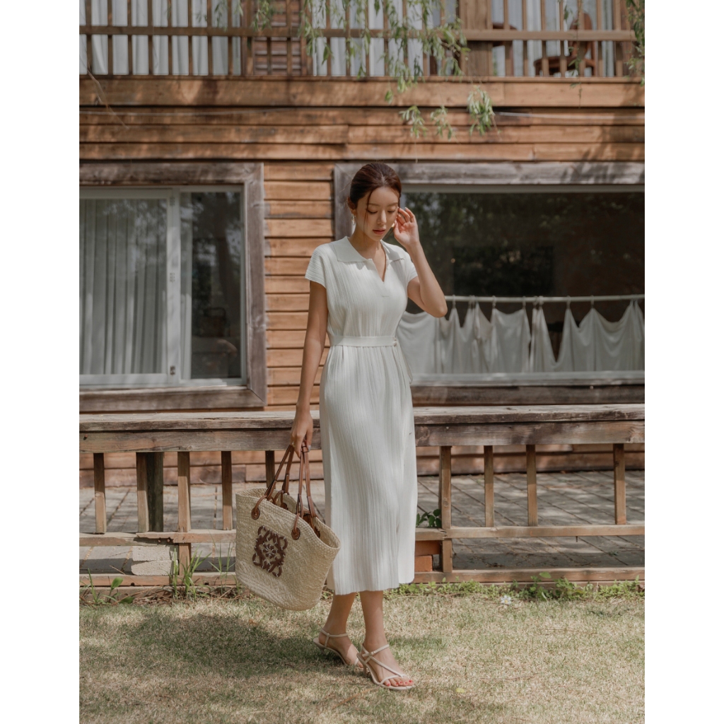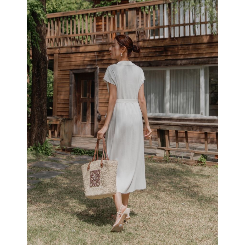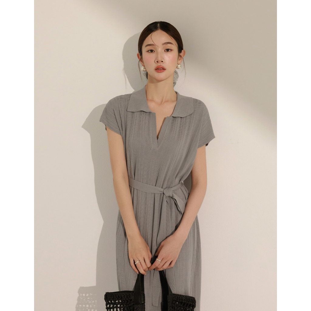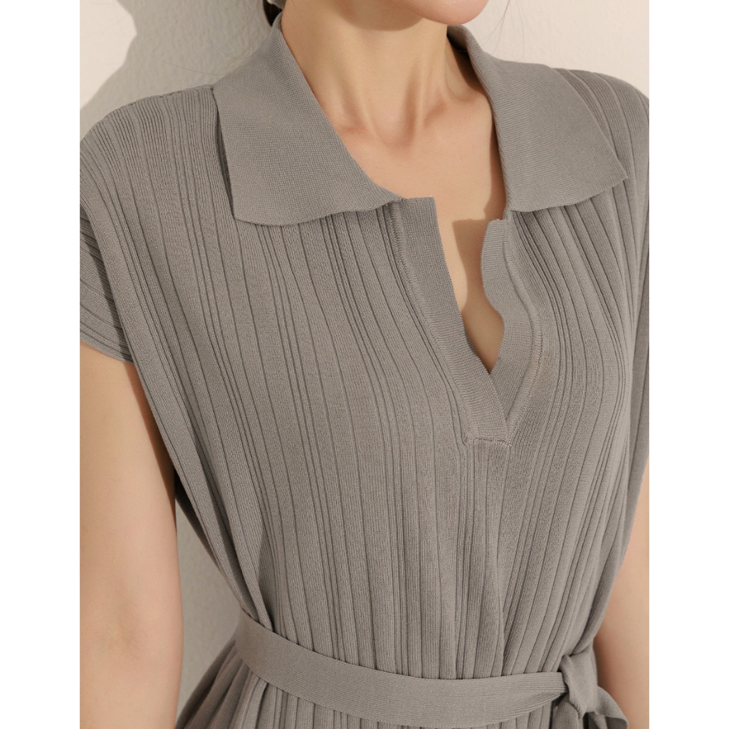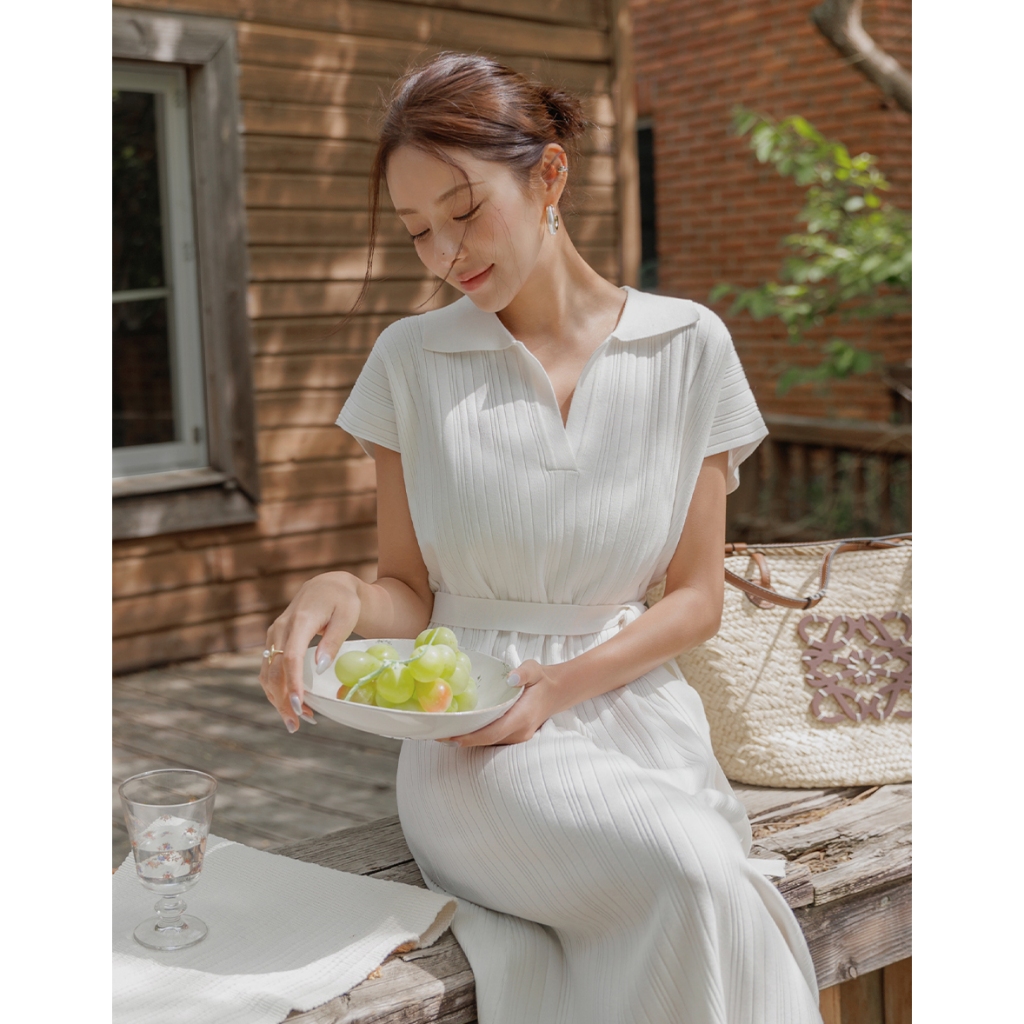 CHIC A SPACE 翻領連肩袖直紋綁帶長洋裝(白/淺灰) 女裝 現貨白,S|白,M|淺灰,S|淺灰,MAIR SPACE