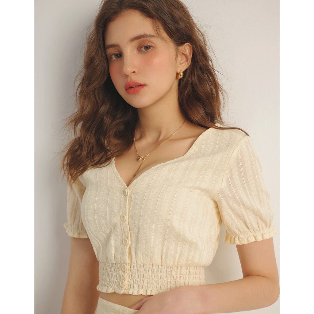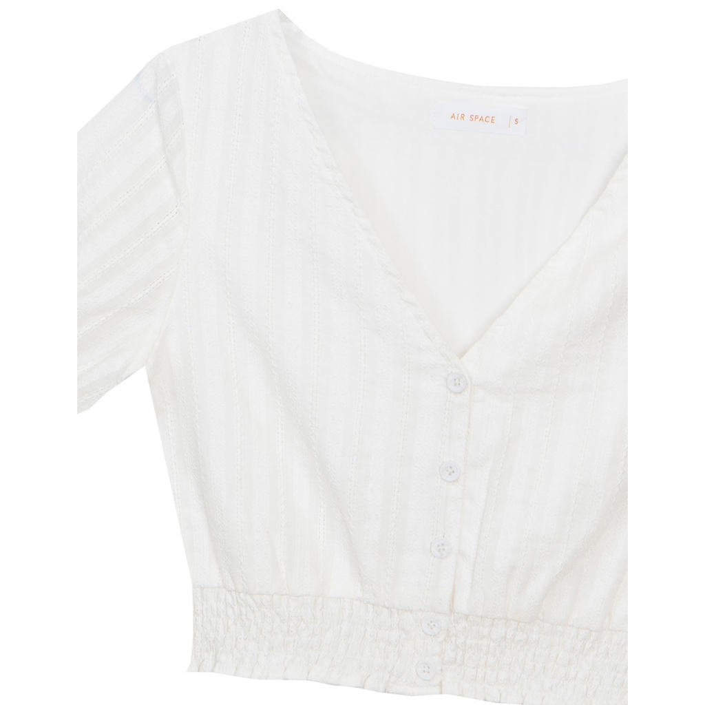 AIR SPACE V領直條織紋皺褶收腰短版上衣(白/杏) 女裝 現貨白,S|白,M|白,L|杏,S|杏,M|杏,LOthersAIR SPACE
