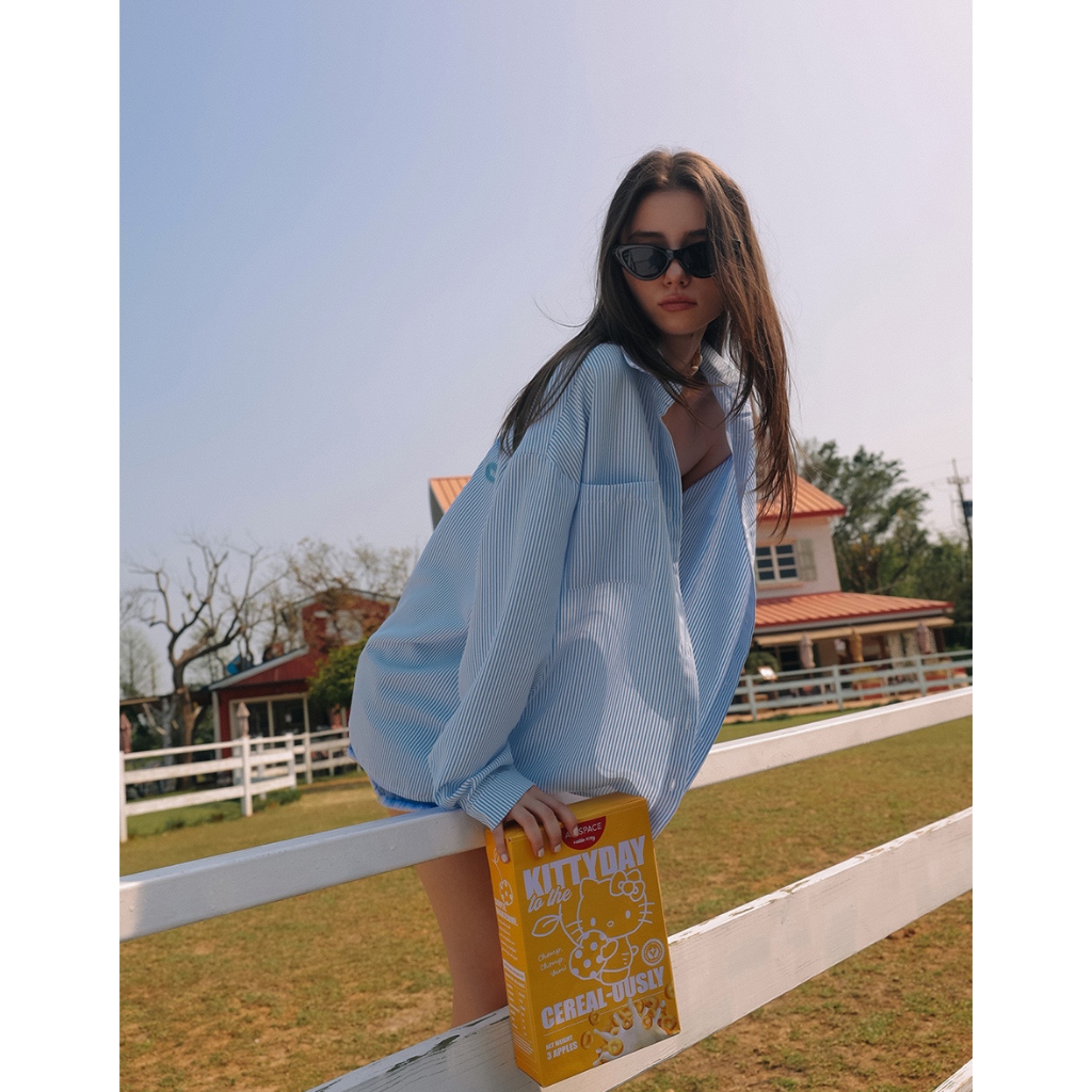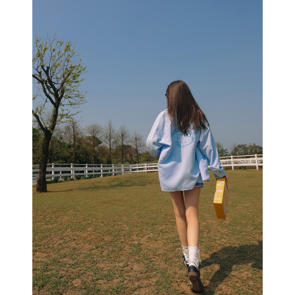AIR SPACE 【Hello Kitty聯名】刺繡圖案條紋寬版襯衫(藍/粉紅) 女裝 現貨藍,F|粉紅,FShirts & BlousesAIR SPACE