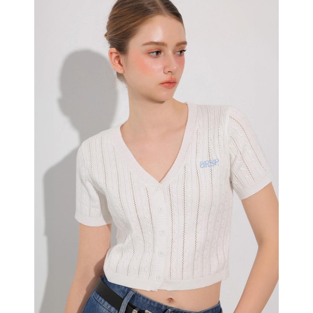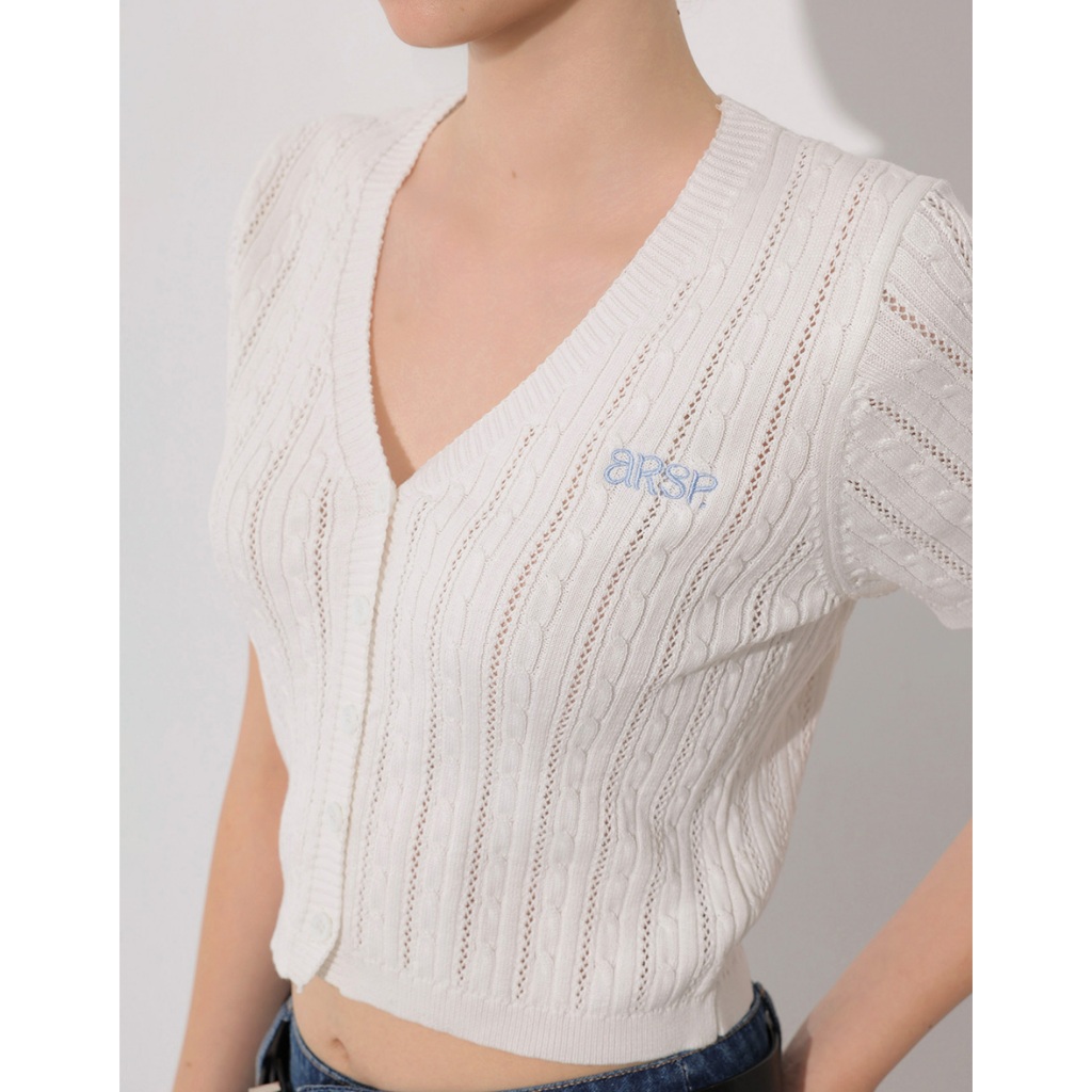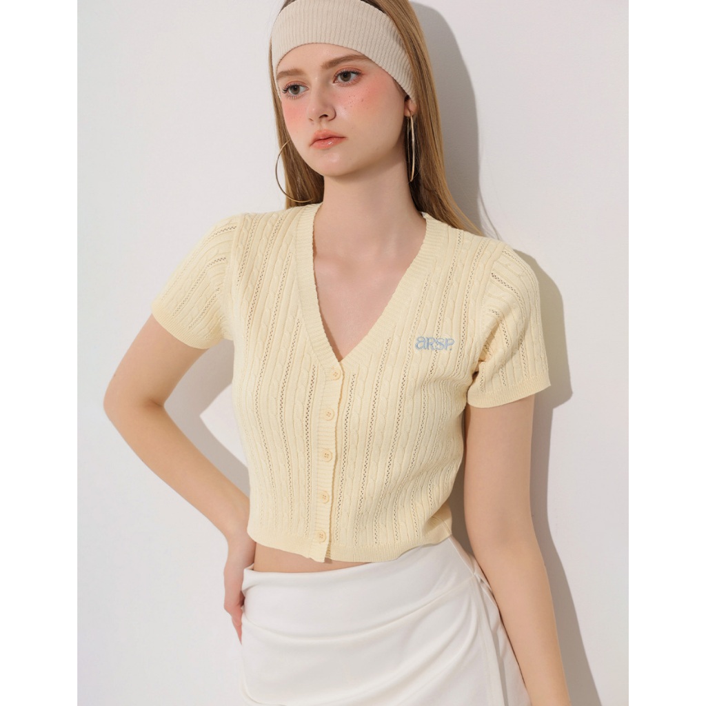 AIR SPACE 品牌LOGO刺繡麻花短袖針織開襟衫(白/黃/淺藍) 女裝 現貨白,S|白,M|黃,S|黃,M|淺藍,S|淺藍,MAIR SPACE