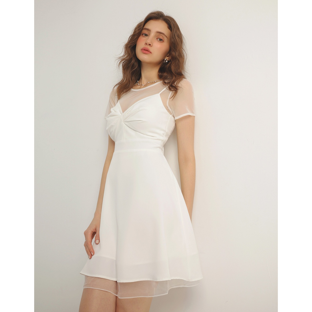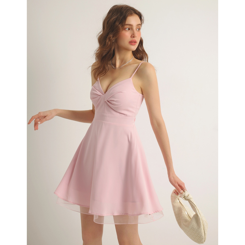 AIR SPACE 交叉打褶透紗襯裡細肩帶短洋裝(附胸墊)(白/粉紅) 女裝 現貨粉紅,L|白,S|白,M|白,L|粉紅,S|粉紅,MAIR SPACE
