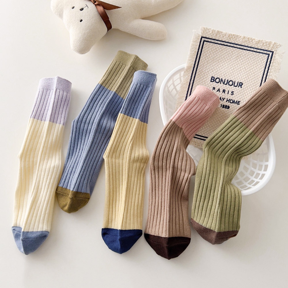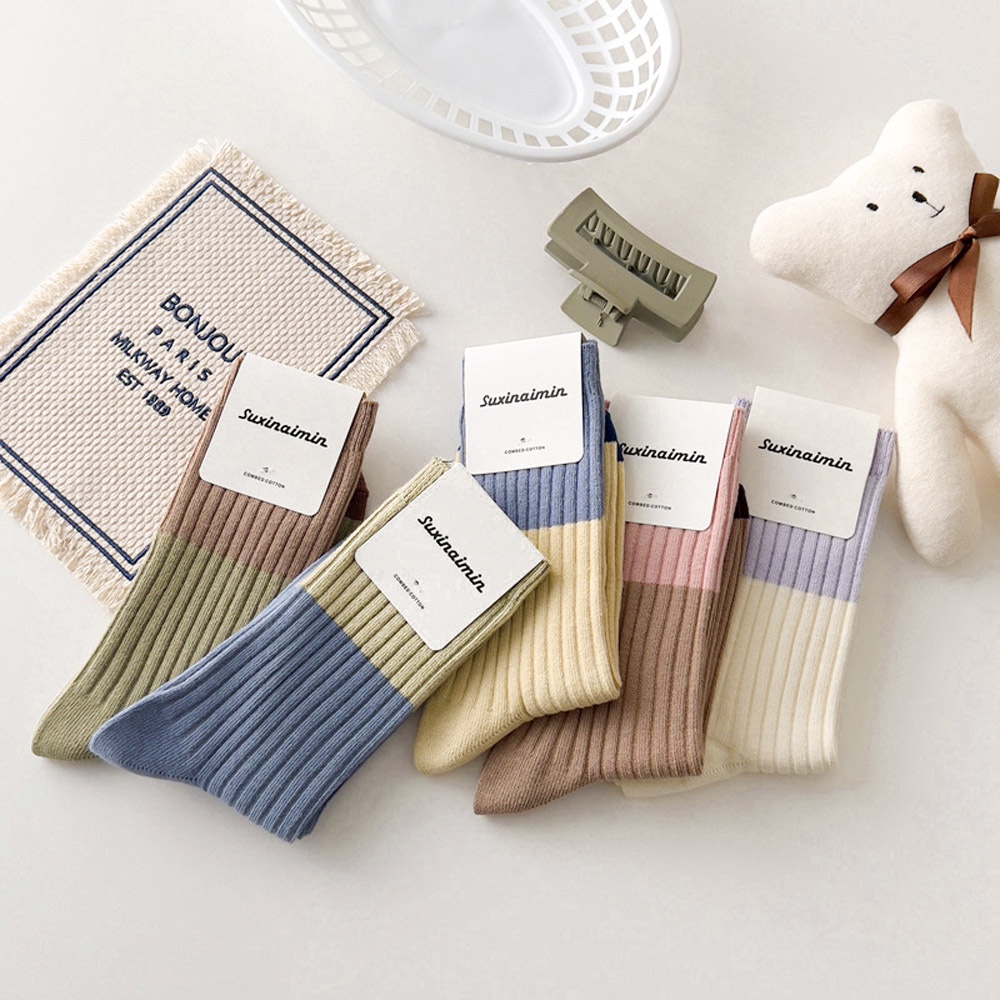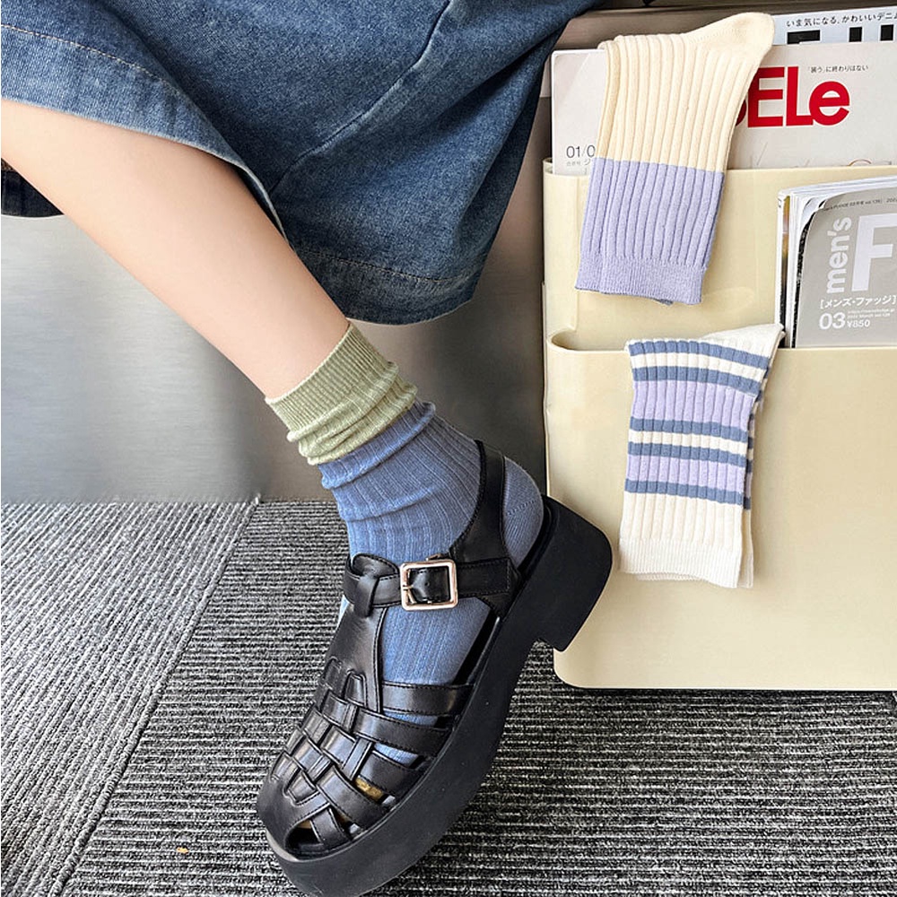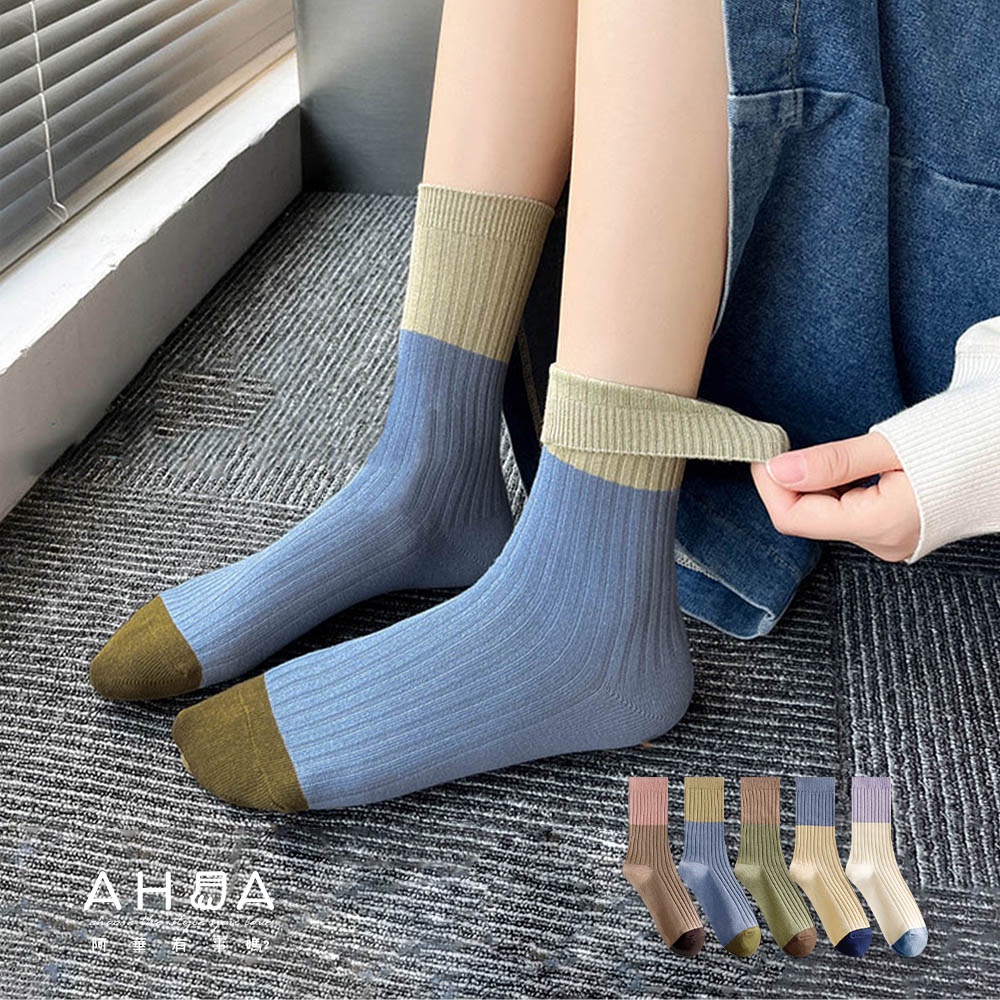 AHUA阿華有事嗎 莫蘭迪拼色坑條中筒襪 女襪 S0459 襪子推薦 流行襪首選 長襪 純棉襪米白底紫襪口|米黃底藍襪口|藍底綠襪口|綠底咖襪口|咖底粉襪口SocksAHUA 韓國襪子品牌旗艦店