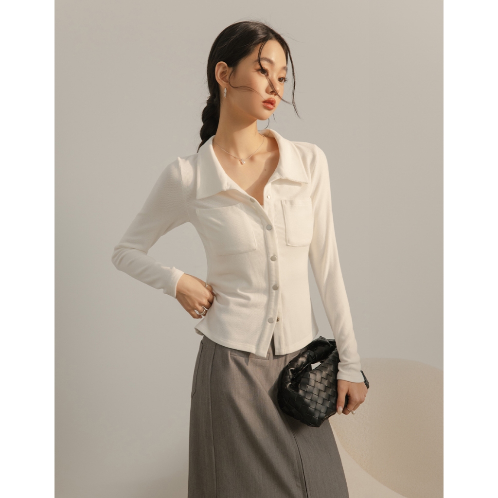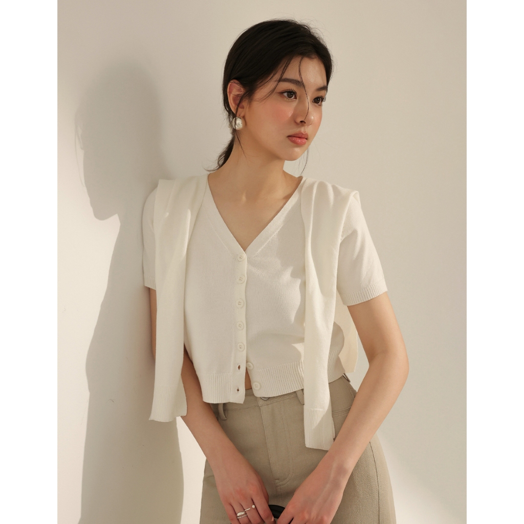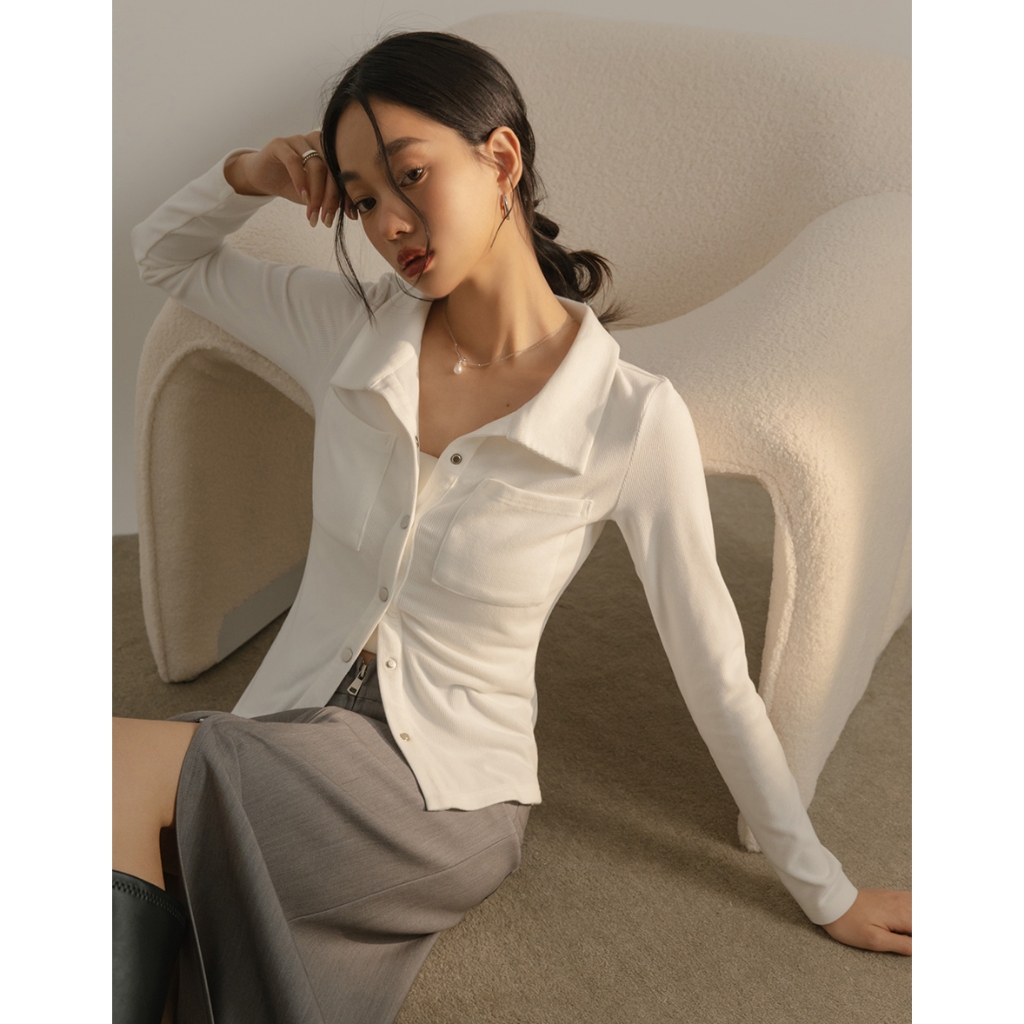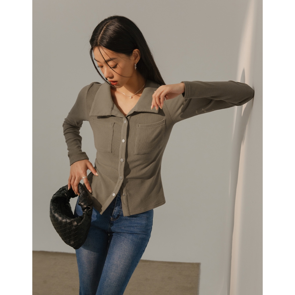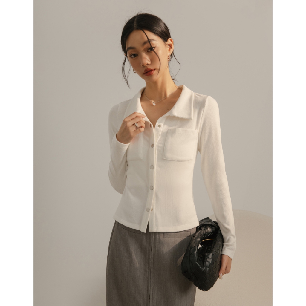 CHIC A SPACE 翻領壓釦針織上衣(白/卡其) 女裝 現貨白,S|白,M|白,L|卡其,S|卡其,M|卡其,LAIR SPACE