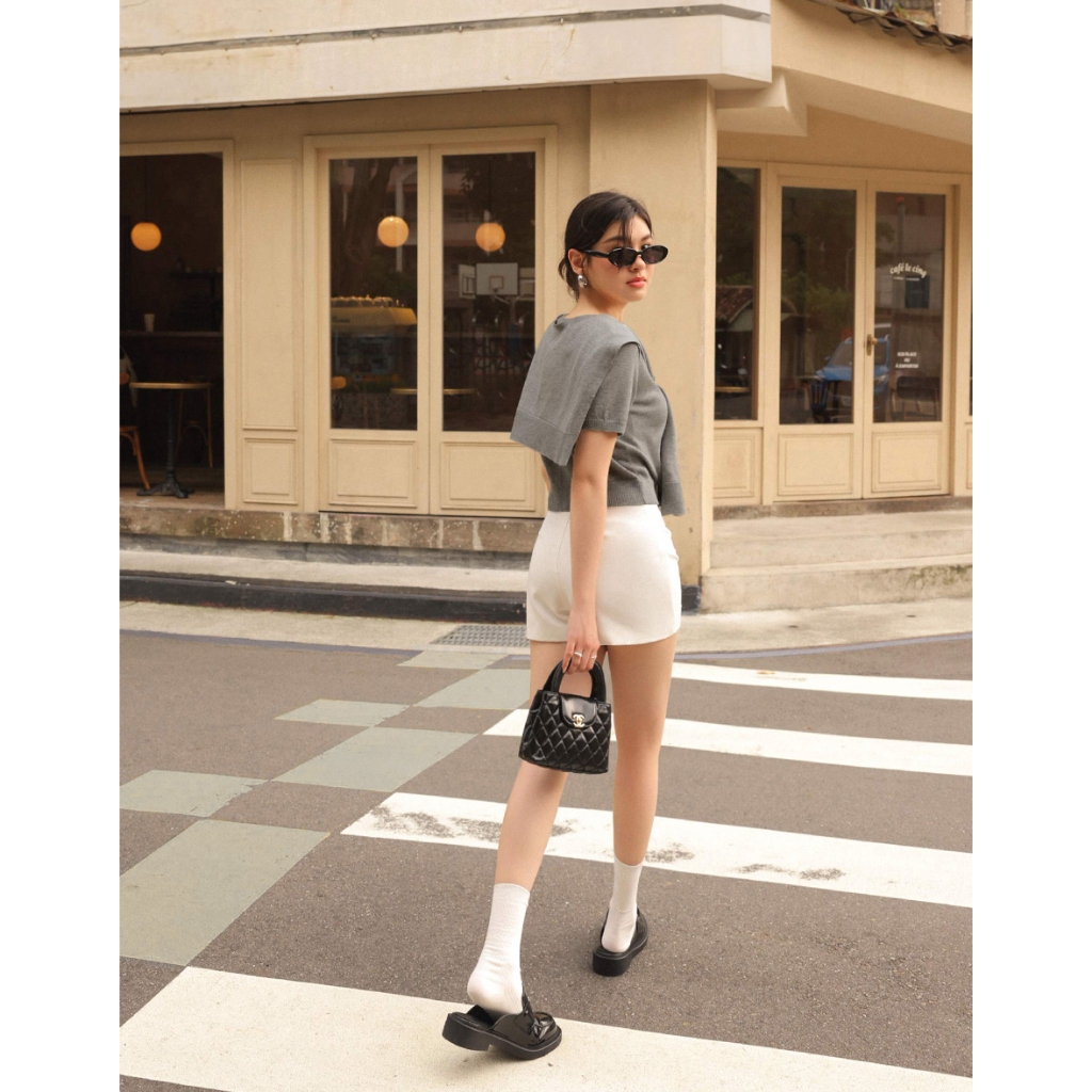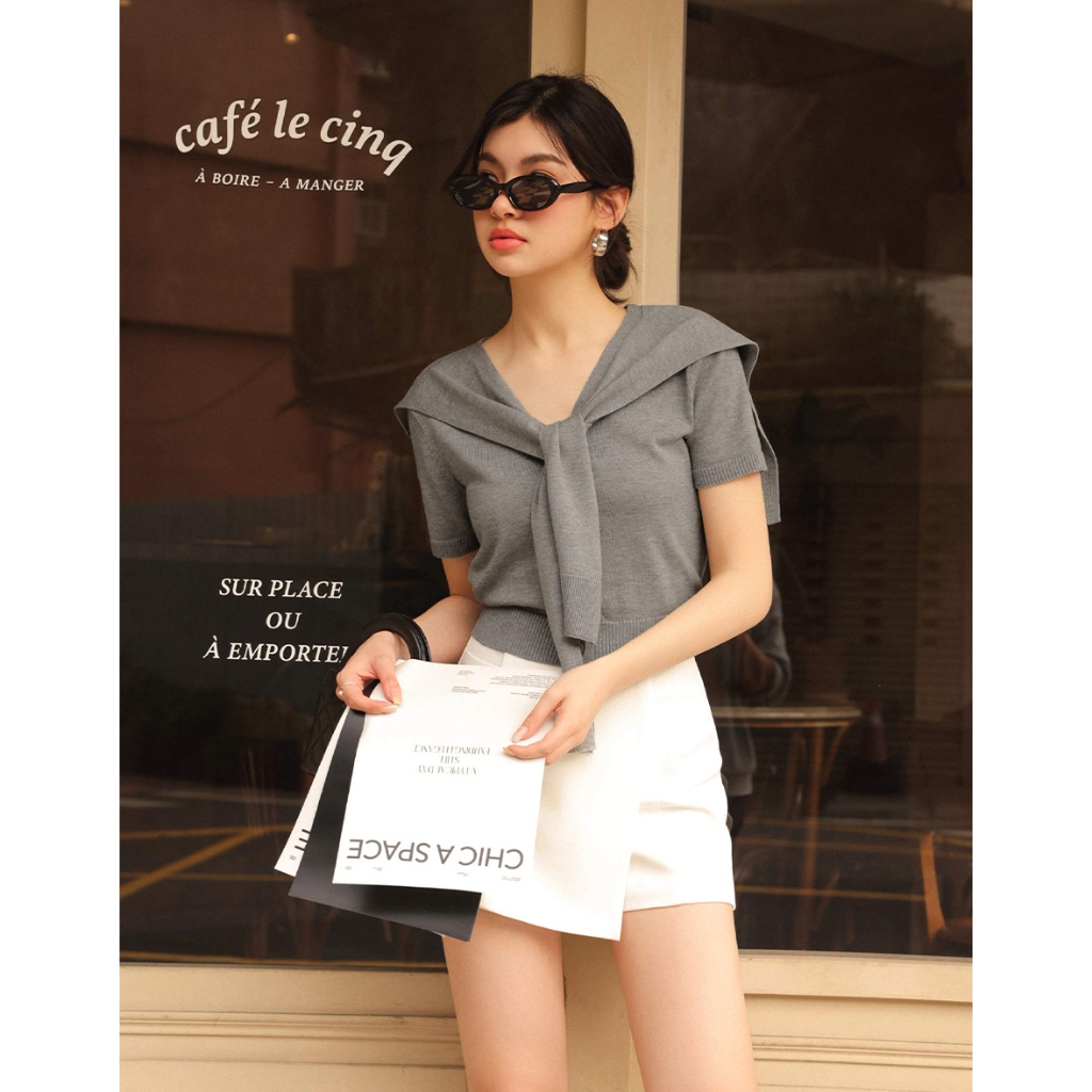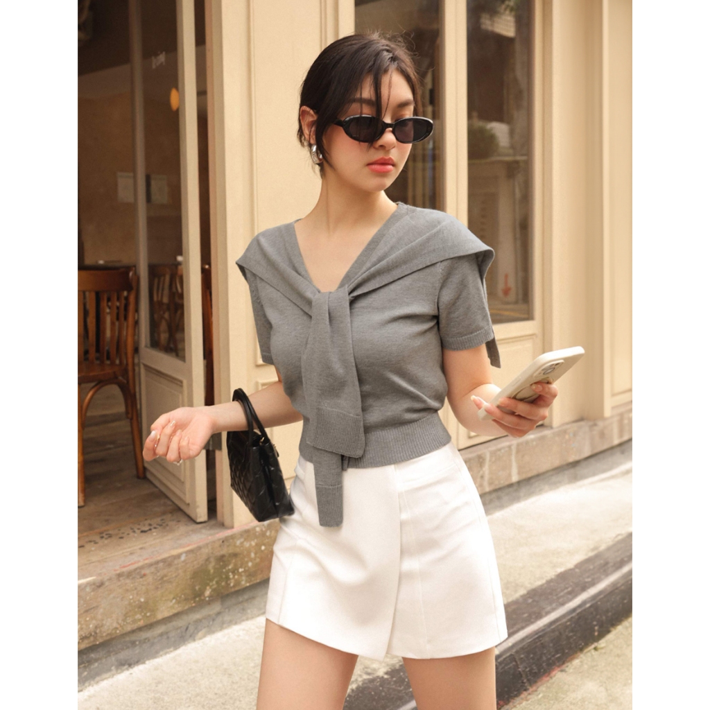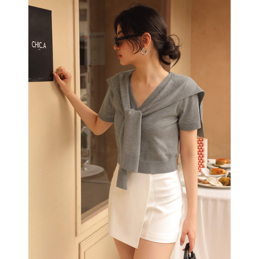 CHIC A SPACE 學院風綁結針織上衣(白/灰) 女裝 現貨