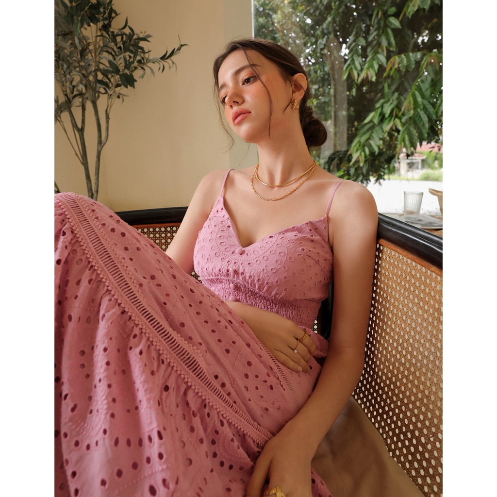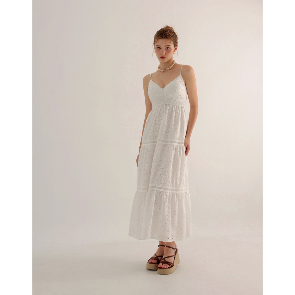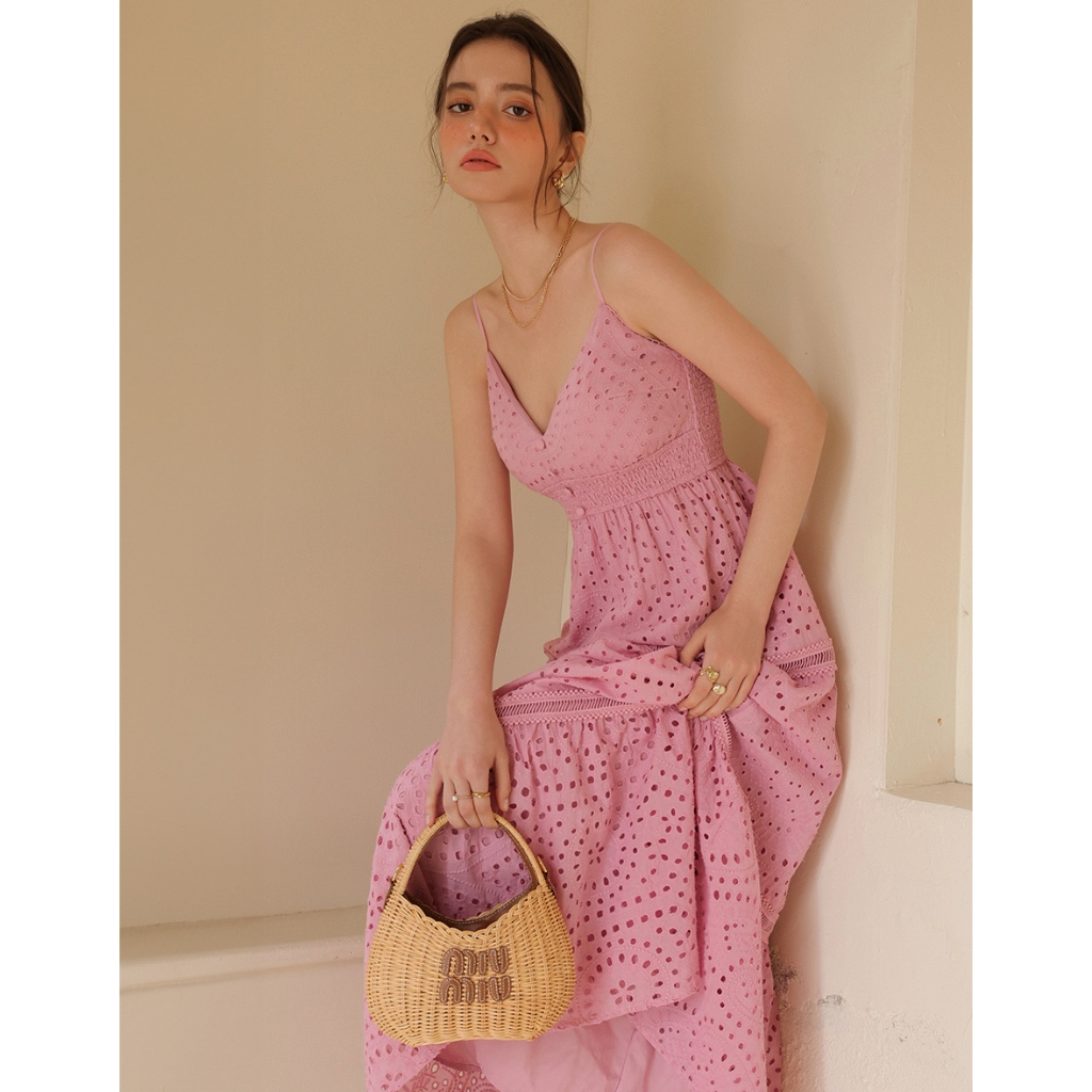 AIR SPACE V領鏤空蕾絲細肩帶蛋糕長洋裝(附胸墊)(白/粉紅) 女裝 現貨白,L|粉紅,S|粉紅,M|粉紅,L|白,S|白,MAIR SPACE
