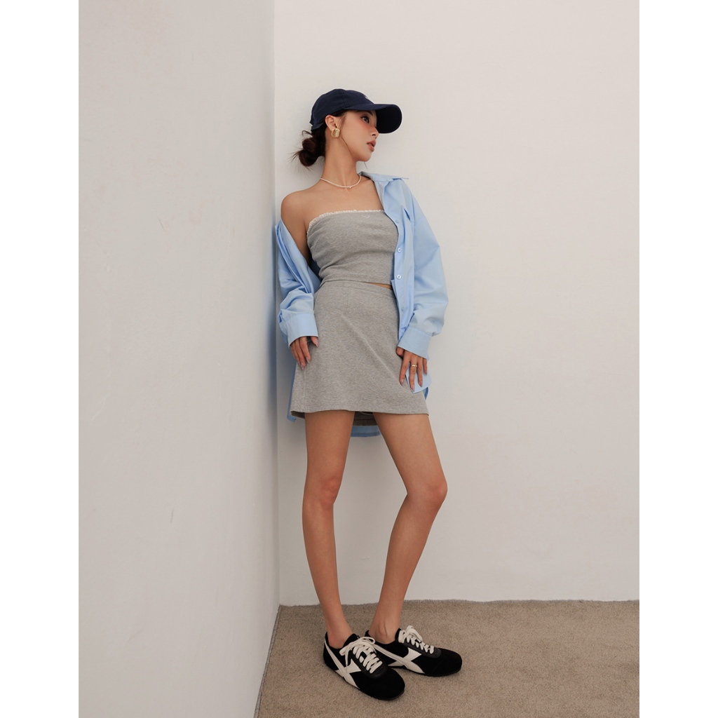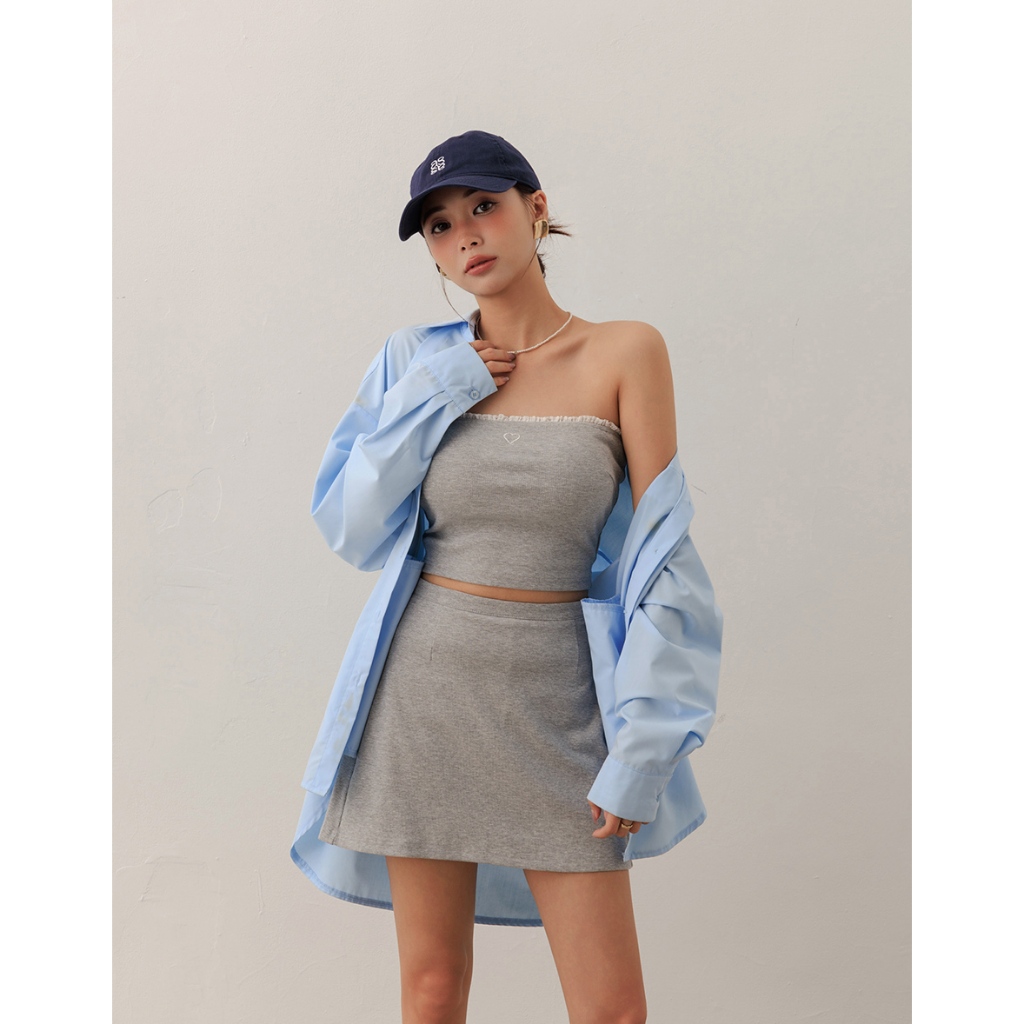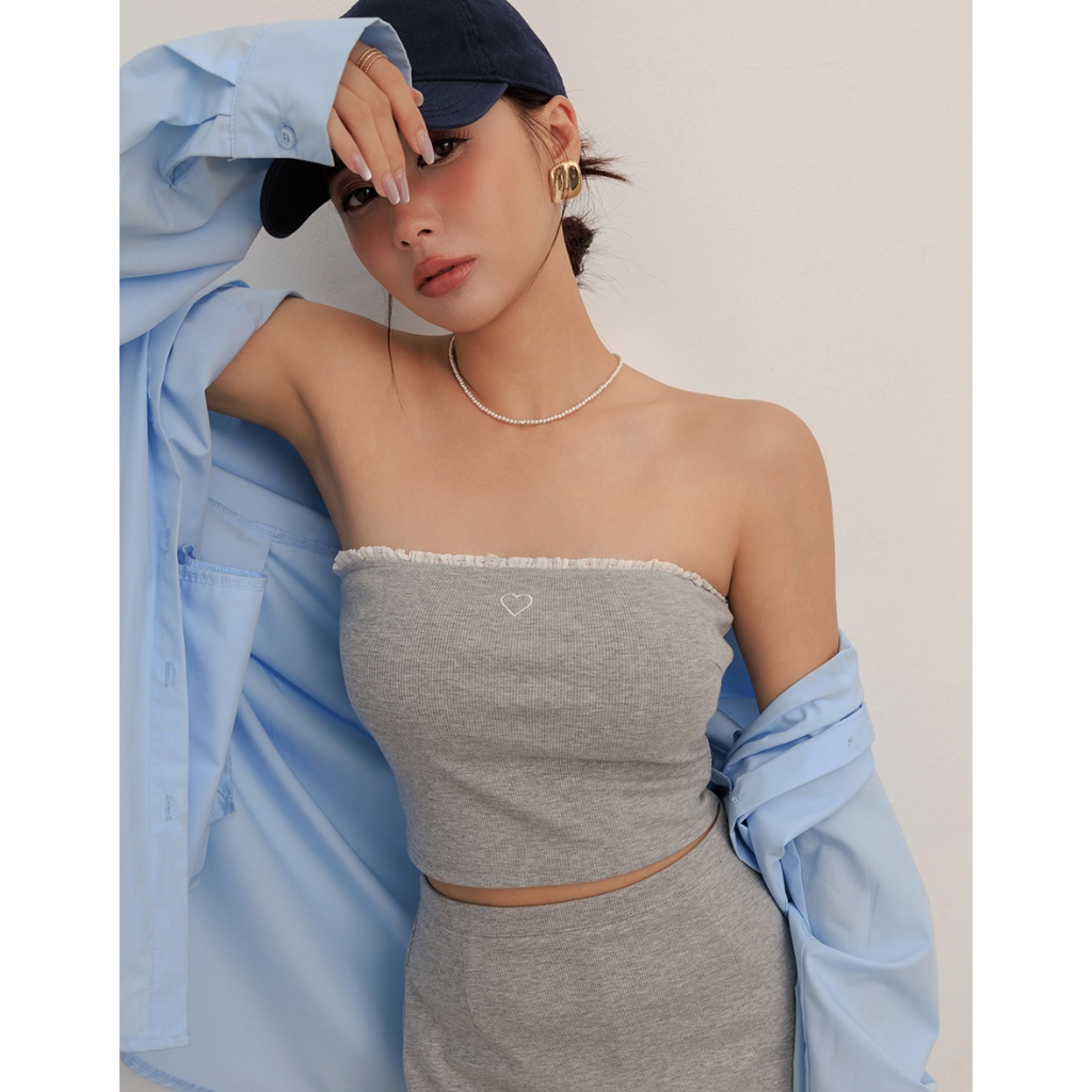 AIR SPACE LADY 小花邊愛心刺繡羅紋平口上衣短裙套裝(附胸墊)(黑/淺灰) 女裝 現貨黑,S|黑,M|黑,L|淺灰,S|淺灰,M|淺灰,LIndividual SetsAIR SPACE