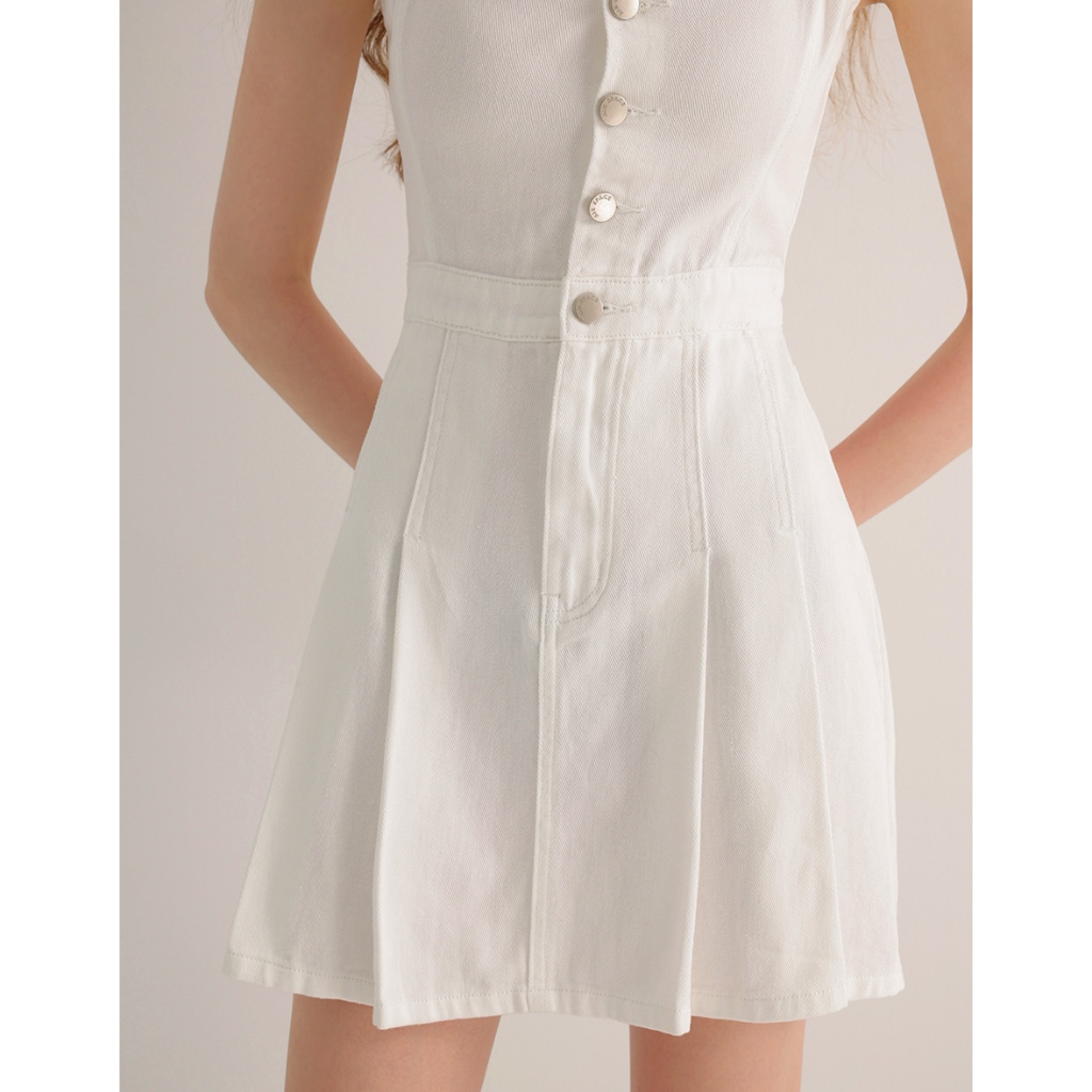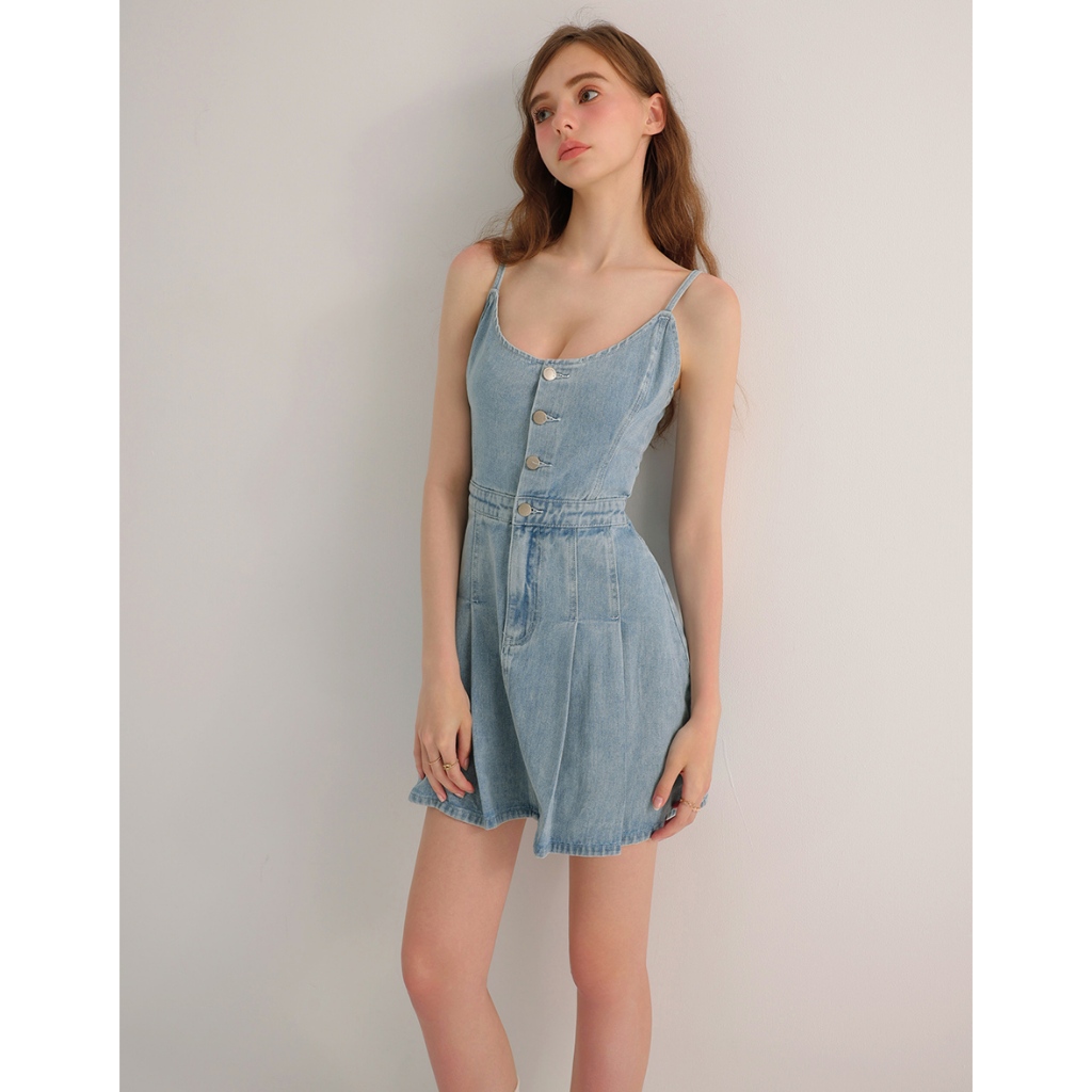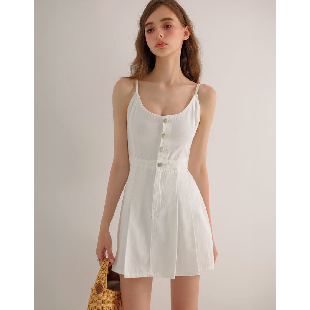 AIR SPACE 前打褶金屬釦細肩帶牛仔短洋裝(白/淺藍) 女裝 現貨白,S|白,M|白,L|淺藍,S|淺藍,M|淺藍,LAIR SPACE
