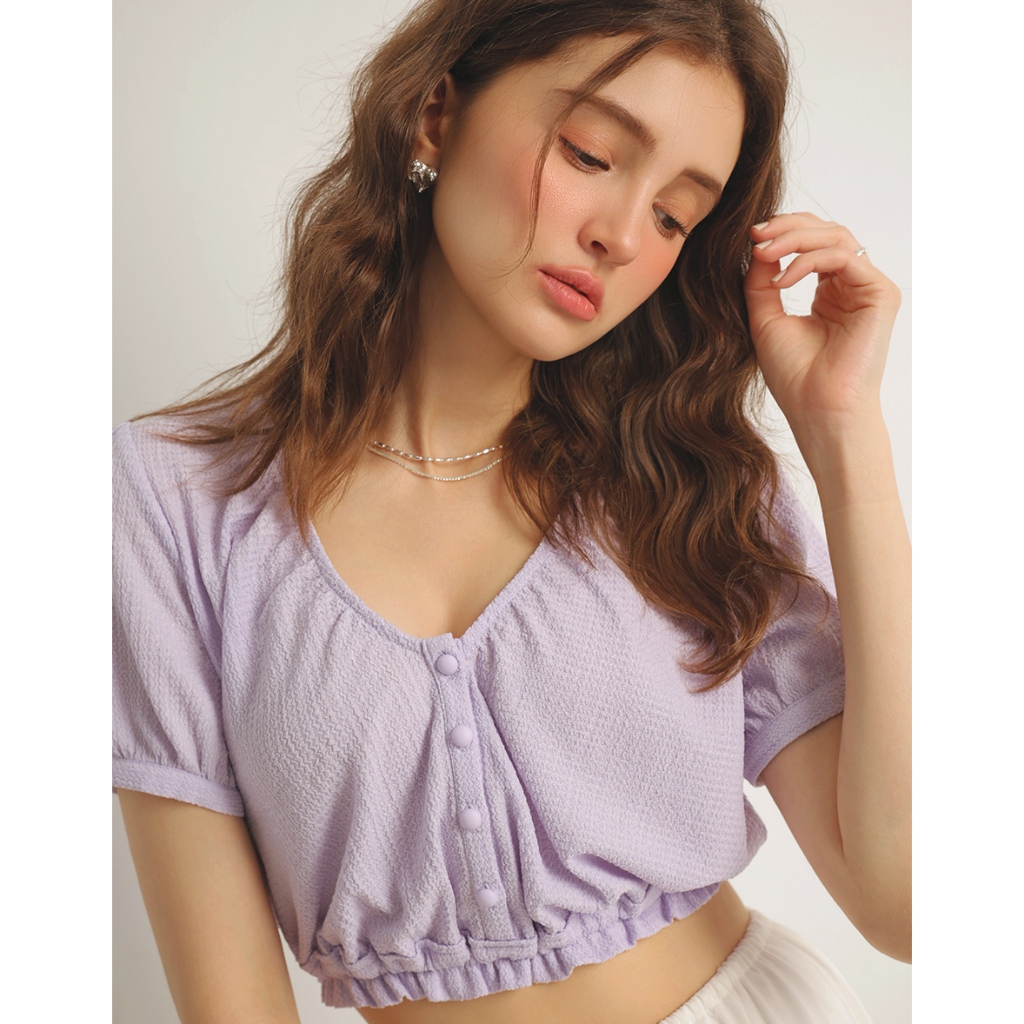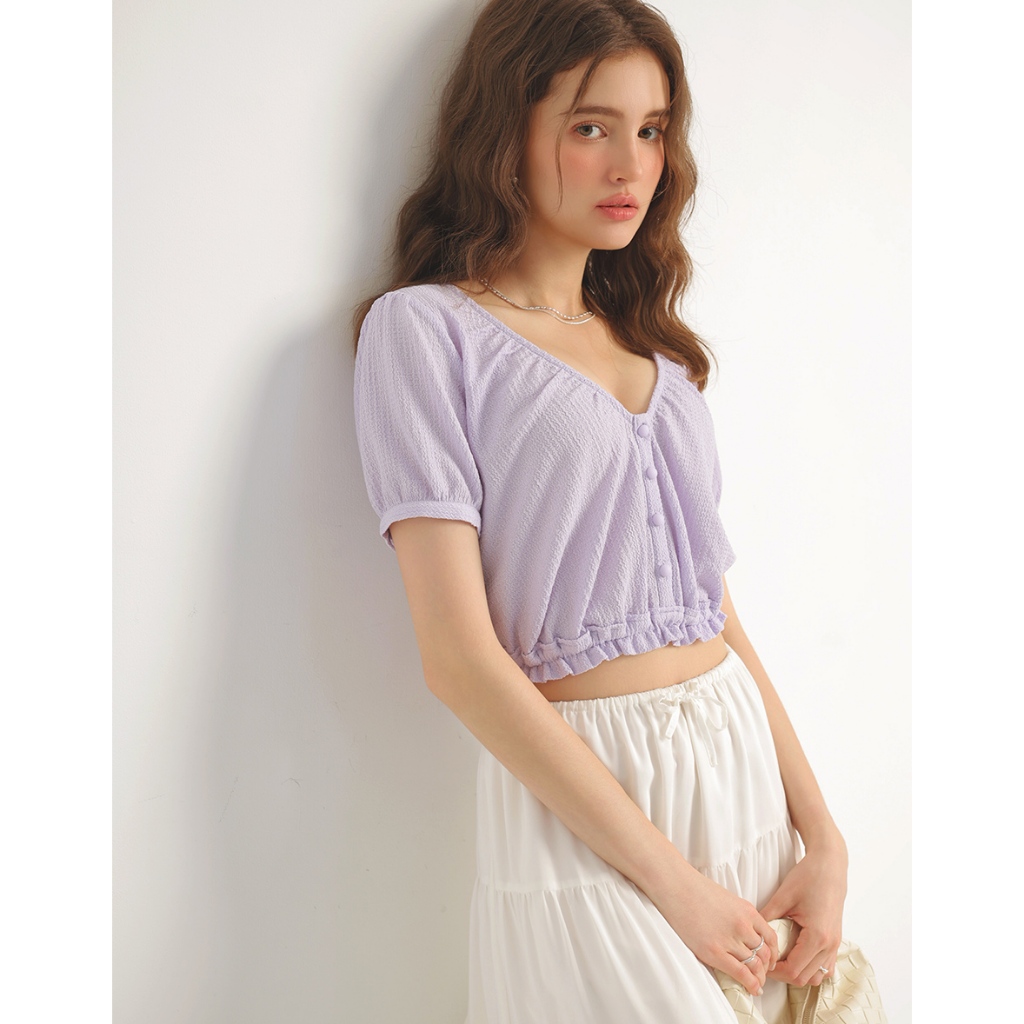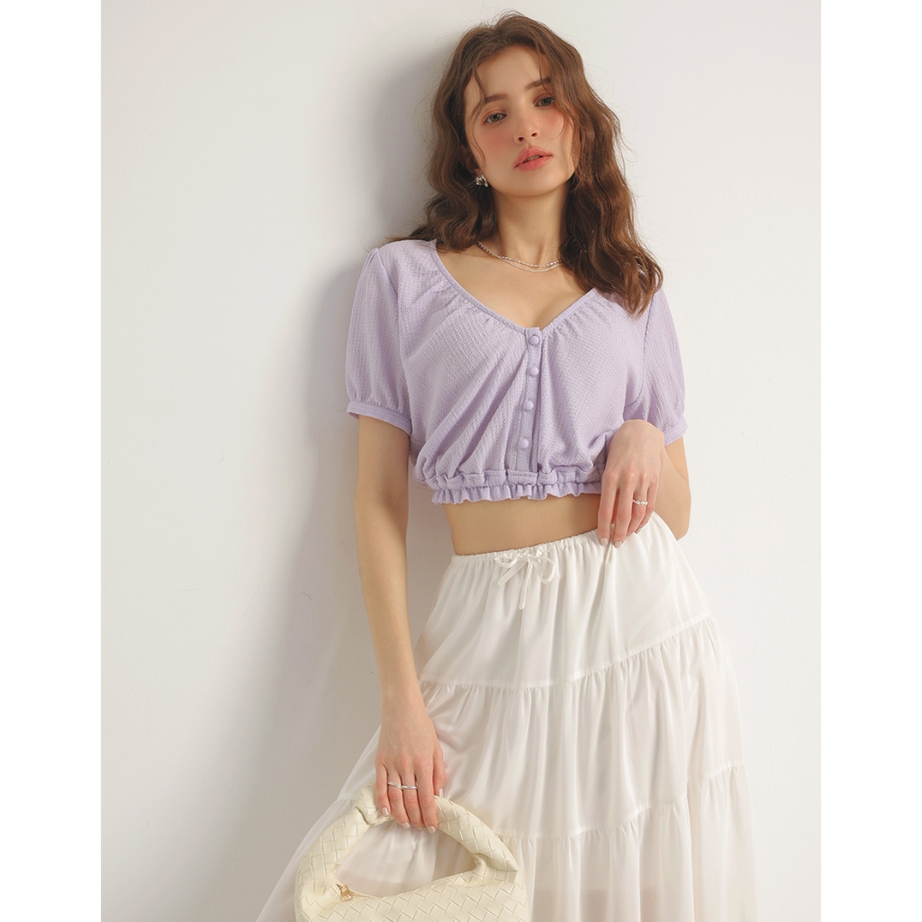 AIR SPACE V領荷葉邊收腰短版上衣(白/紫) 女裝 現貨白,S|白,M|白,L|紫,S|紫,M|紫,LOthersAIR SPACE