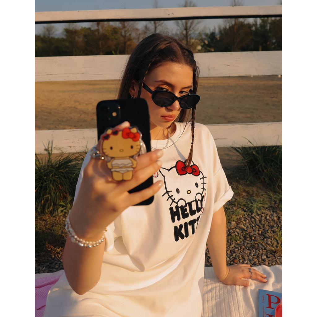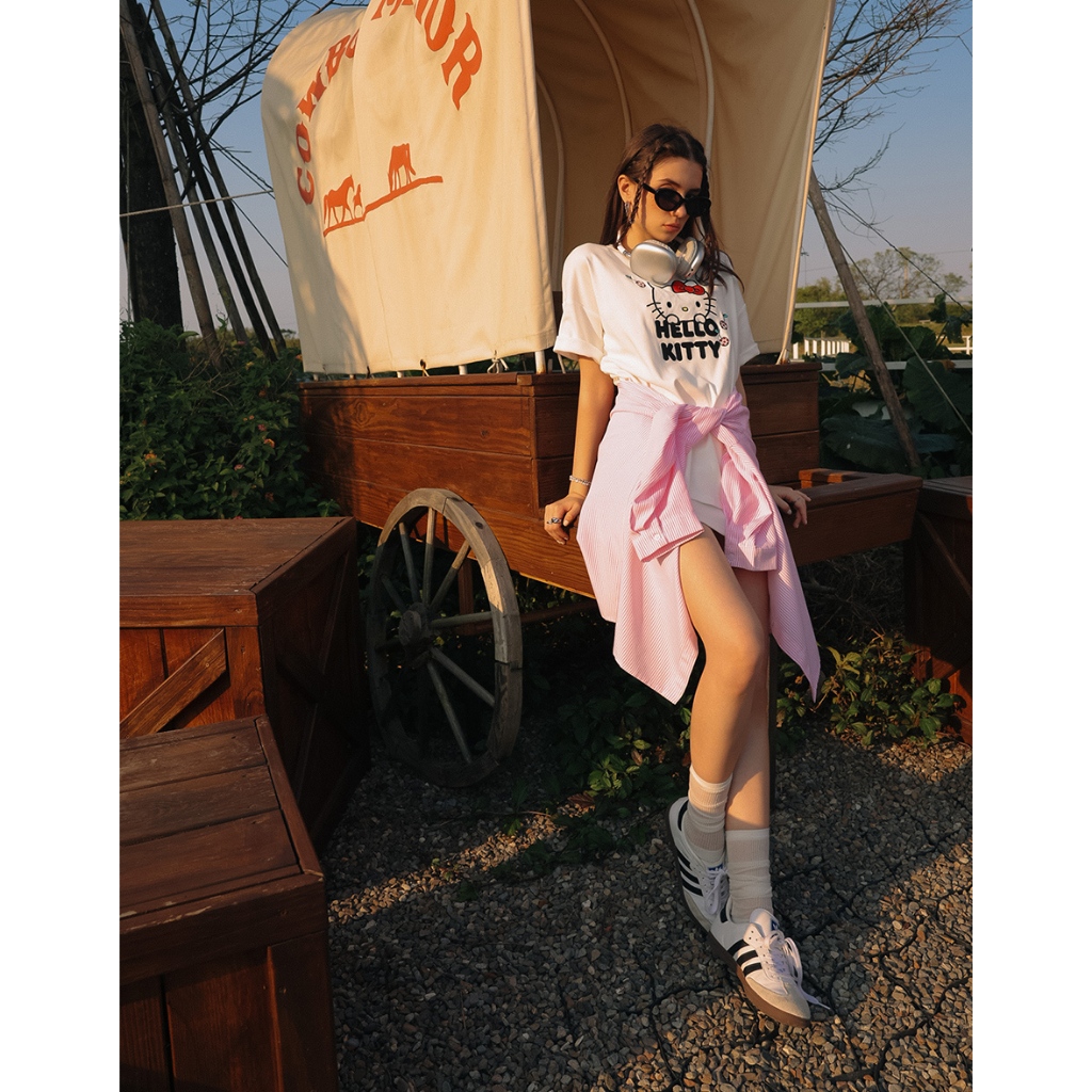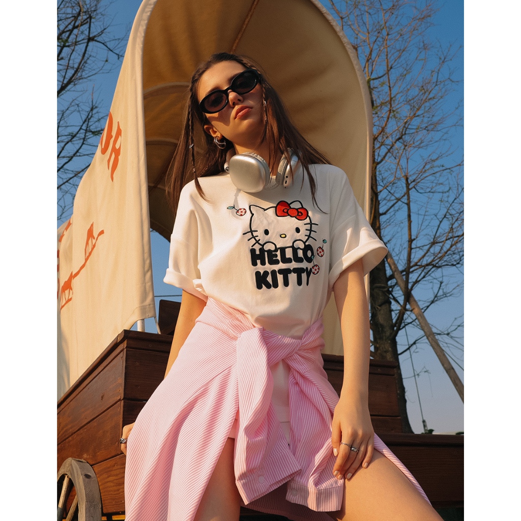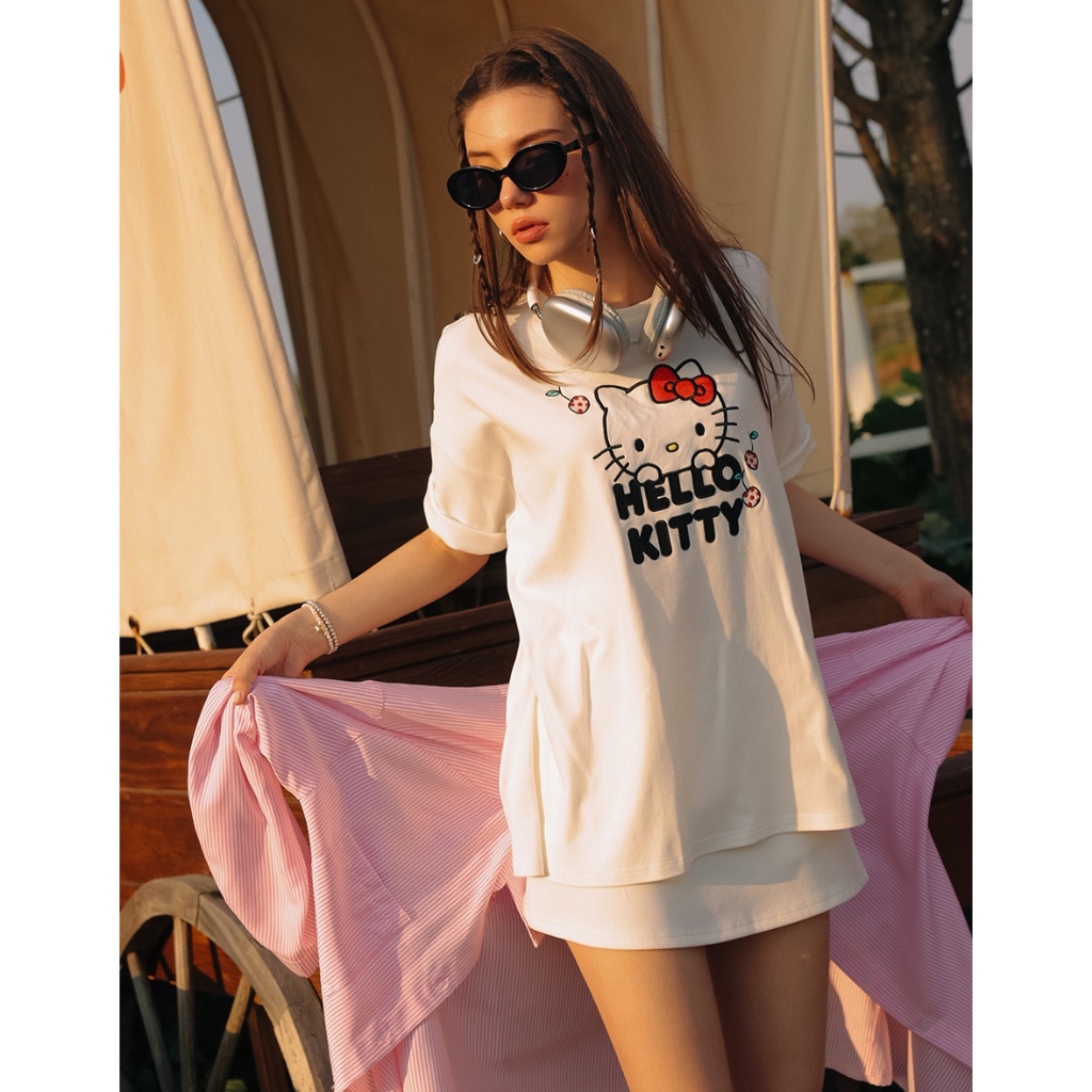AIR SPACE PLUS 【Hello Kitty聯名】刺繡貼布圖案寬版TEE(白) 女裝 現貨 大尺碼 中大尺碼白,FFT-shirtsAIR SPACE