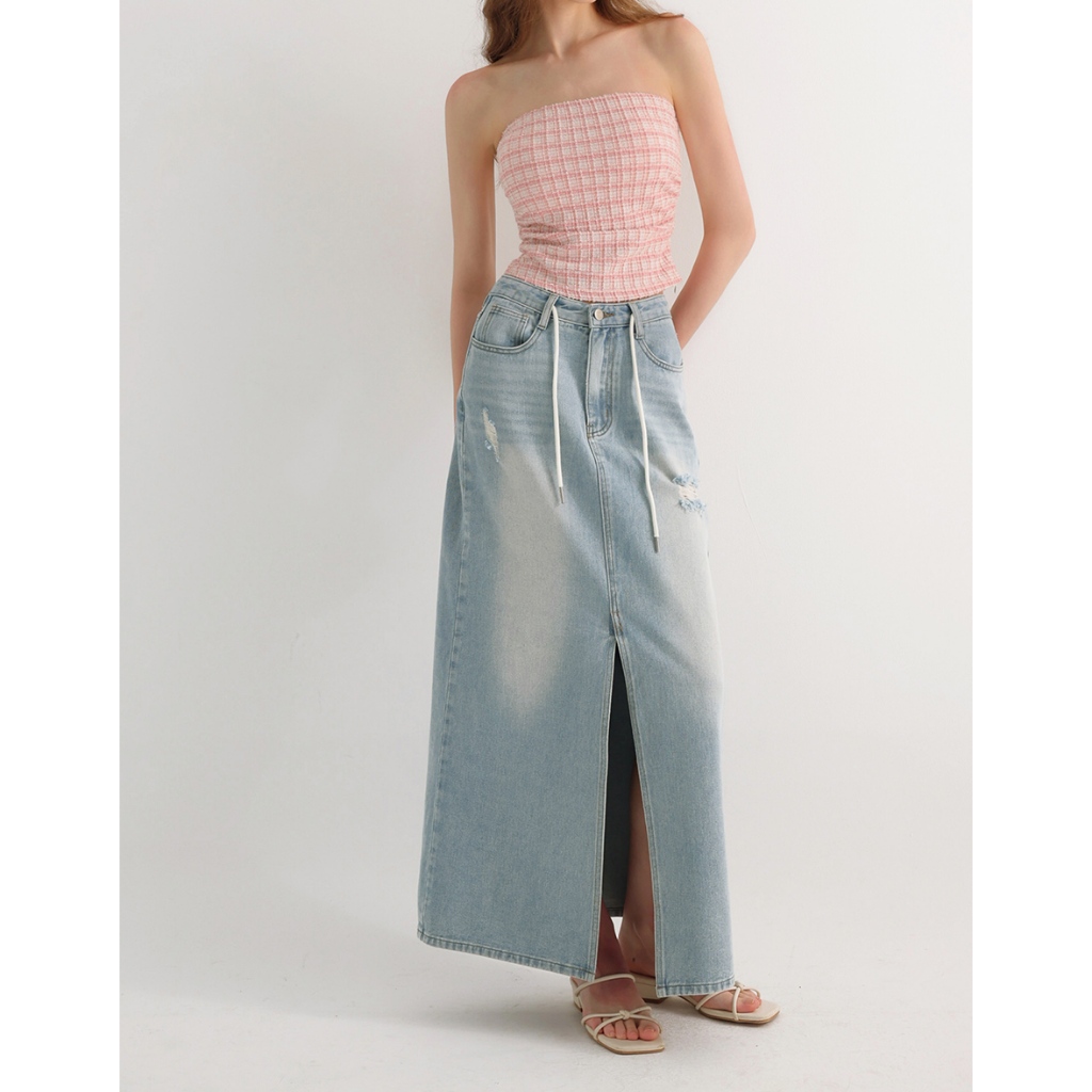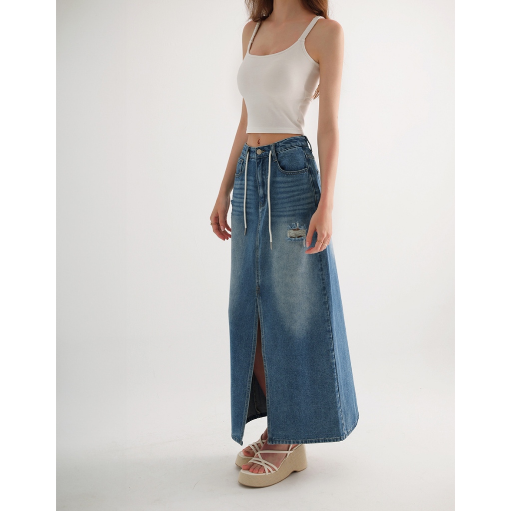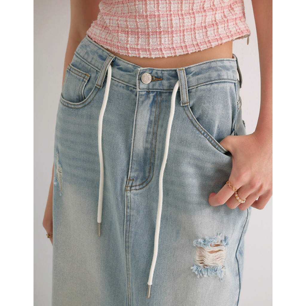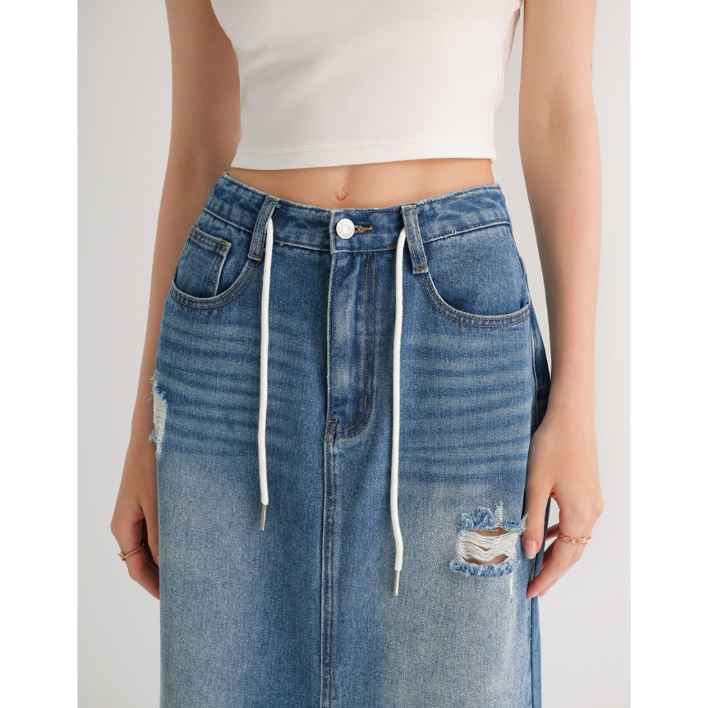 AIR SPACE 古著風刷破前開岔抽繩牛仔長裙(藍/淺藍) 女裝 現貨藍,S|藍,M|藍,L|淺藍,S|淺藍,M|淺藍,LAIR SPACE