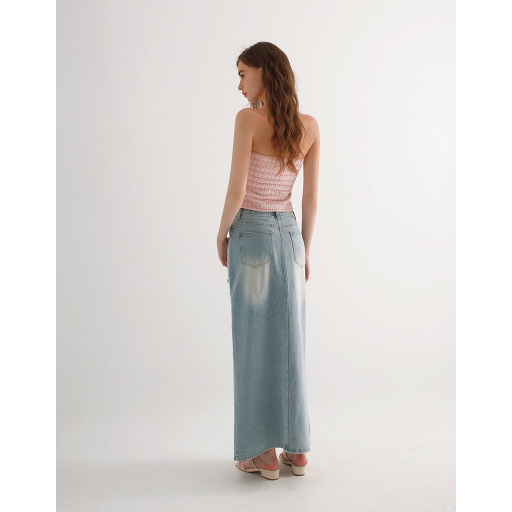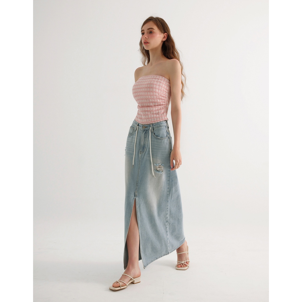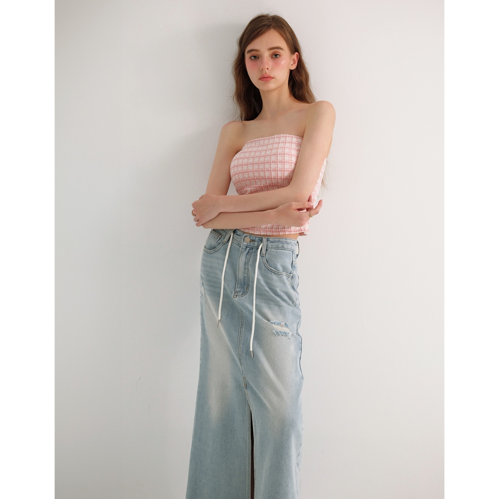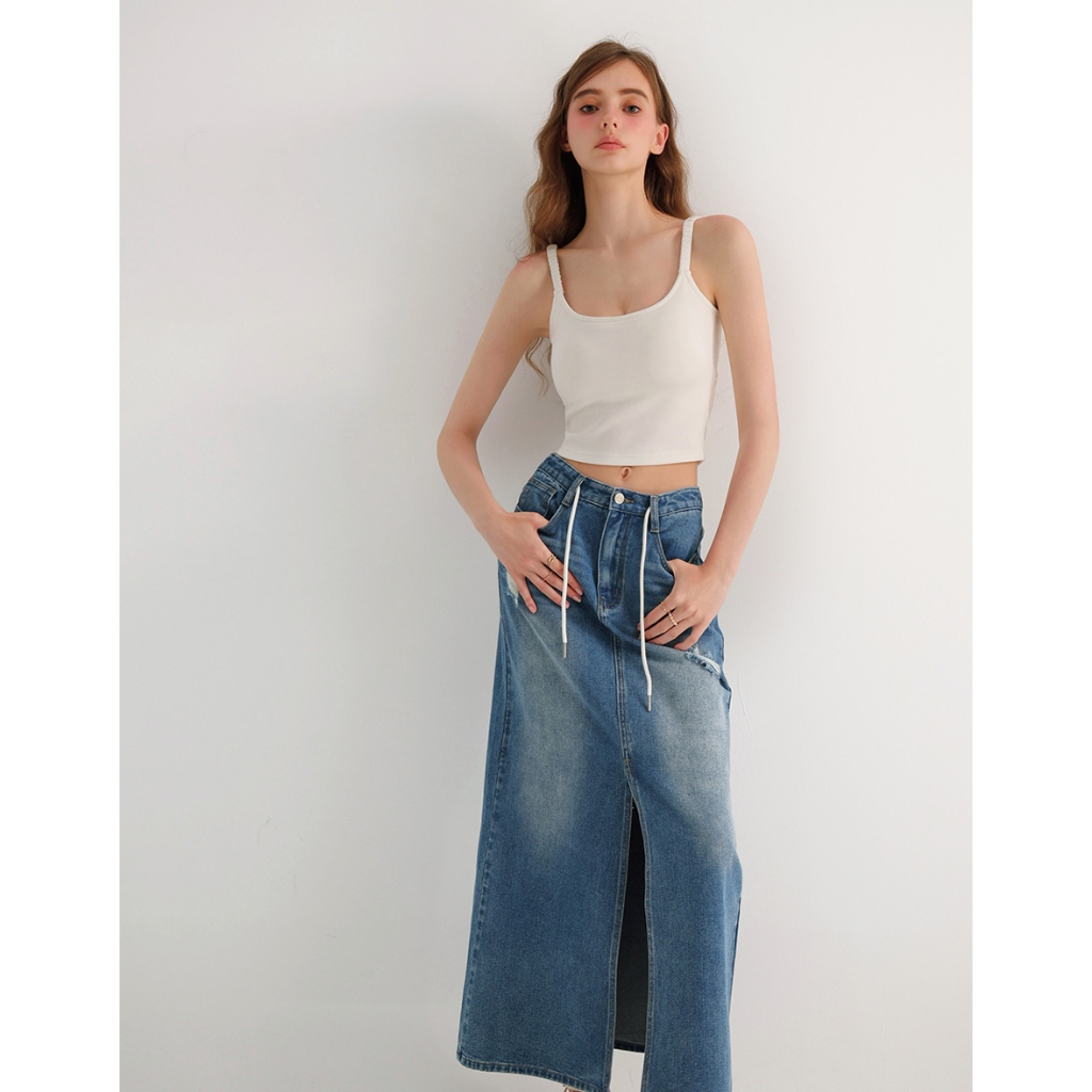 AIR SPACE 古著風刷破前開岔抽繩牛仔長裙(藍/淺藍) 女裝 現貨藍,S|藍,M|藍,L|淺藍,S|淺藍,M|淺藍,LAIR SPACE