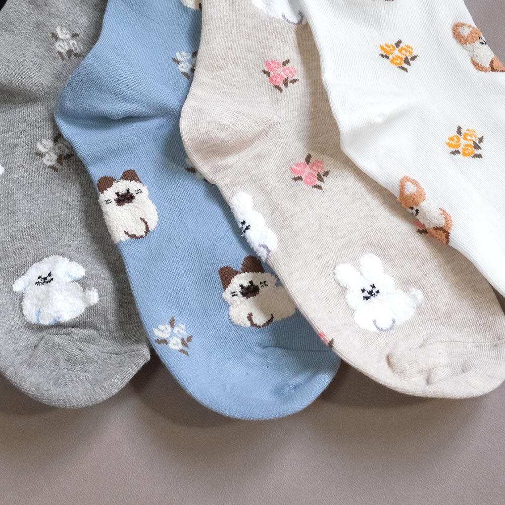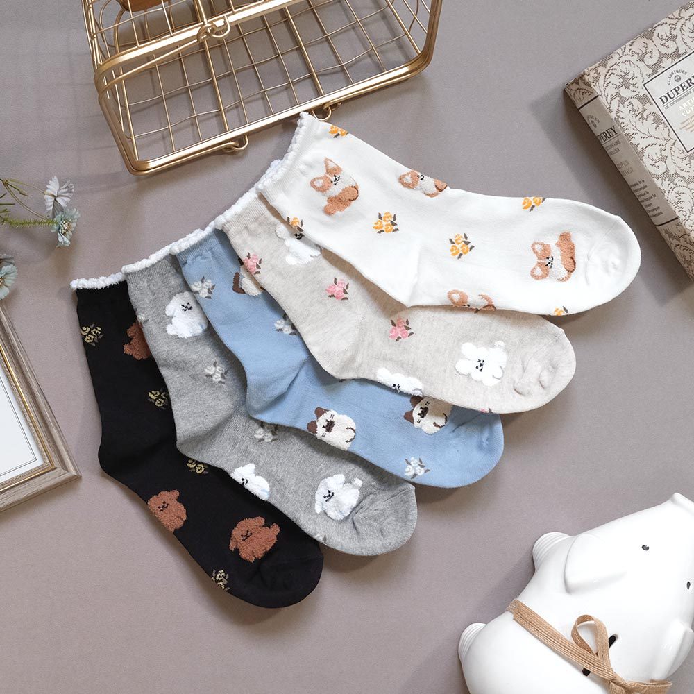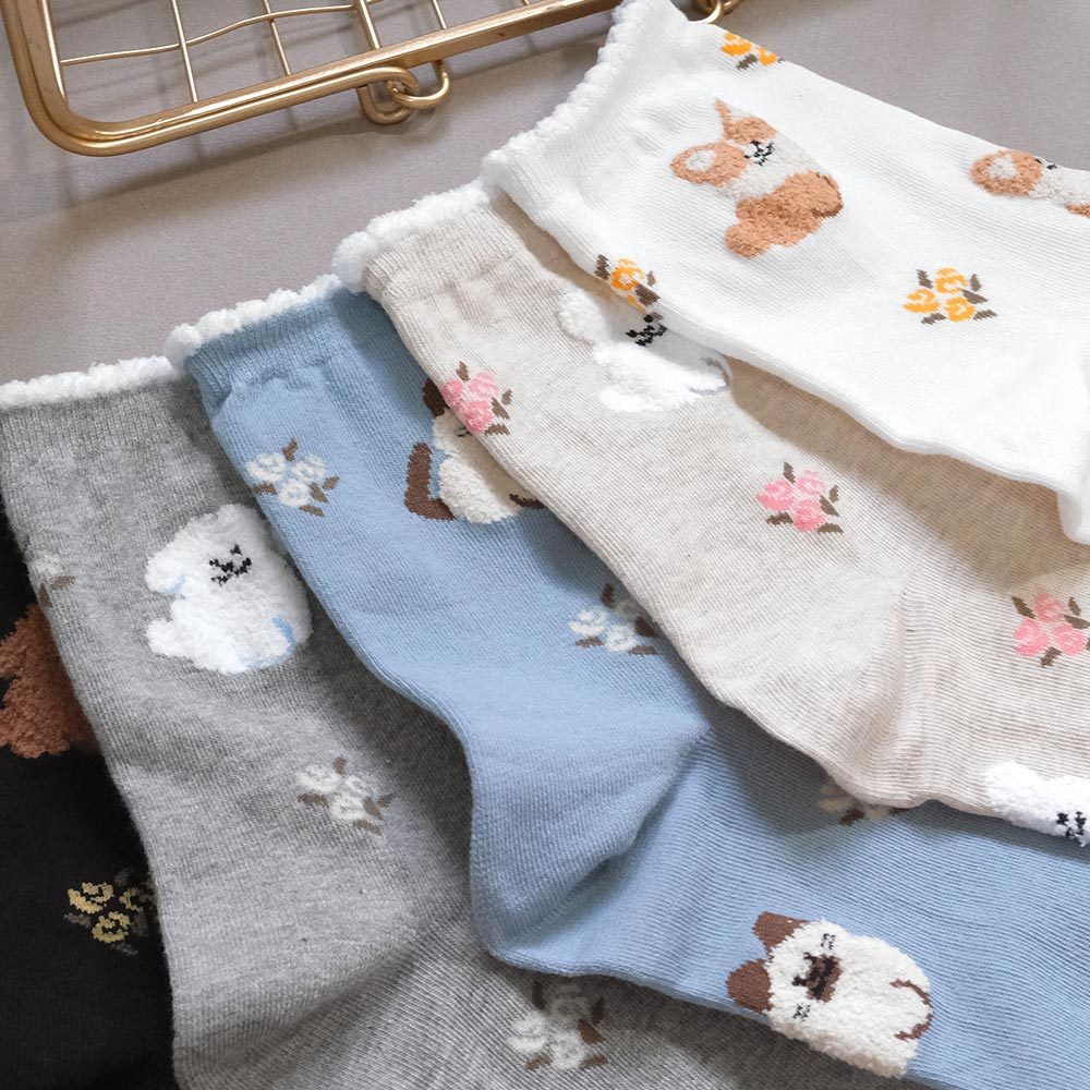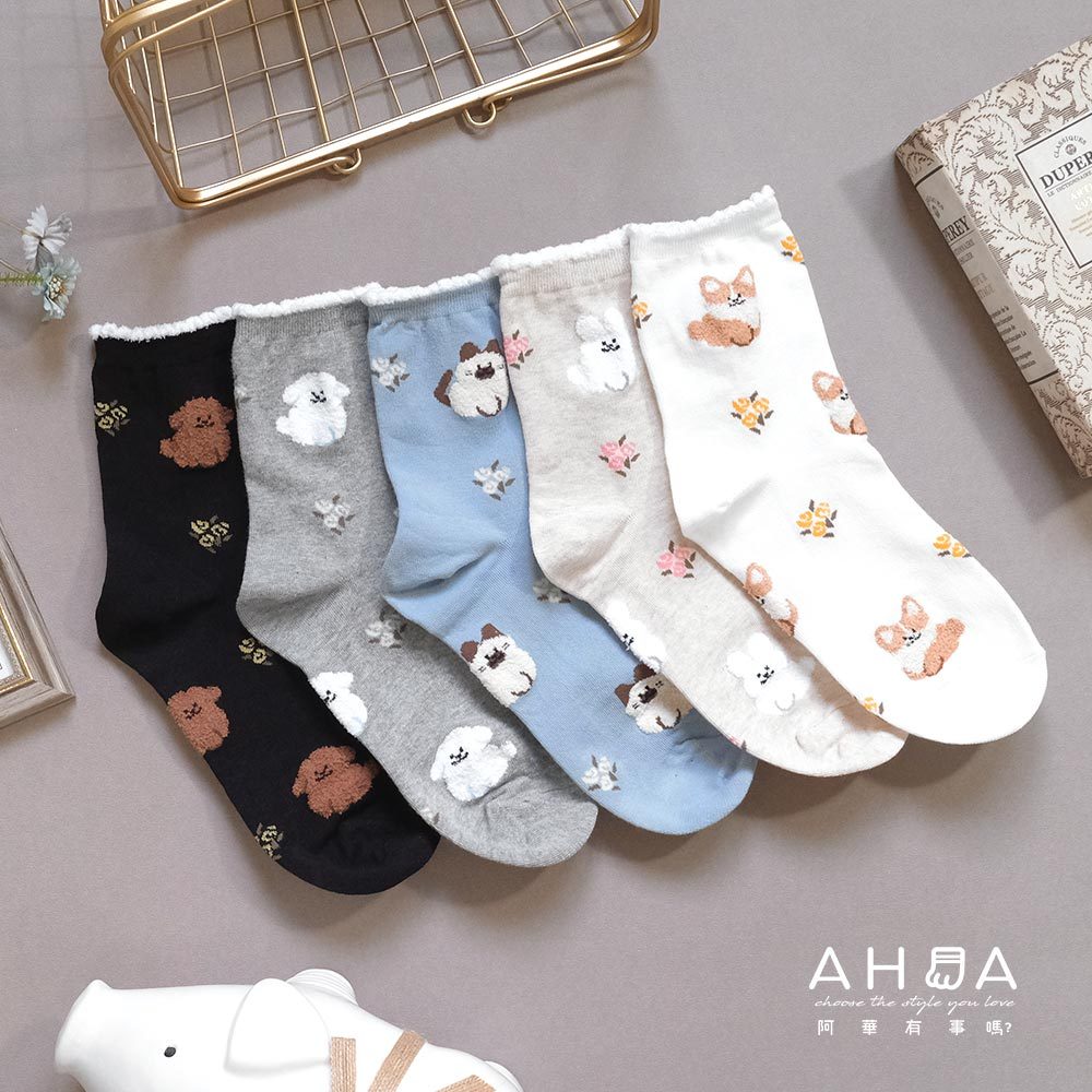 AHUA阿華有事嗎 立體毛毛滿版貓狗玫瑰花邊中筒襪 K2143 正韓襪子 百搭純棉襪 韓妞必備 少女襪白底|米白底|藍底|灰底|黑底SocksAHUA 韓國襪子品牌旗艦店