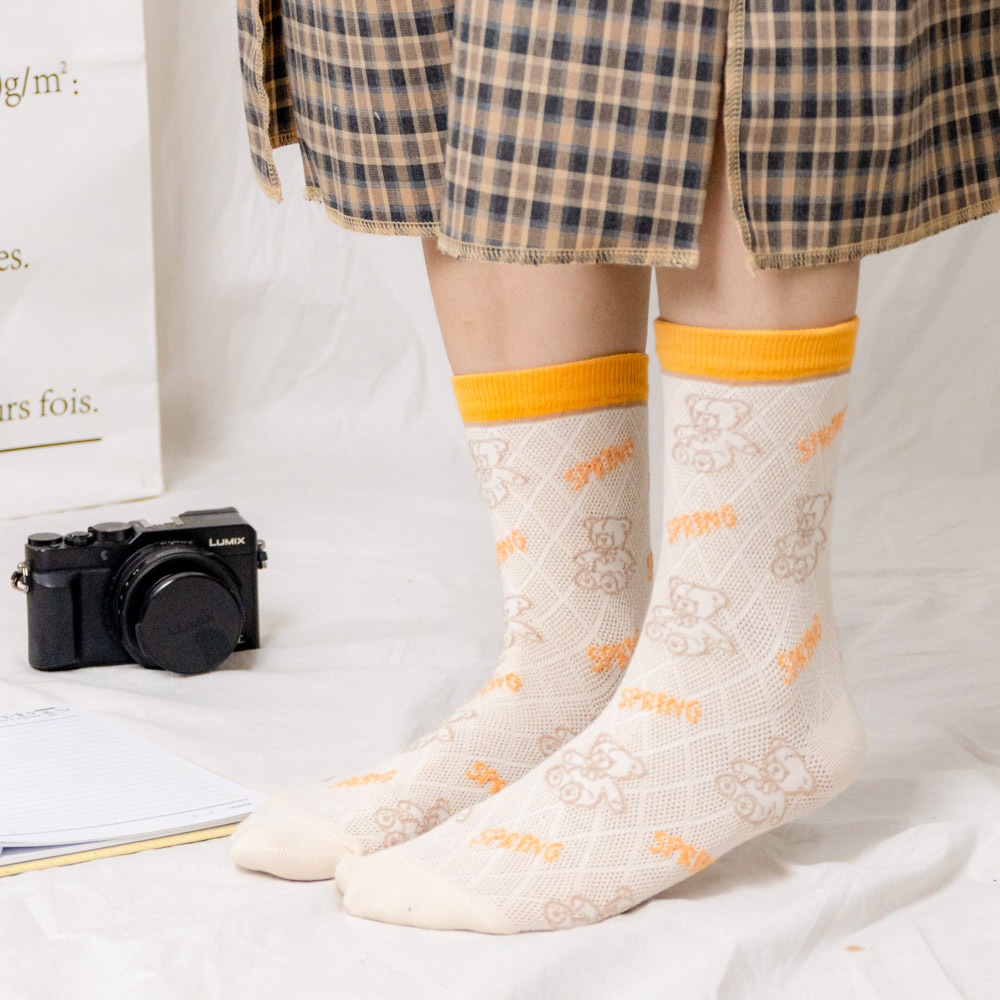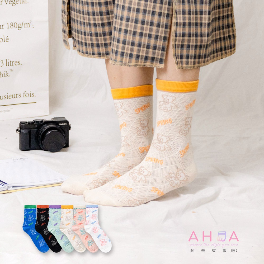 AHUA阿華有事嗎 韓國襪子 滿版菱格泰迪熊玩偶襪口拼色中筒襪 K1970 韓妞必備 百搭純棉襪 韓系 日系可愛米白底橘襪口|粉底米襪口|薄荷綠底紫襪口|深藍底綠襪口|黑底橘襪口|白底藍襪口SocksAHUA 韓國襪子品牌旗艦店