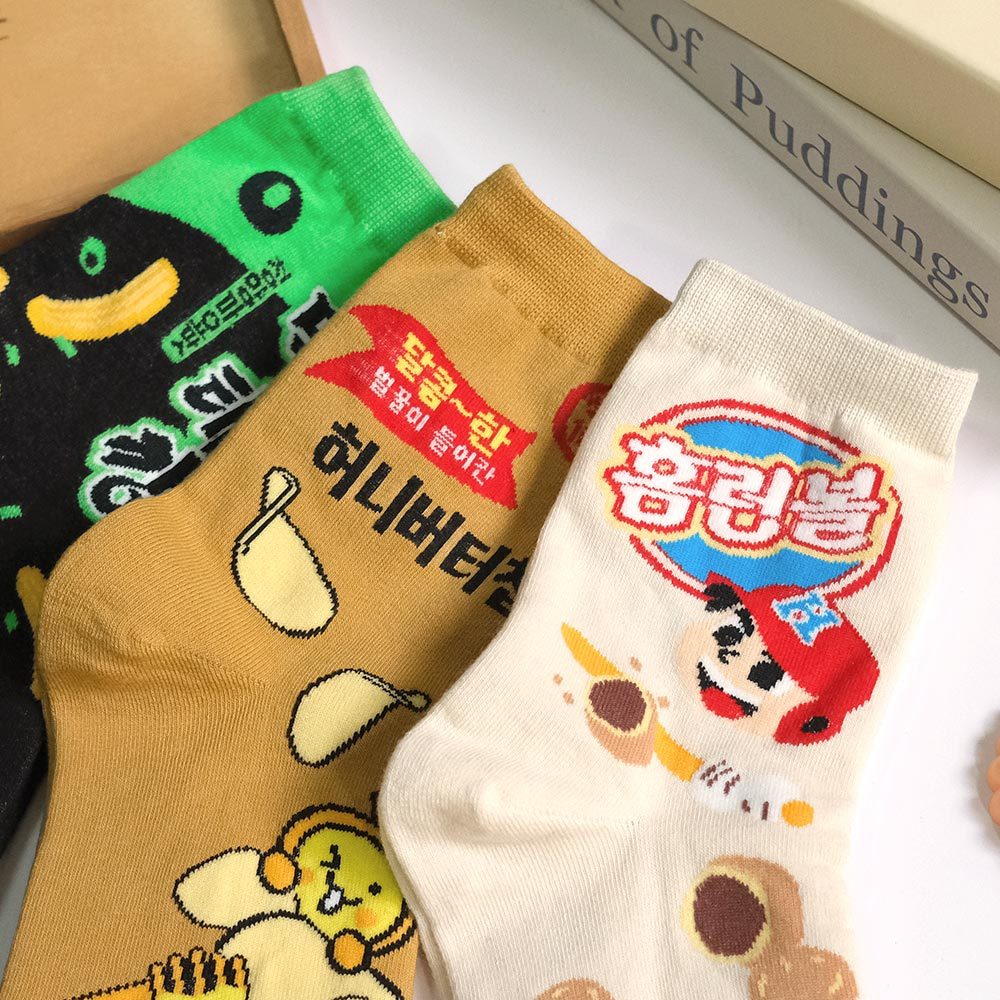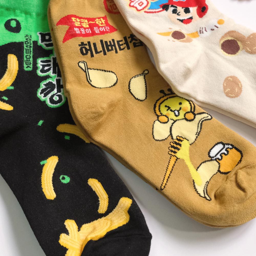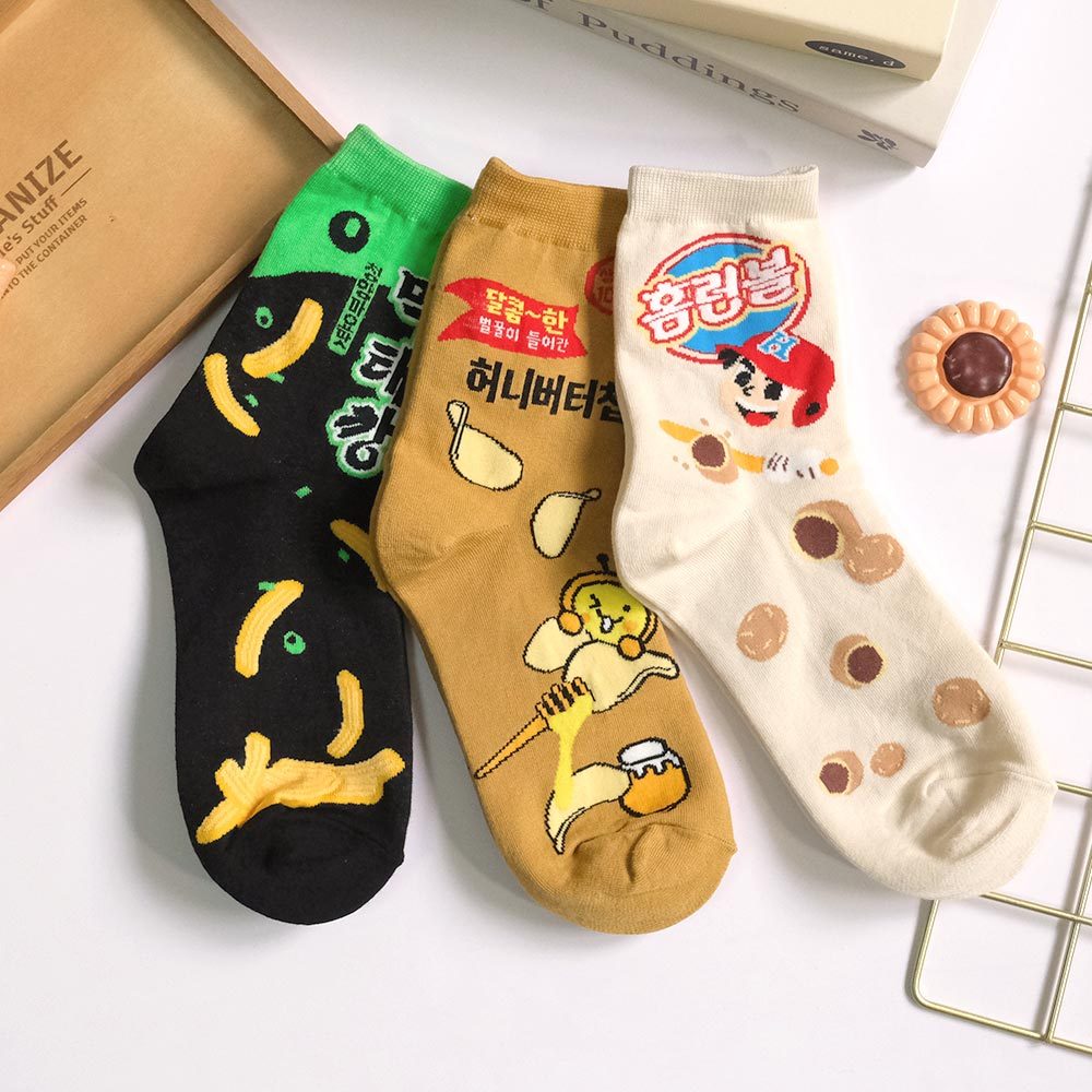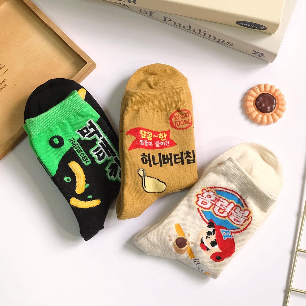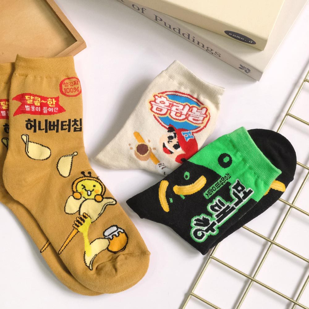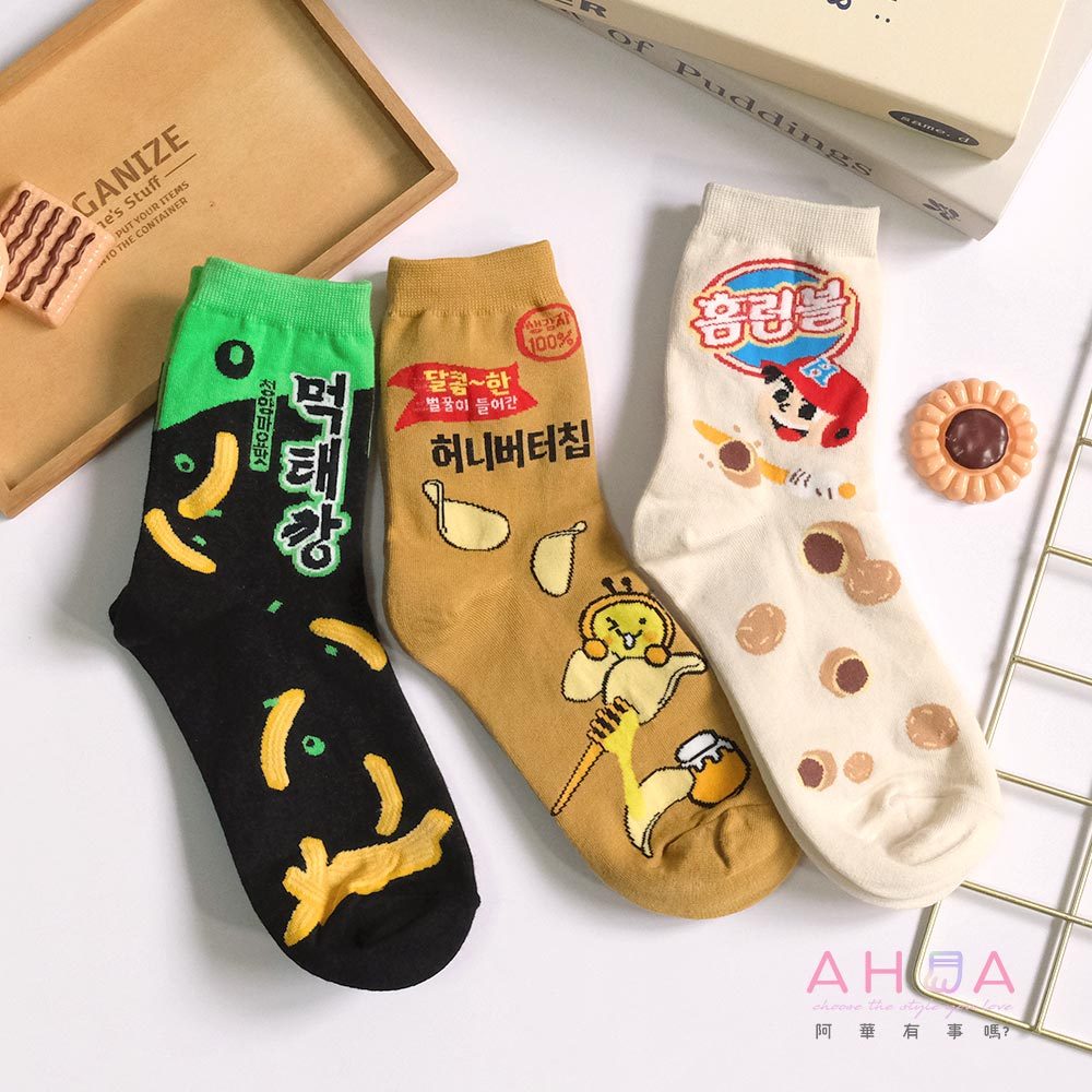 AHUA阿華有事嗎 韓國風味零嘴系列中筒襪 K2277 正韓襪子 百搭純棉襪 韓妞必備 少女襪米黃底夾心泡芙|薑黃底蜂蜜奶油洋芋片|黑底青陽辣椒脆魚條SocksAHUA 韓國襪子品牌旗艦店