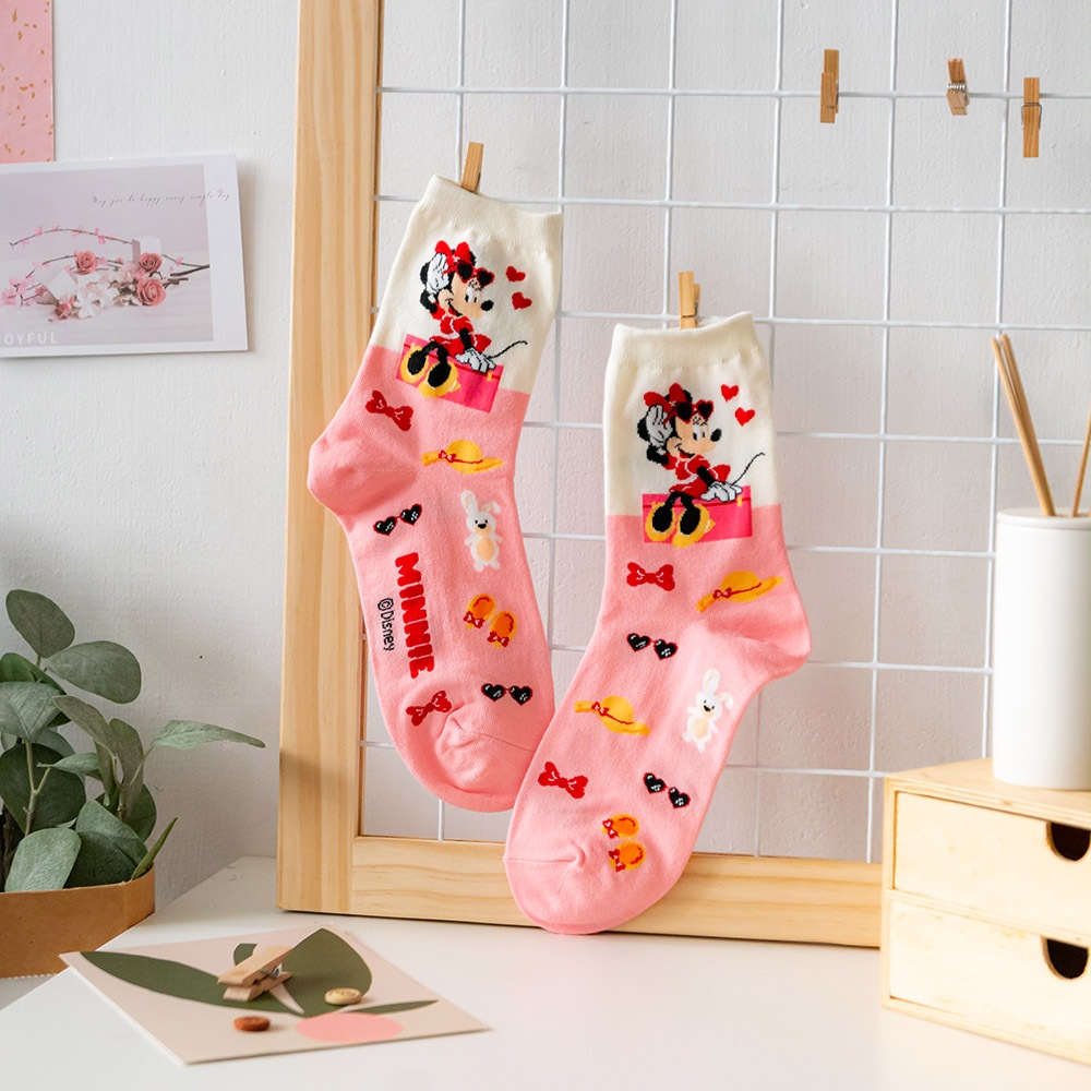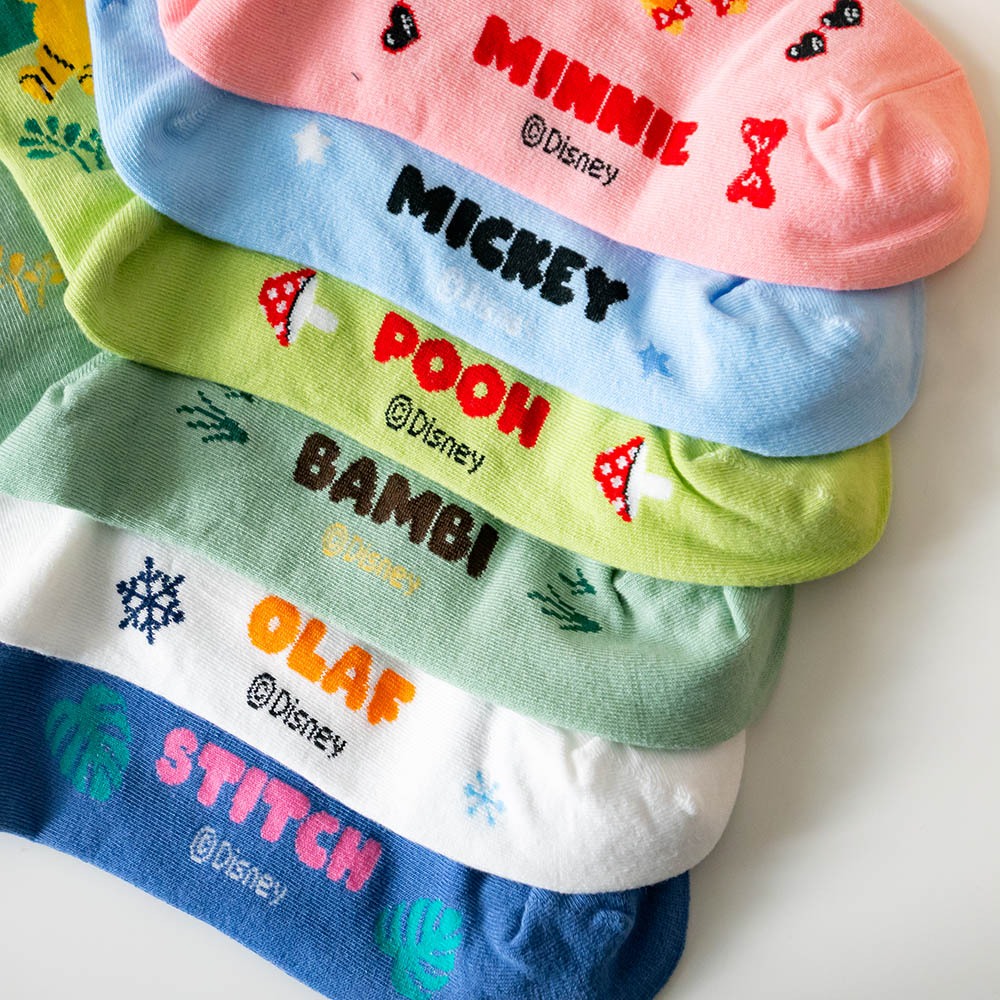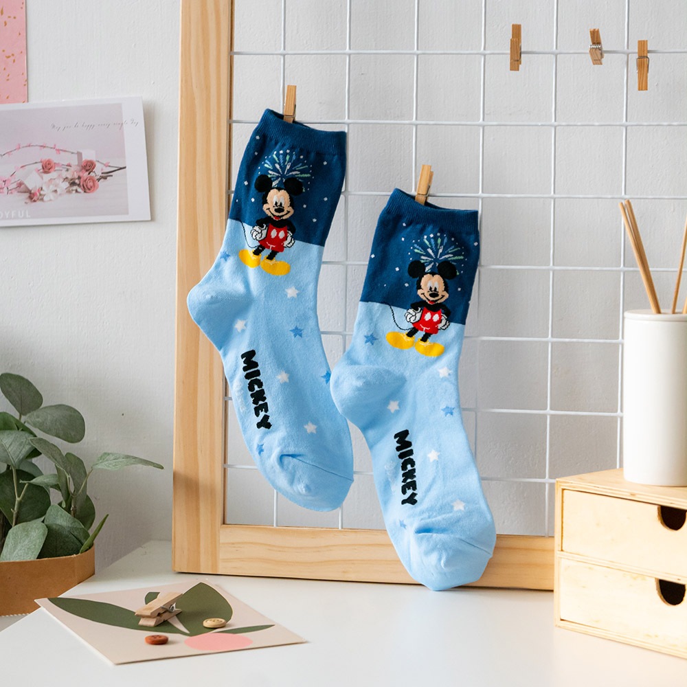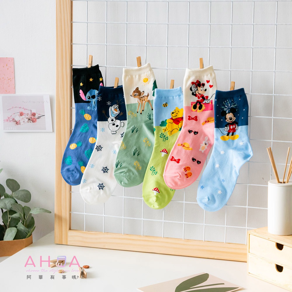 AHUA阿華有事嗎 韓國襪子 迪士尼襪口拼色情境中筒襪 K1907 韓妞必備 百搭純棉襪 正韓卡通授權淺藍底插腰米奇|粉底招手米妮|草綠底維尼|淺綠底小鹿斑比|白底開心雪寶|藍底史迪奇SocksAHUA 韓國襪子品牌旗艦店