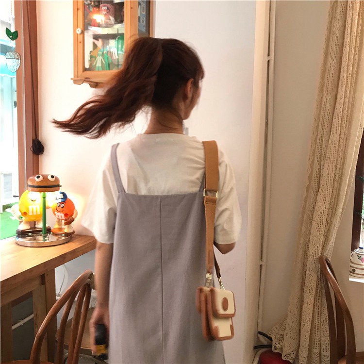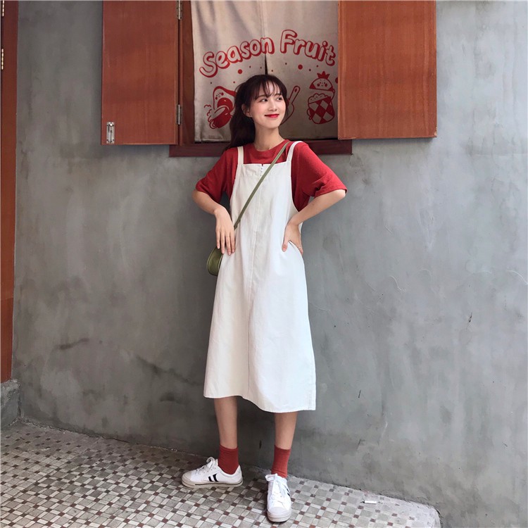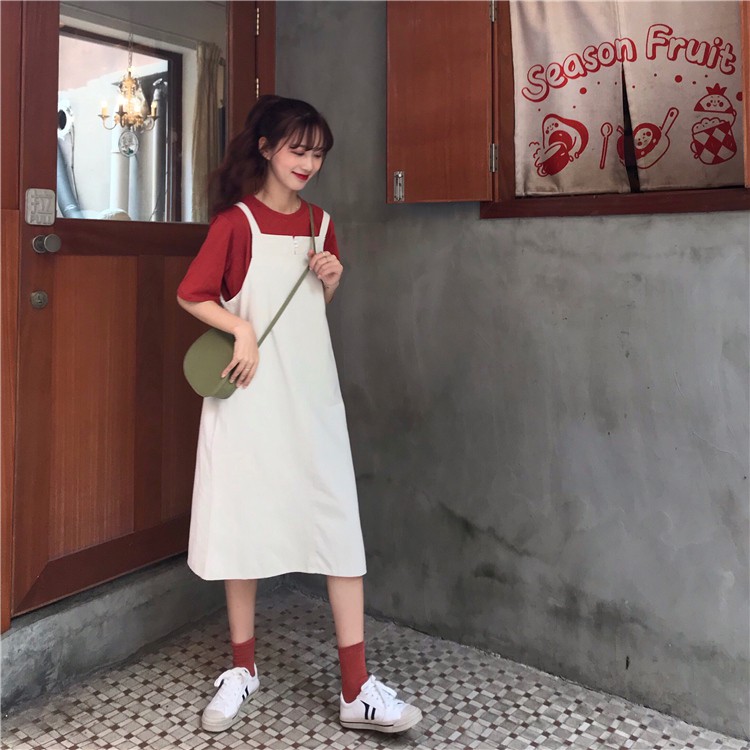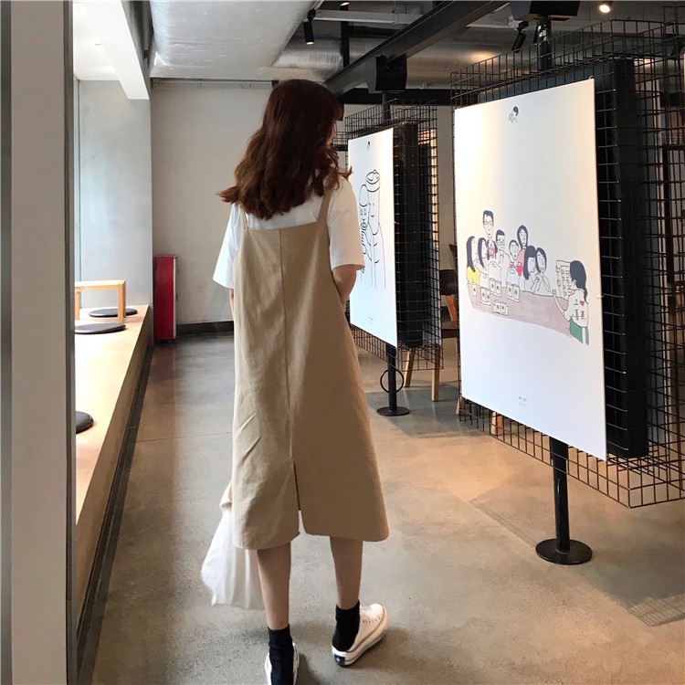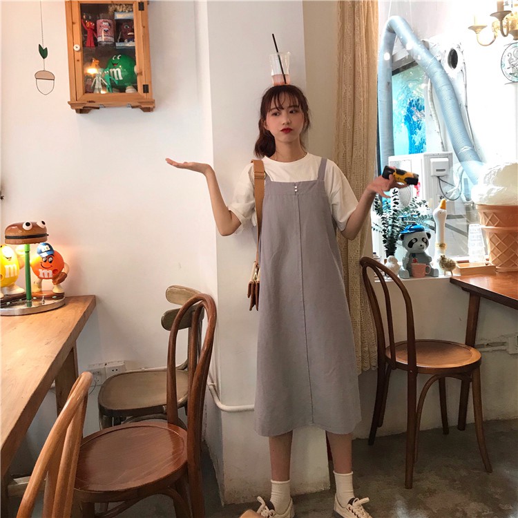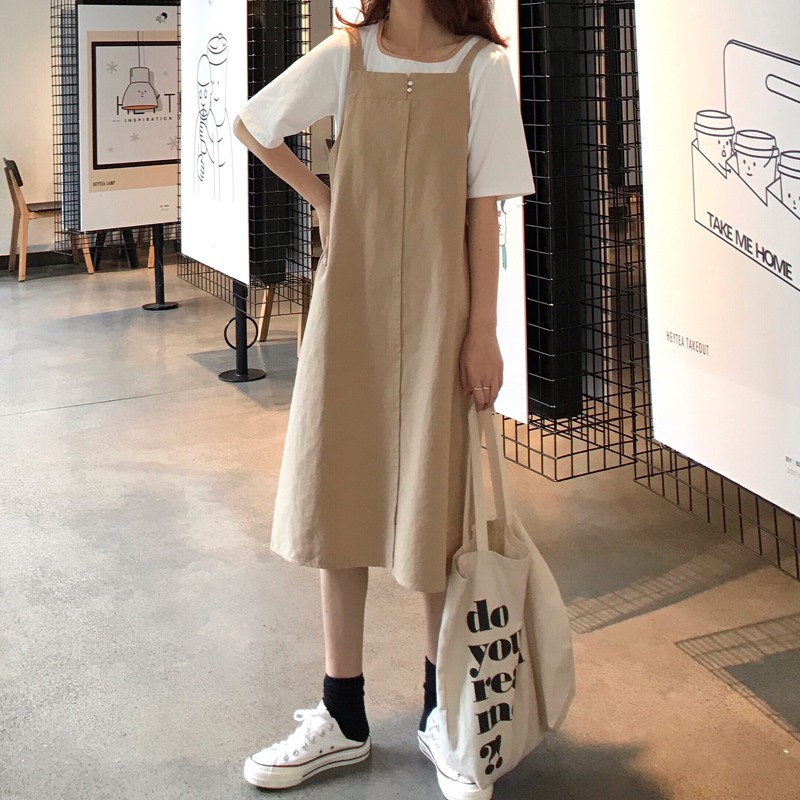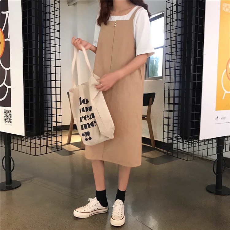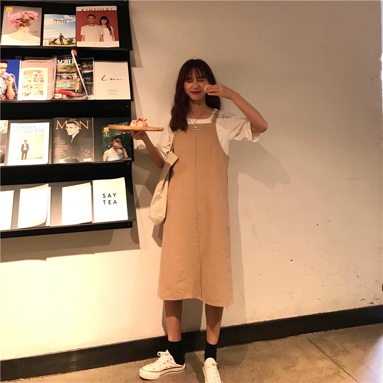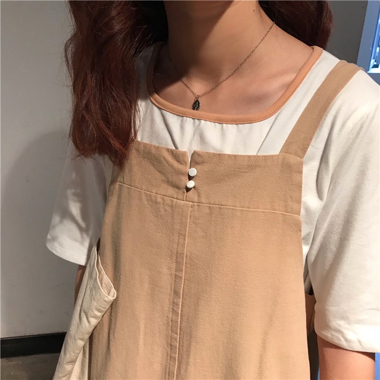 AHUA阿華有事嗎 韓系寬鬆百搭學生吊帶連衣裙 3色 C0679 四季百搭女裝 韓妞必備上衣 簡約短T【滿額免運】杏色|卡其色|灰色AHUA 韓國襪子品牌旗艦店