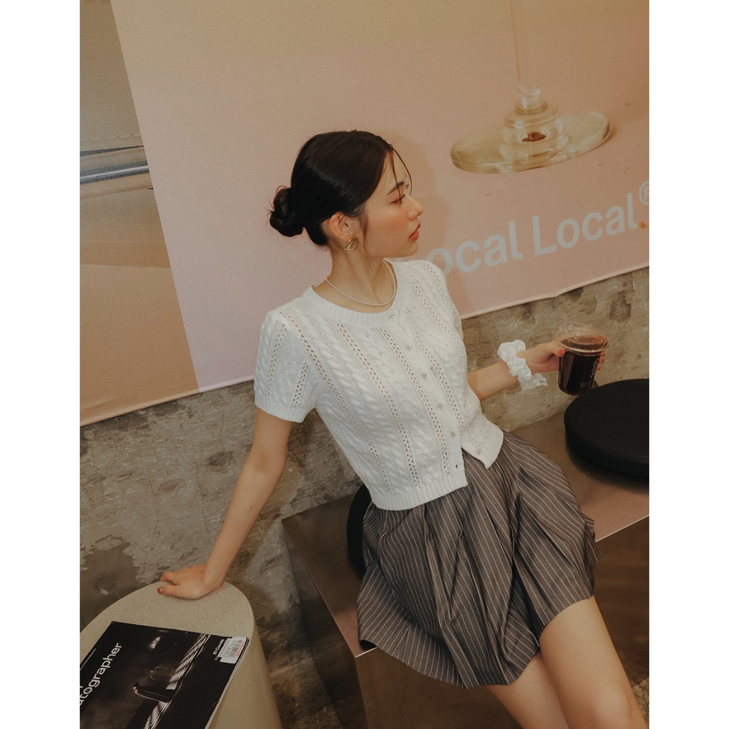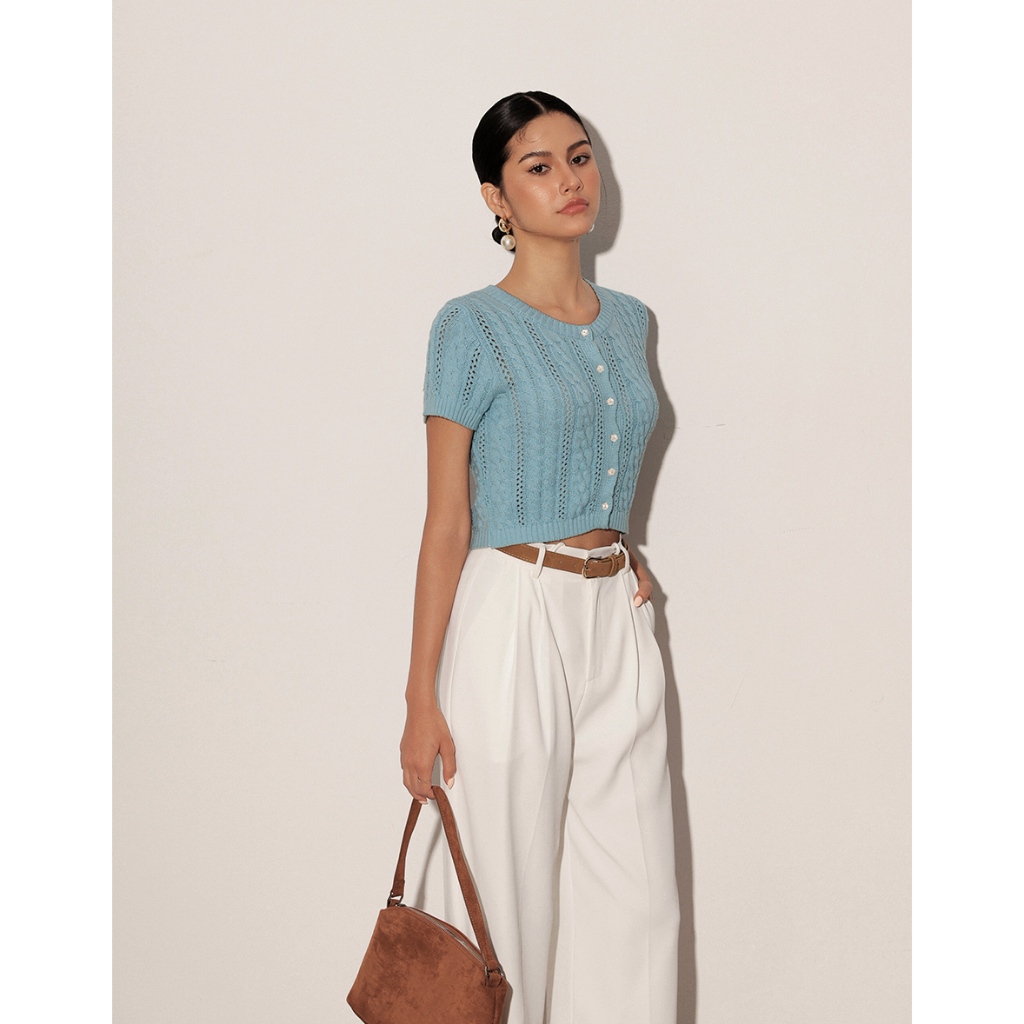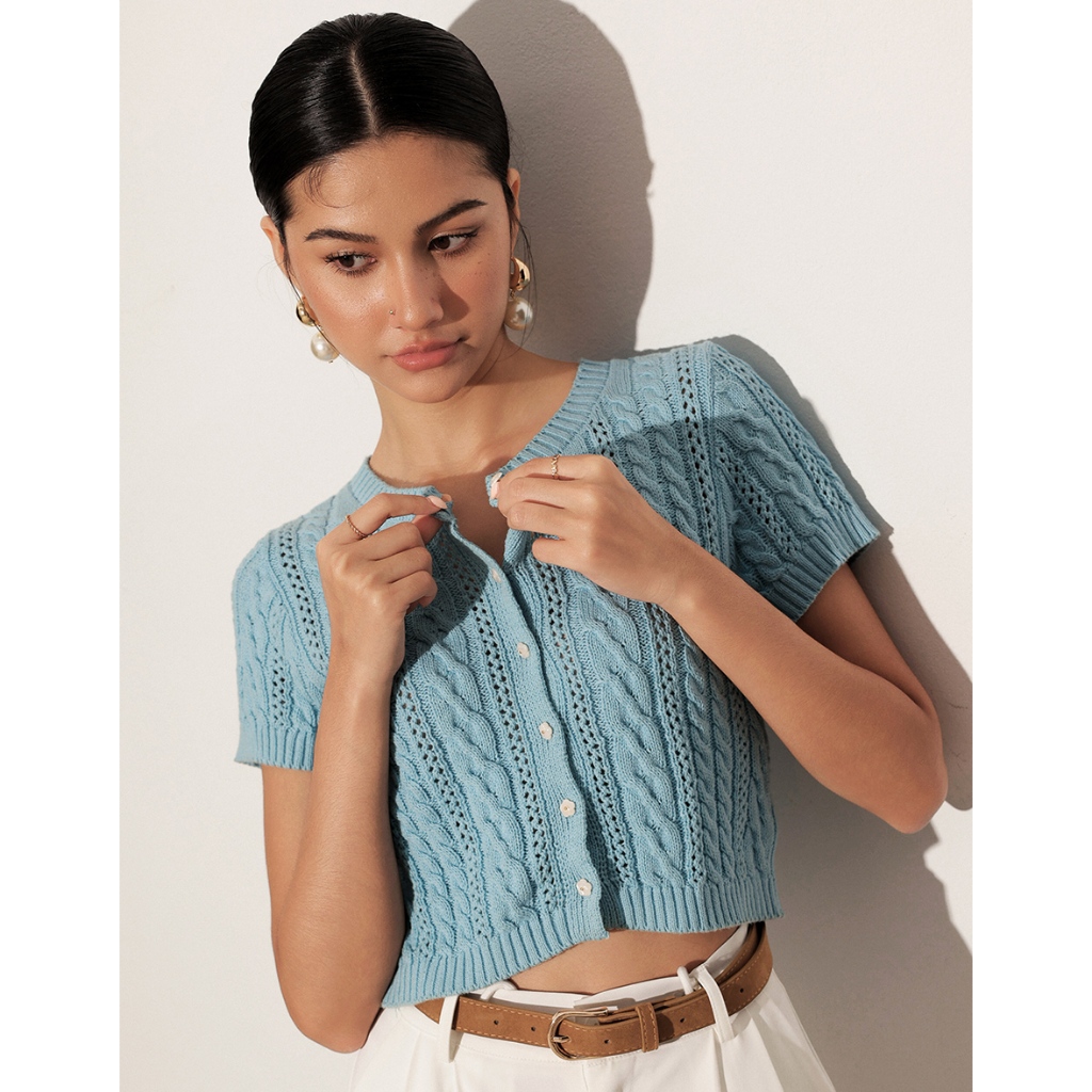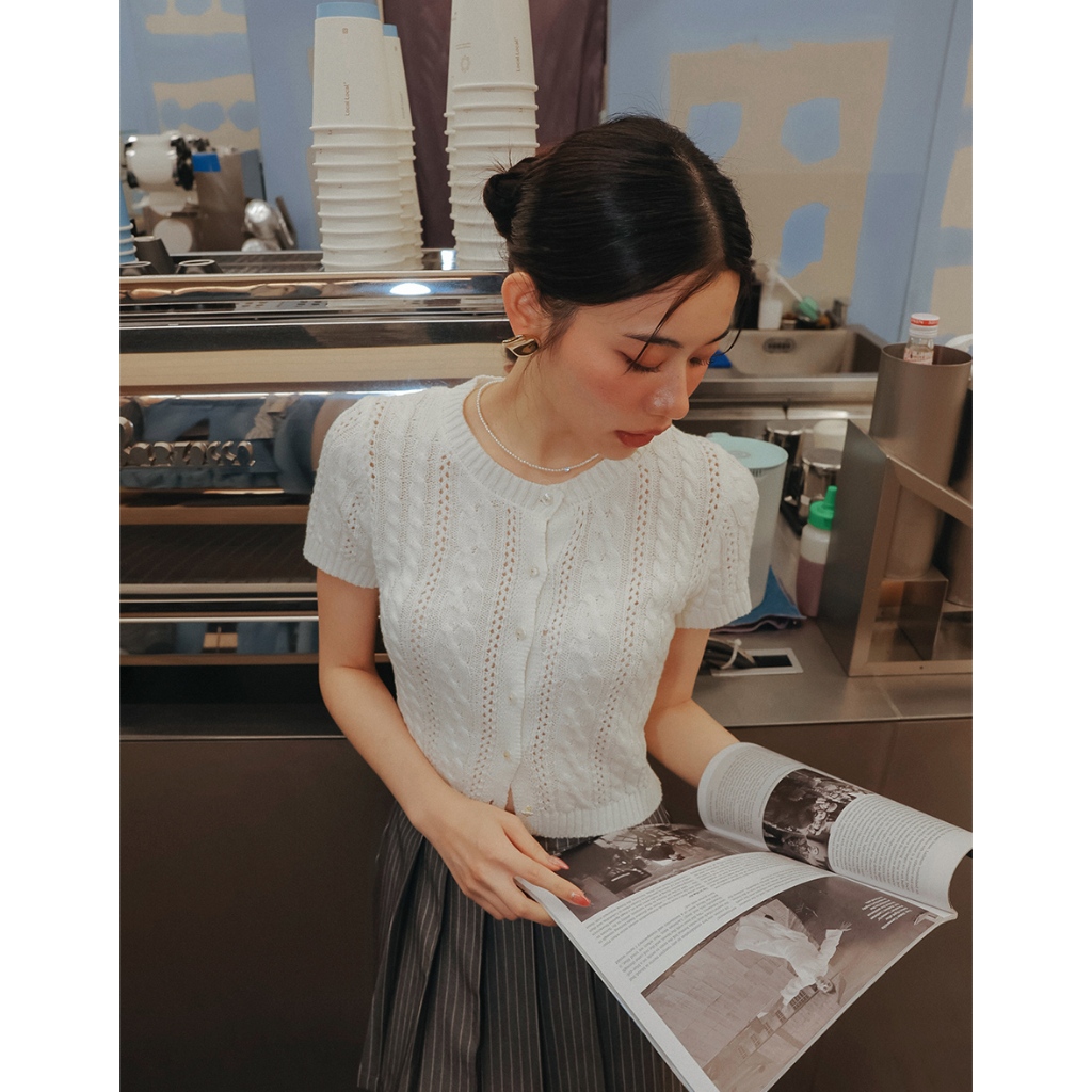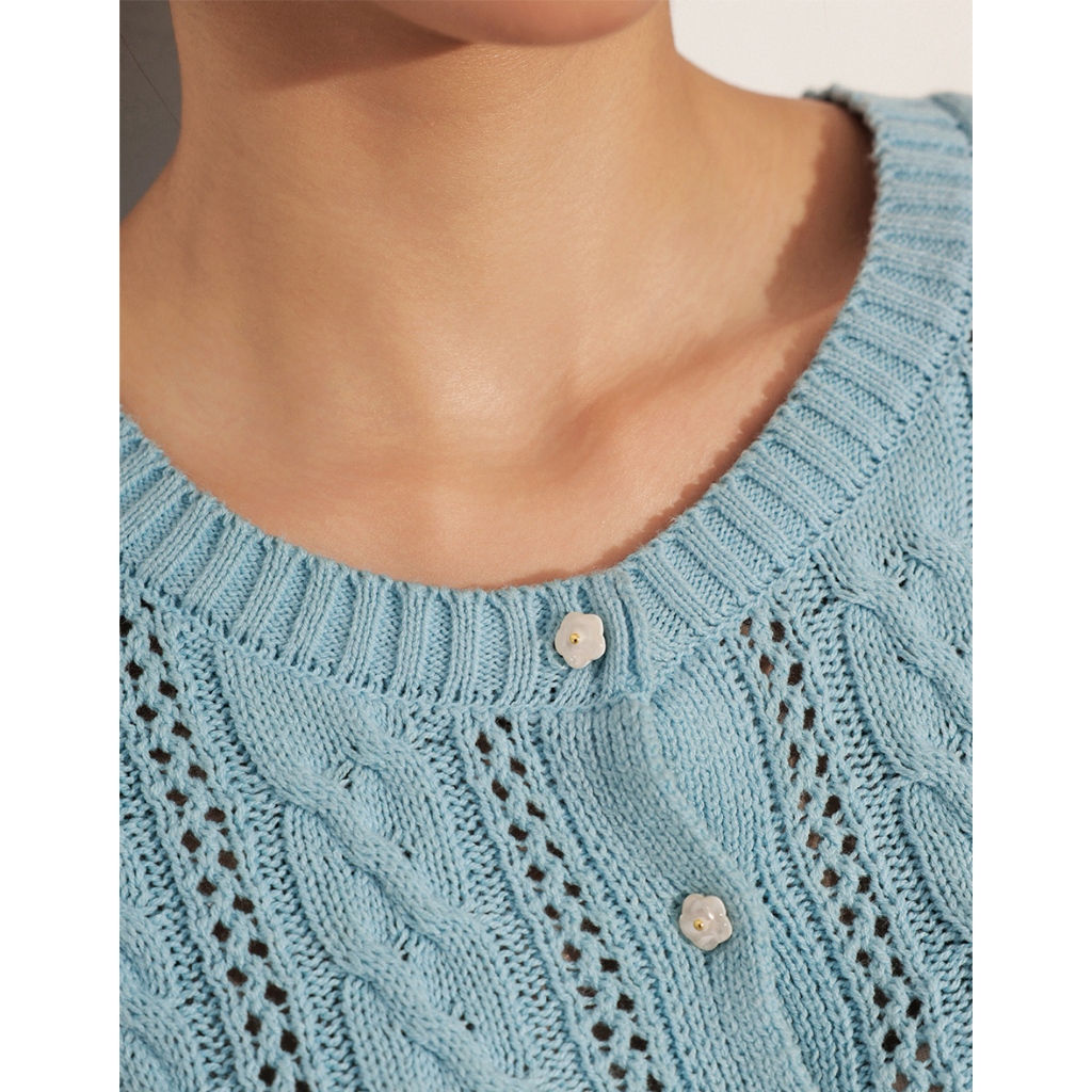 AIR SPACE LADY 小花貝扣麻花短袖針織開襟衫(白/淺藍) 女裝 現貨白,S|白,M|淺藍,S|淺藍,MAIR SPACE