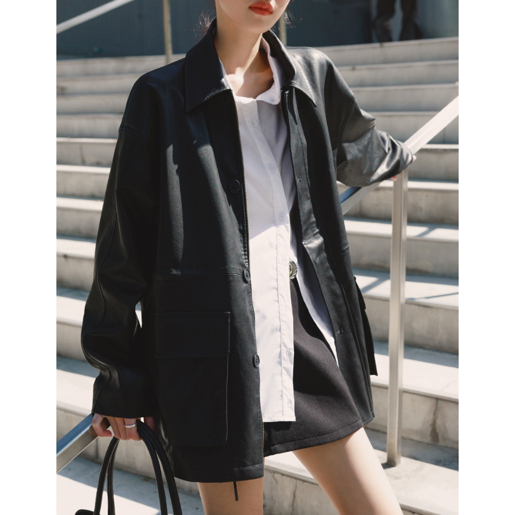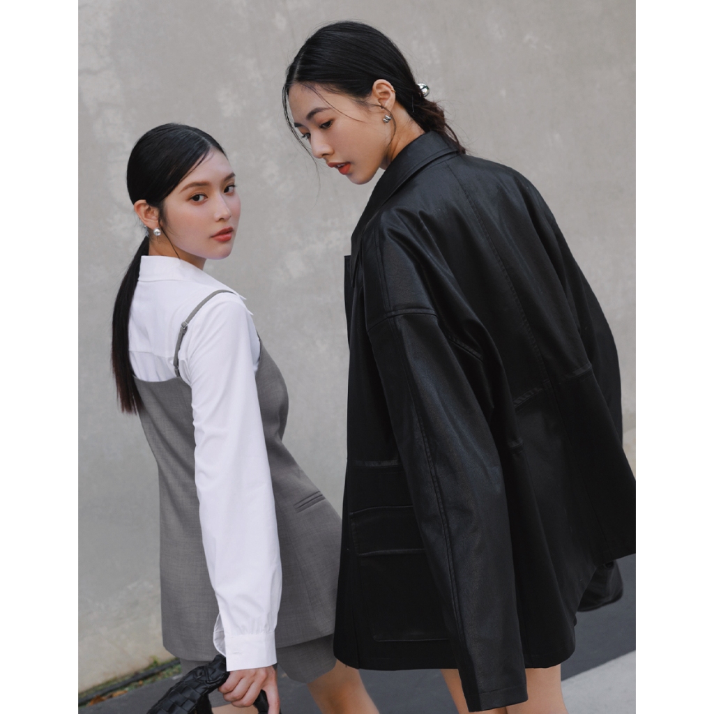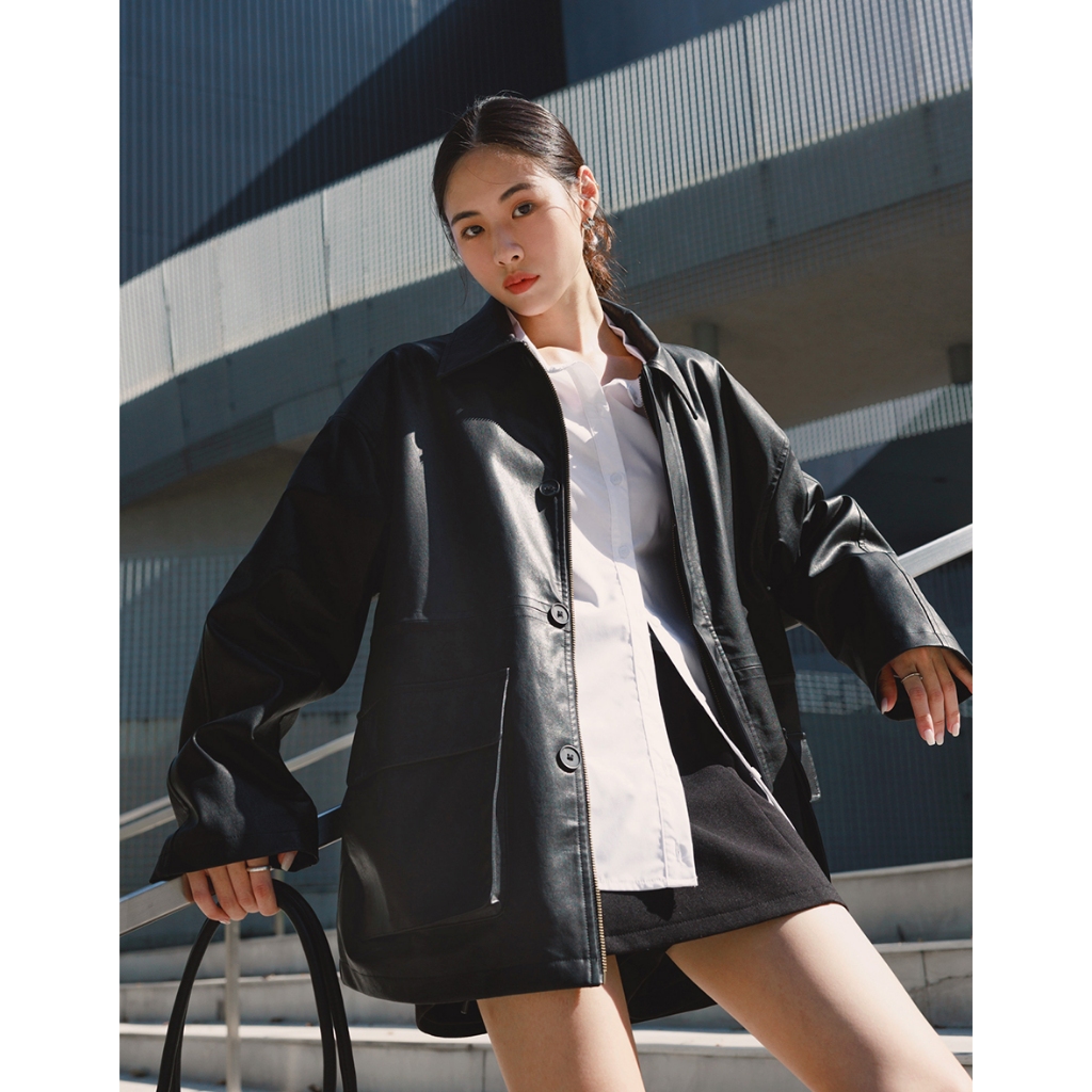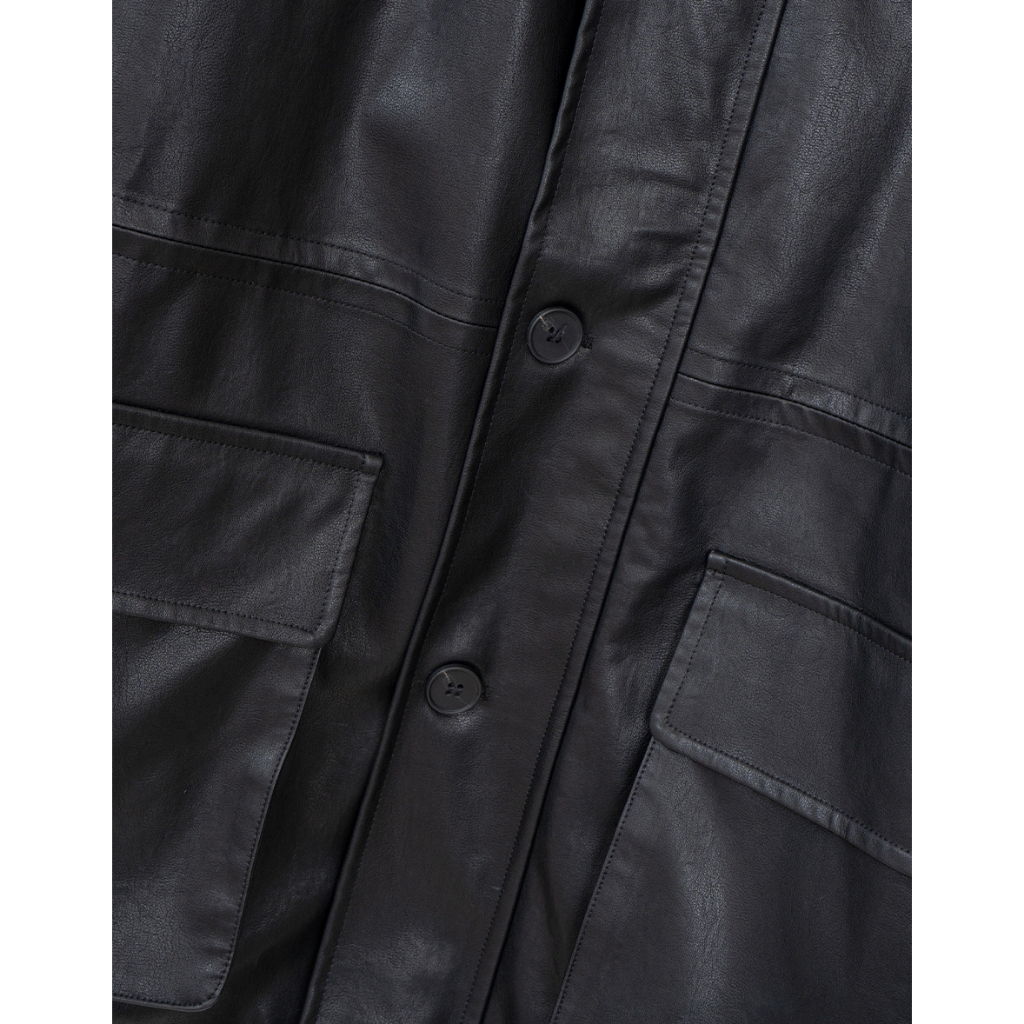 CHIC A SPACE 2WAY時髦皮革寬版外套(附墊肩)(黑) 女裝 現貨黑,FJacketsAIR SPACE