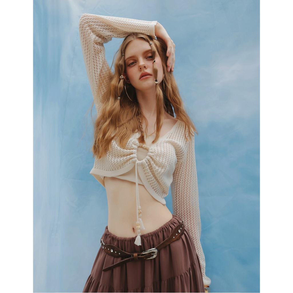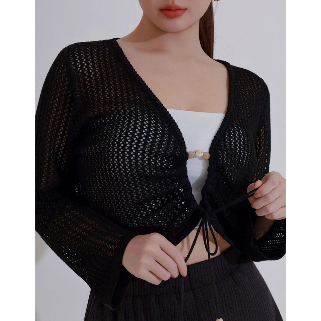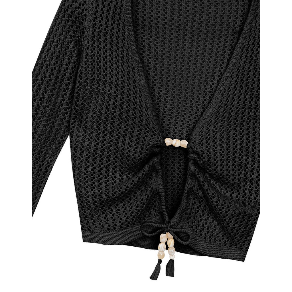 AIR SPACE PLUS 2WAY串珠抽繩鏤空長袖針織衫(黑/杏) 女裝 現貨 大尺碼 中大尺碼