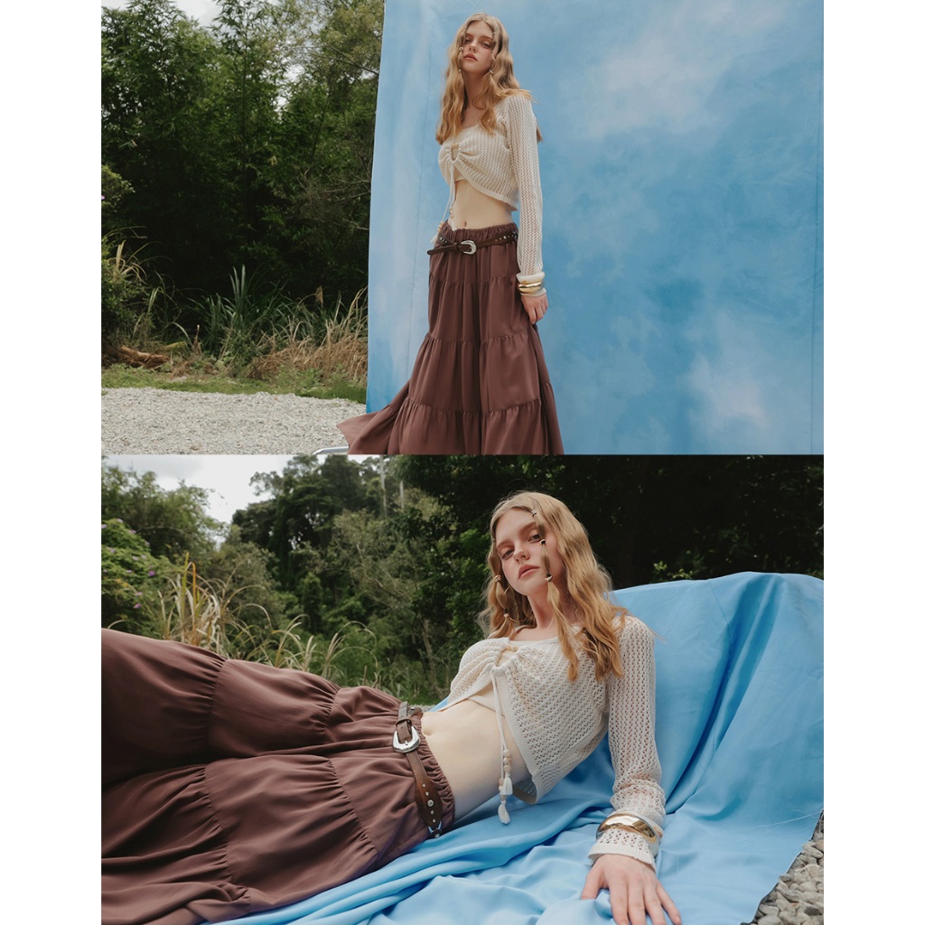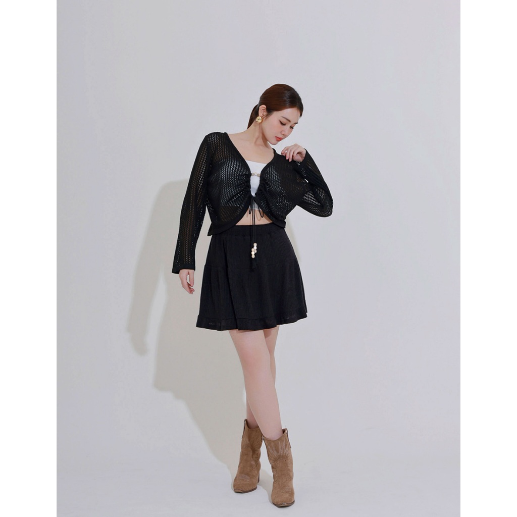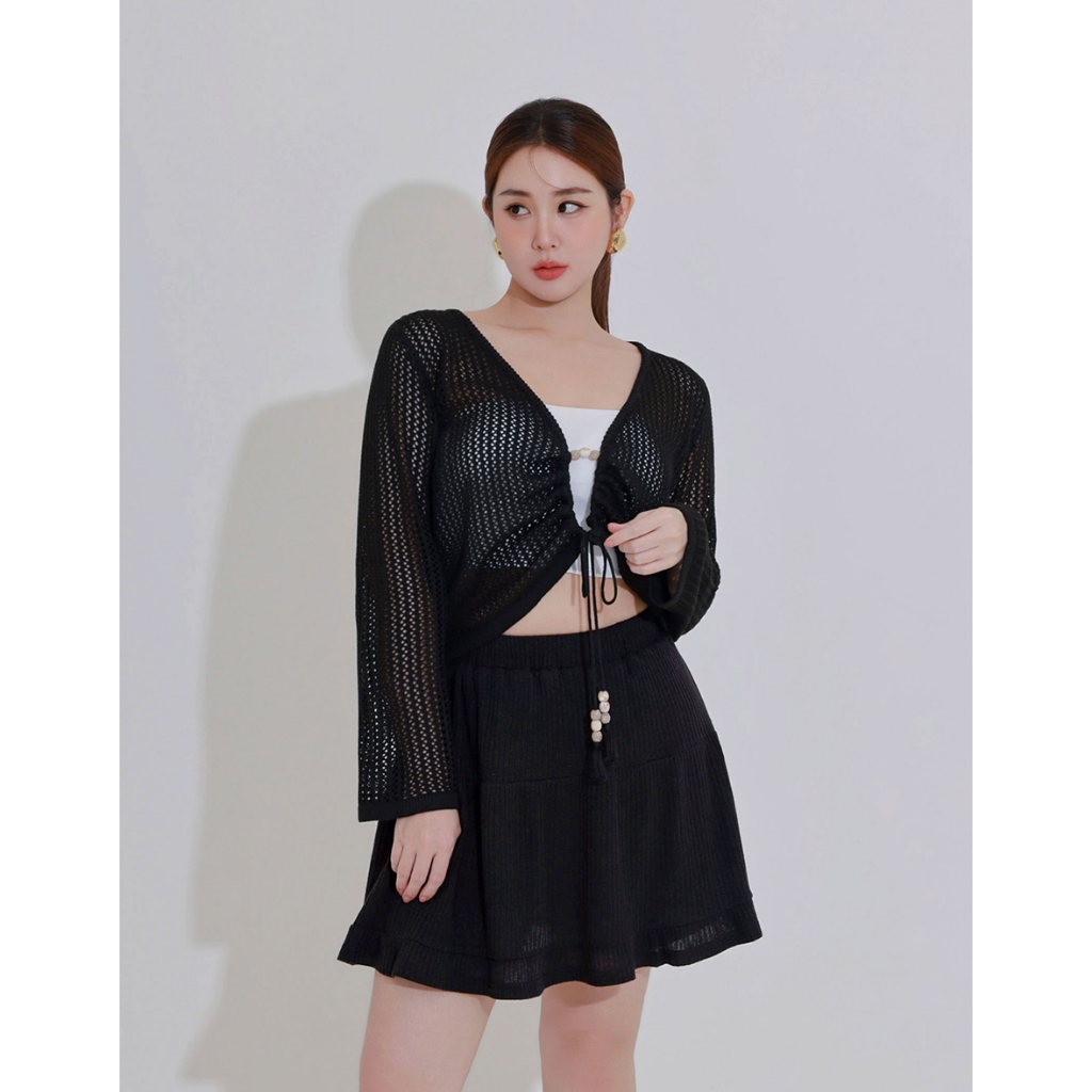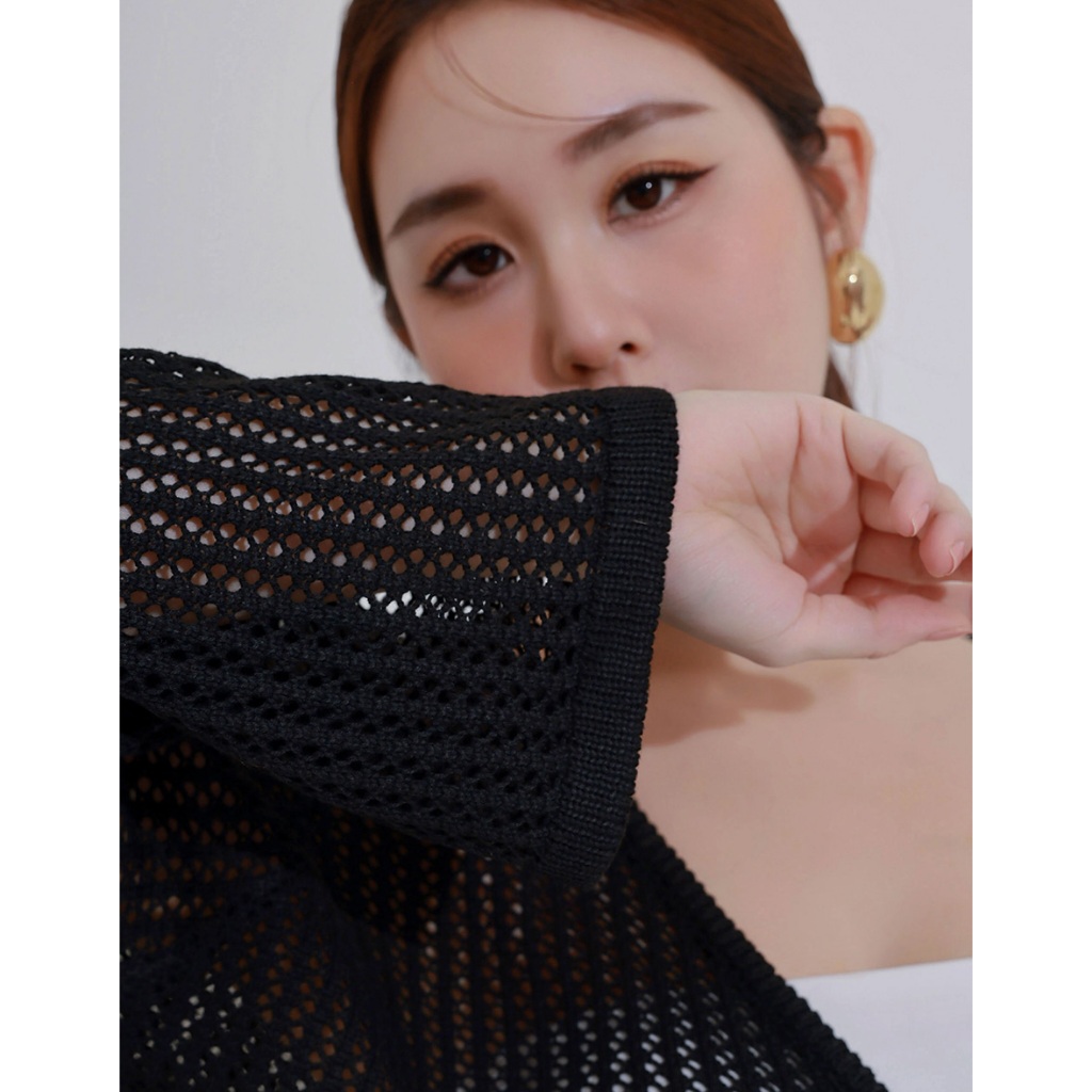 AIR SPACE PLUS 2WAY串珠抽繩鏤空長袖針織衫(黑/杏) 女裝 現貨 大尺碼 中大尺碼