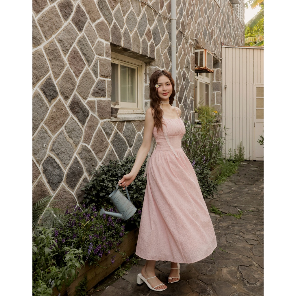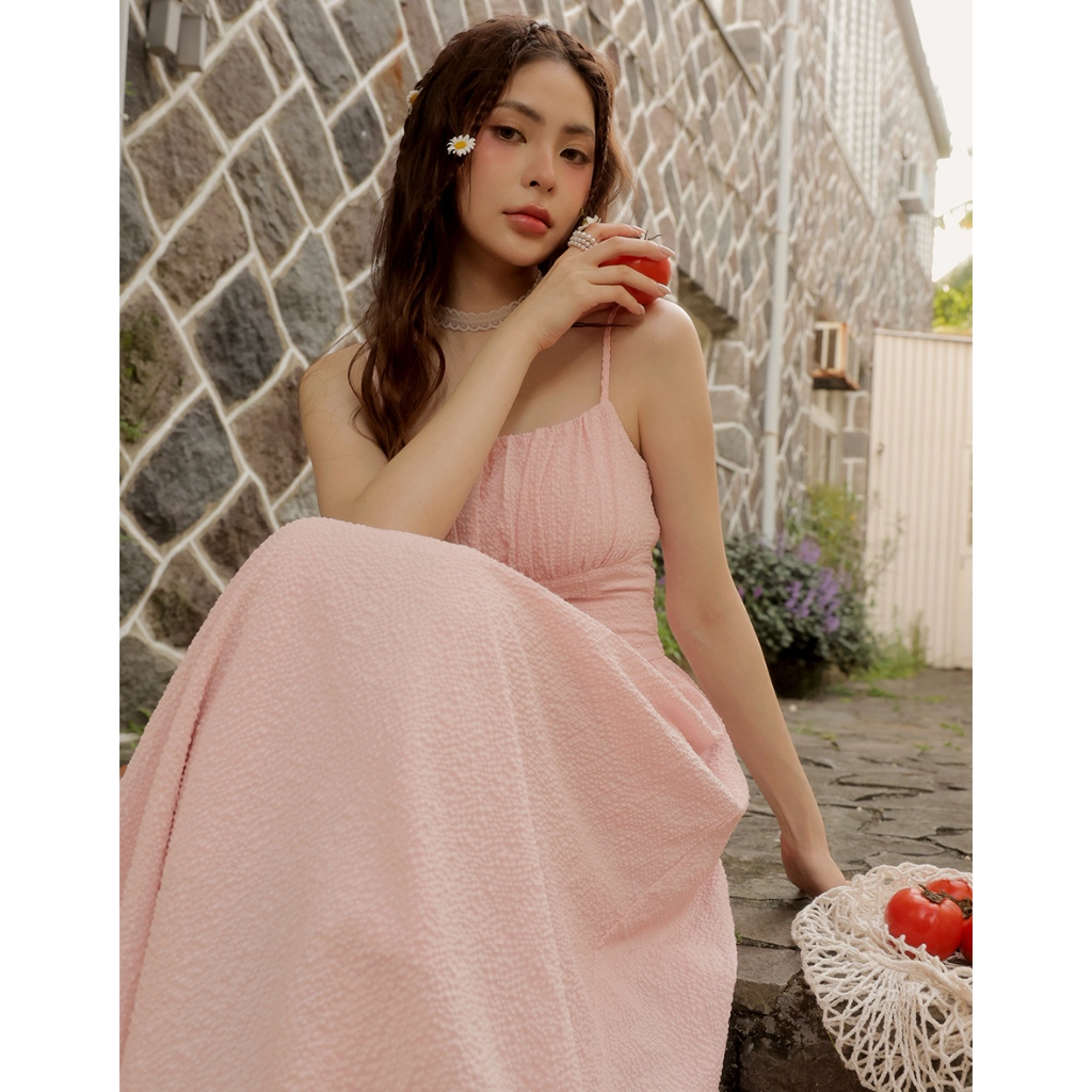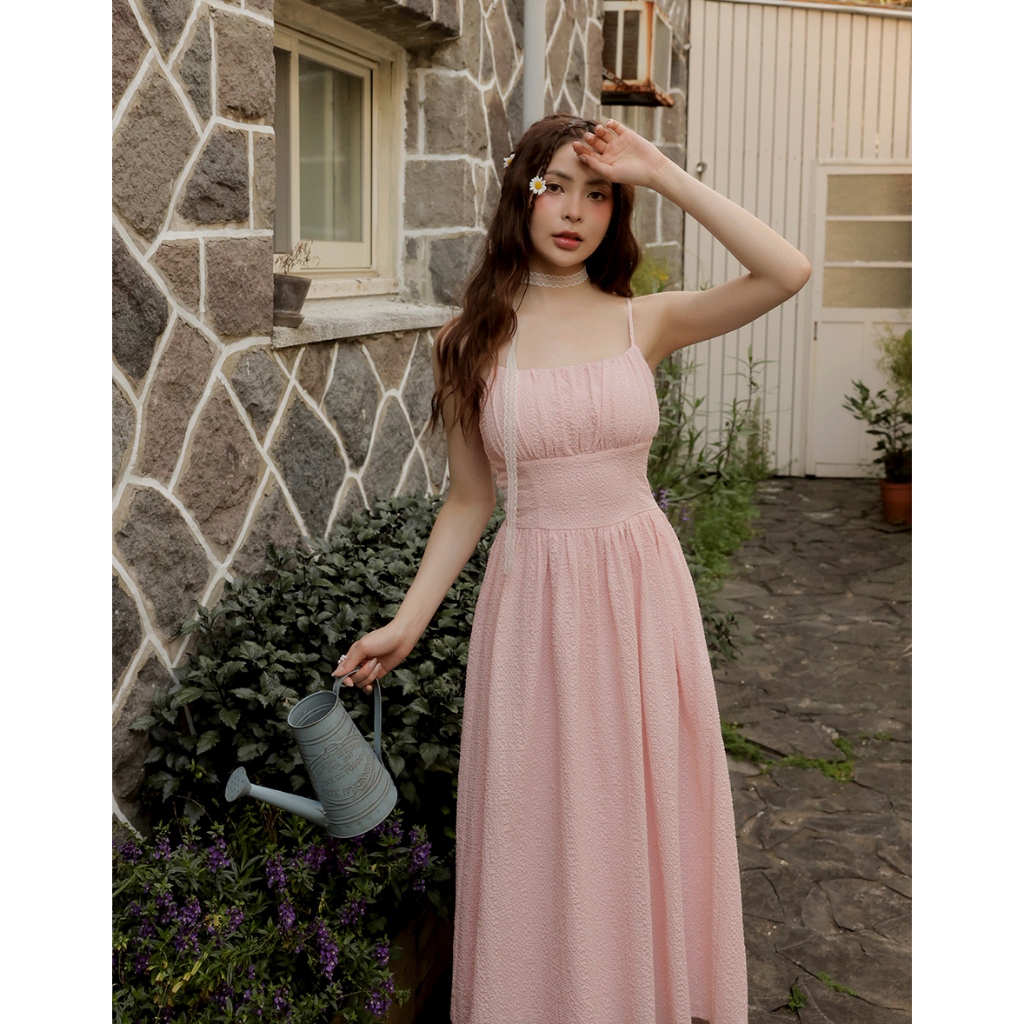 AIR SPACE LADY 格紋泡泡紗收腰細肩帶長洋裝(附胸墊)(白/粉紅) 女裝 現貨白,S|白,M|白,L|粉紅,S|粉紅,M|粉紅,LAIR SPACE