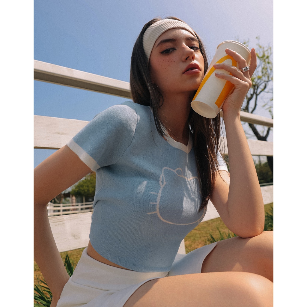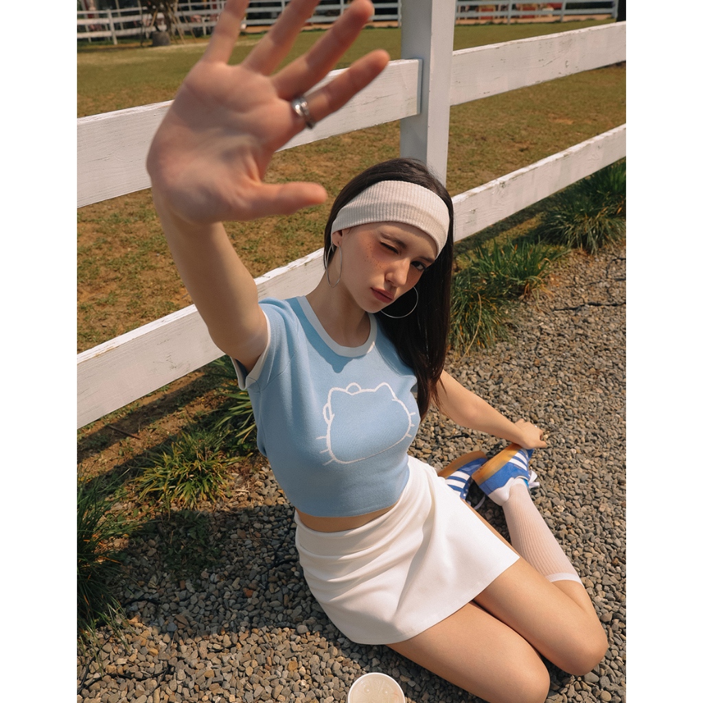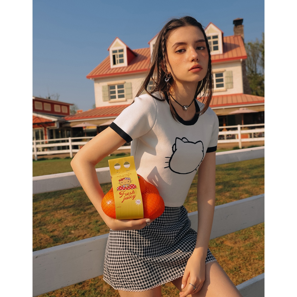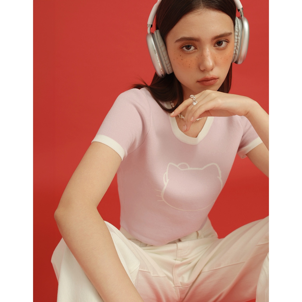 AIR SPACE 【Hello Kitty聯名】輪廓線圖案撞色針織上衣(白/粉紅/淺藍) 女裝 現貨白,S|白,M|粉紅,S|粉紅,M|淺藍,S|淺藍,MAIR SPACE