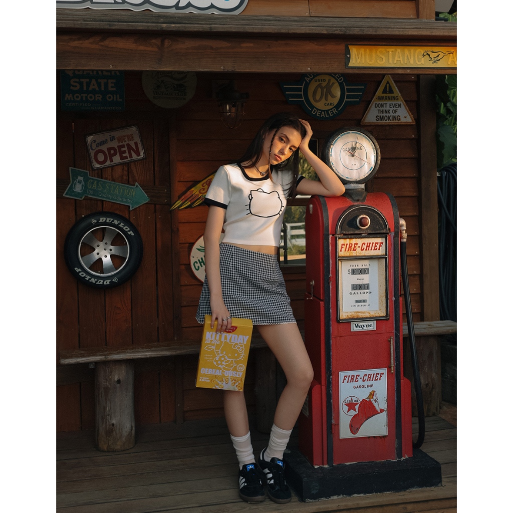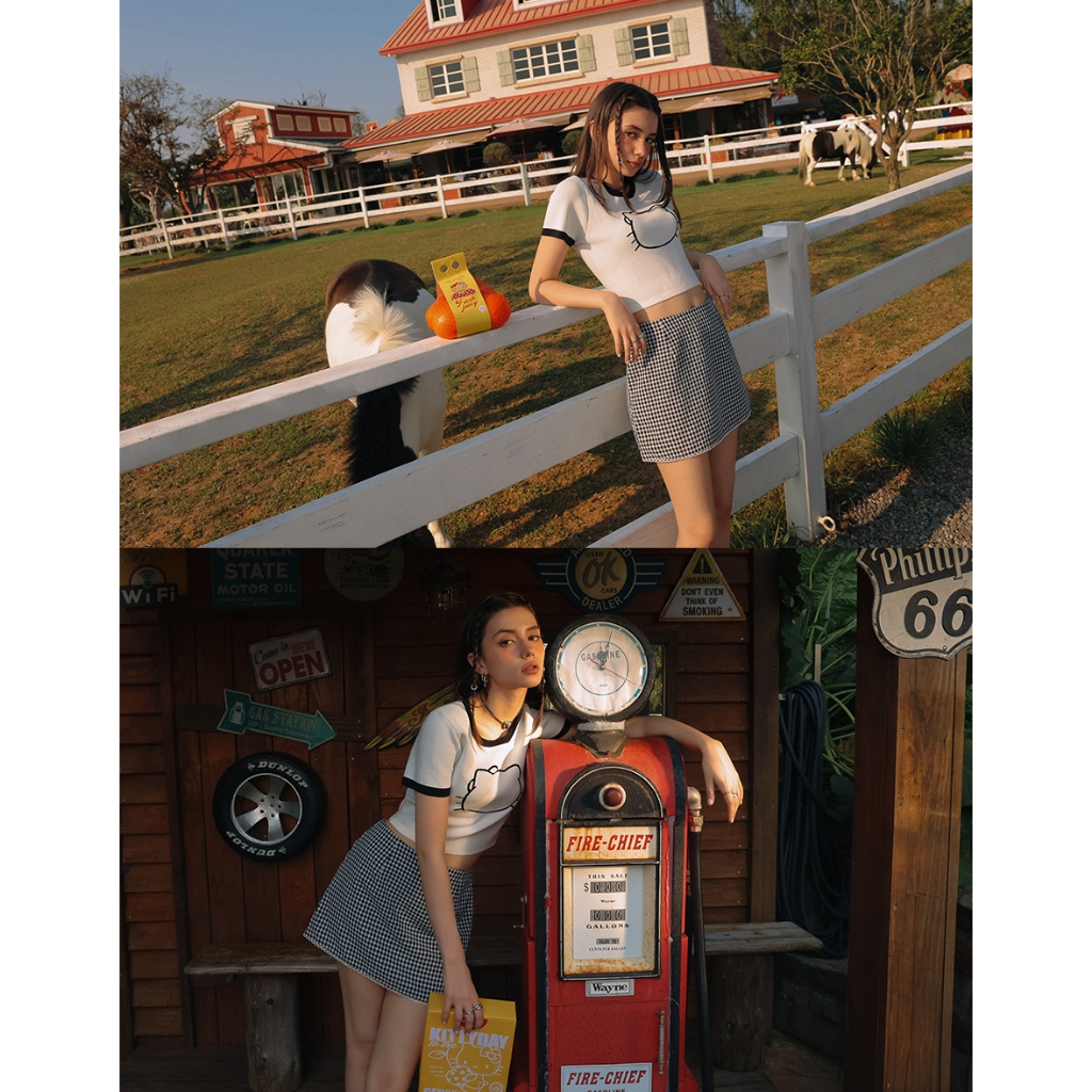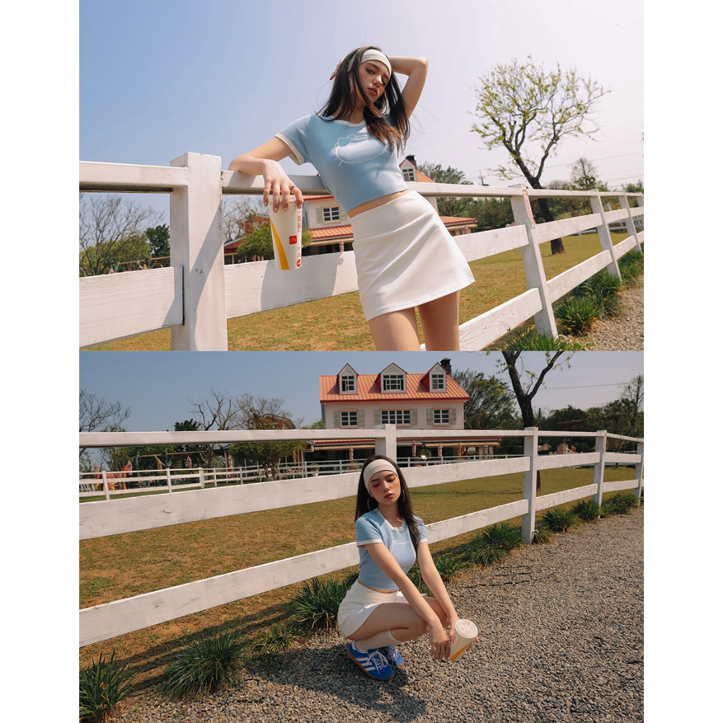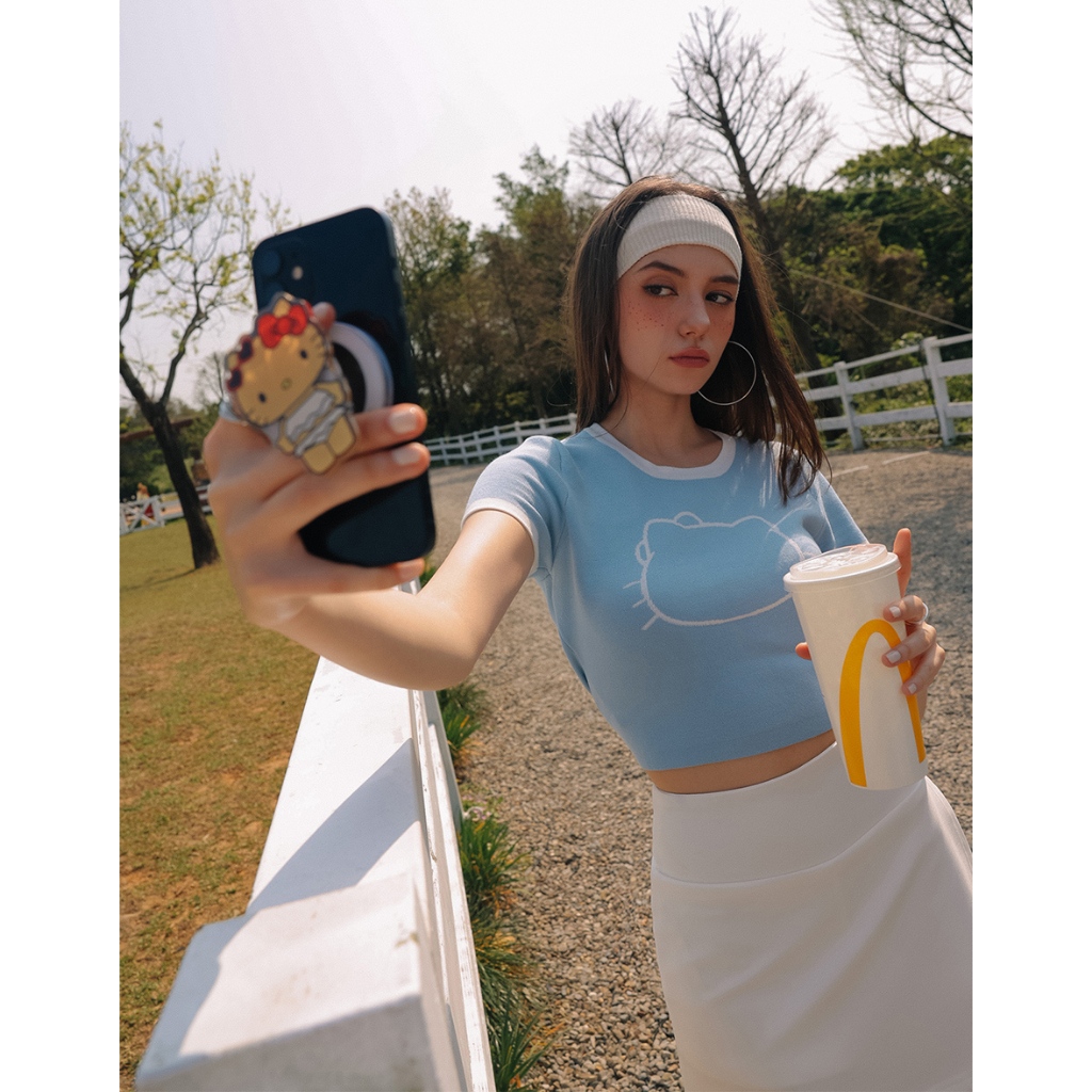 AIR SPACE 【Hello Kitty聯名】輪廓線圖案撞色針織上衣(白/粉紅/淺藍) 女裝 現貨白,S|白,M|粉紅,S|粉紅,M|淺藍,S|淺藍,MAIR SPACE