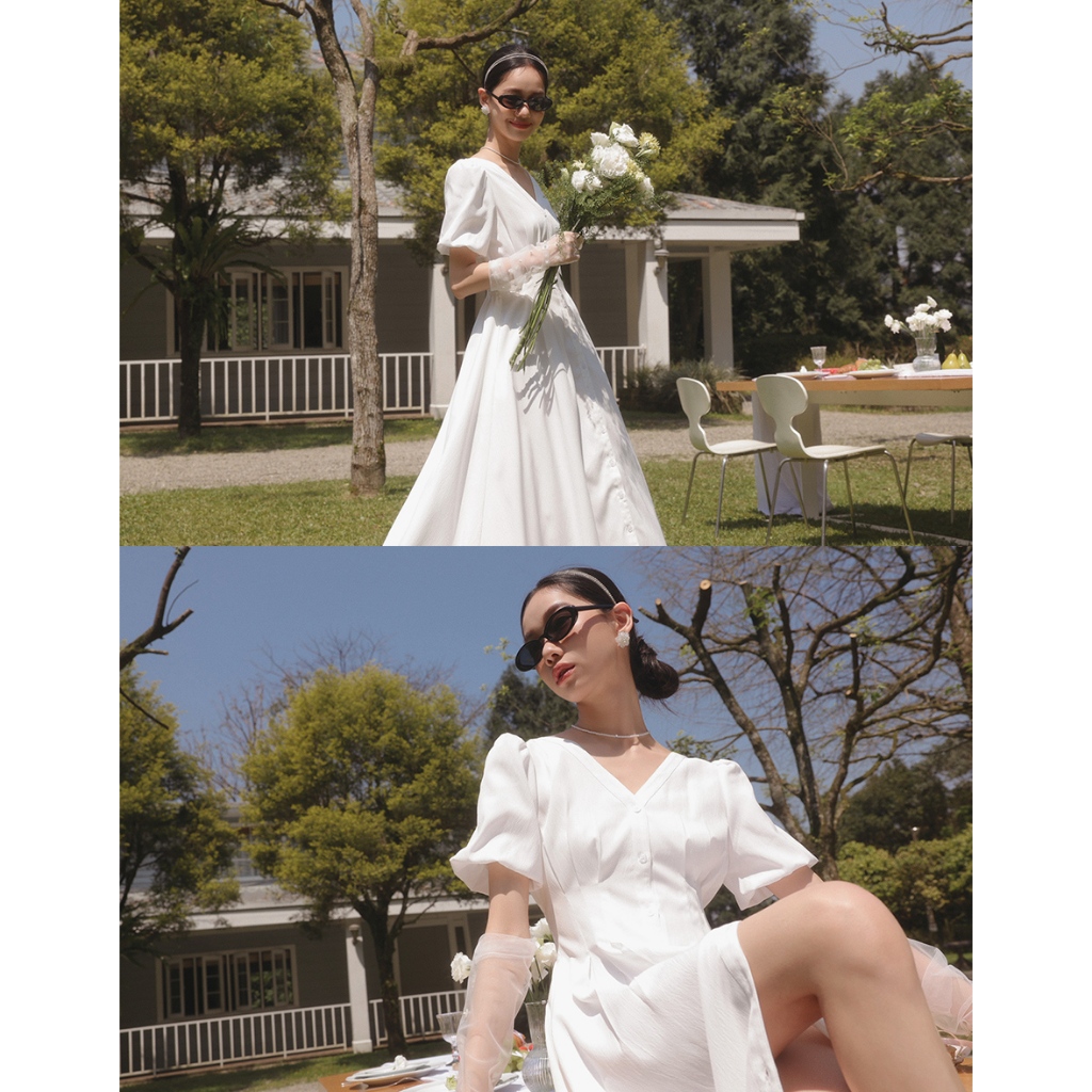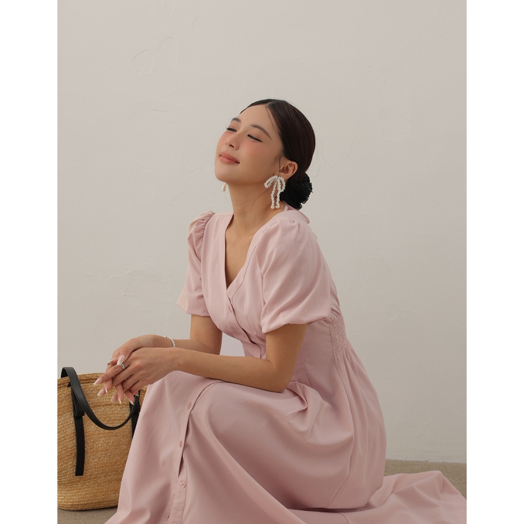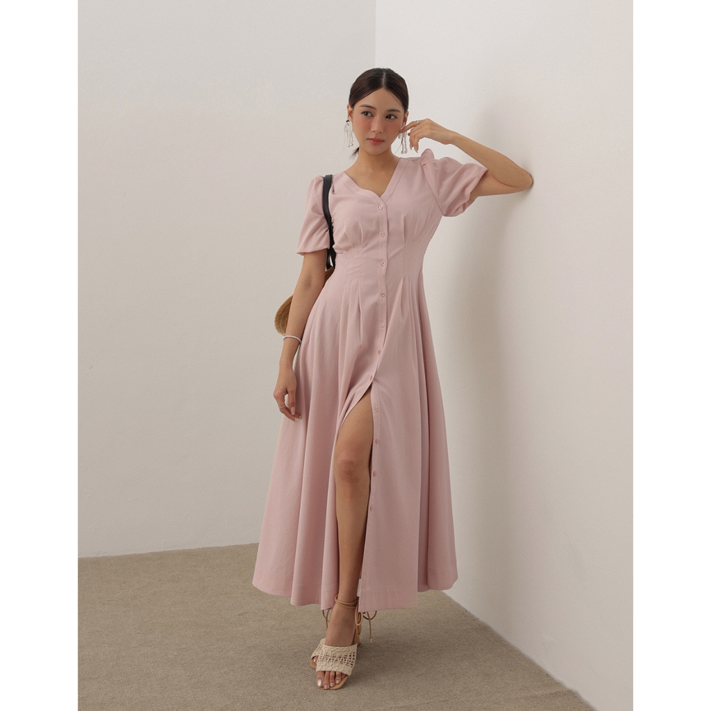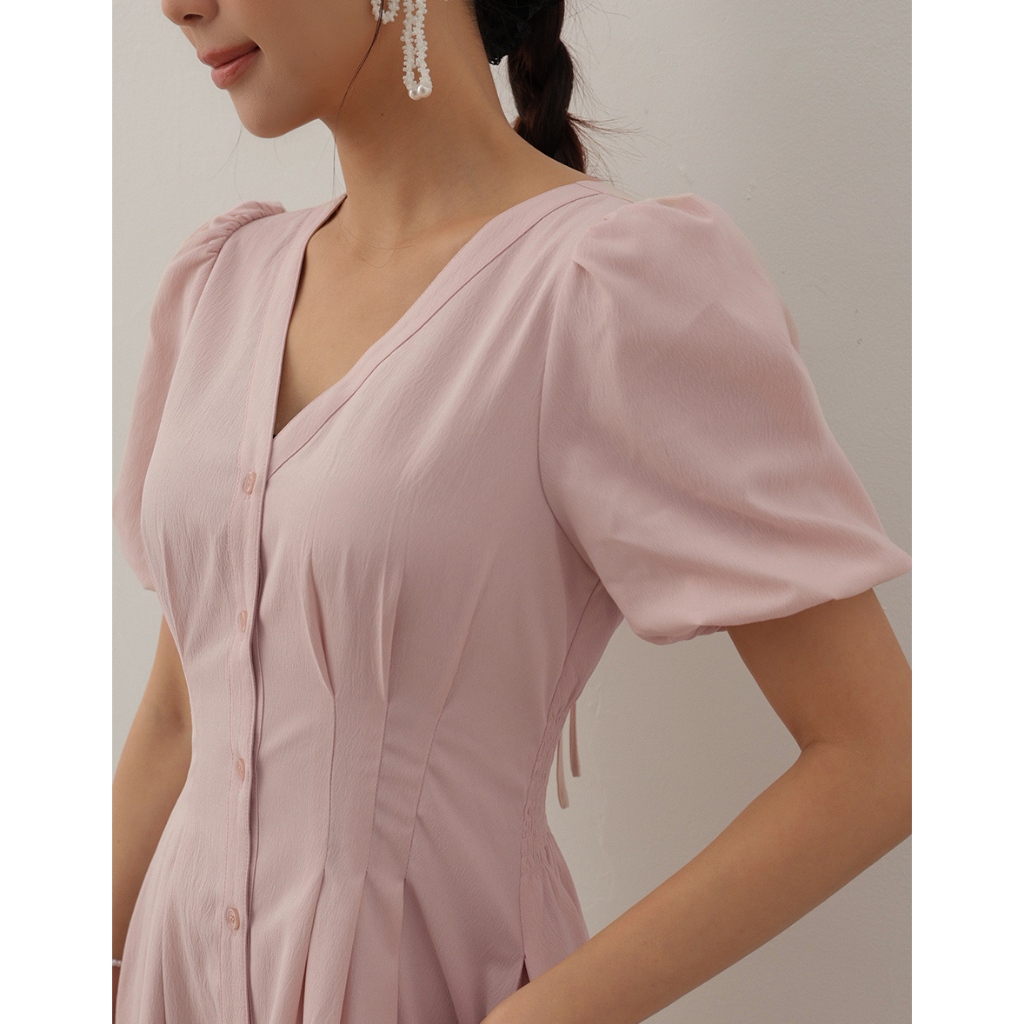 AIR SPACE LADY 澎袖收腰排釦長洋裝(白/粉紅) 女裝 現貨白,S|白,M|白,L|粉紅,S|粉紅,M|粉紅,LAIR SPACE