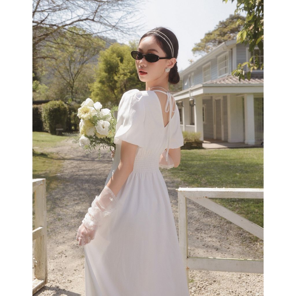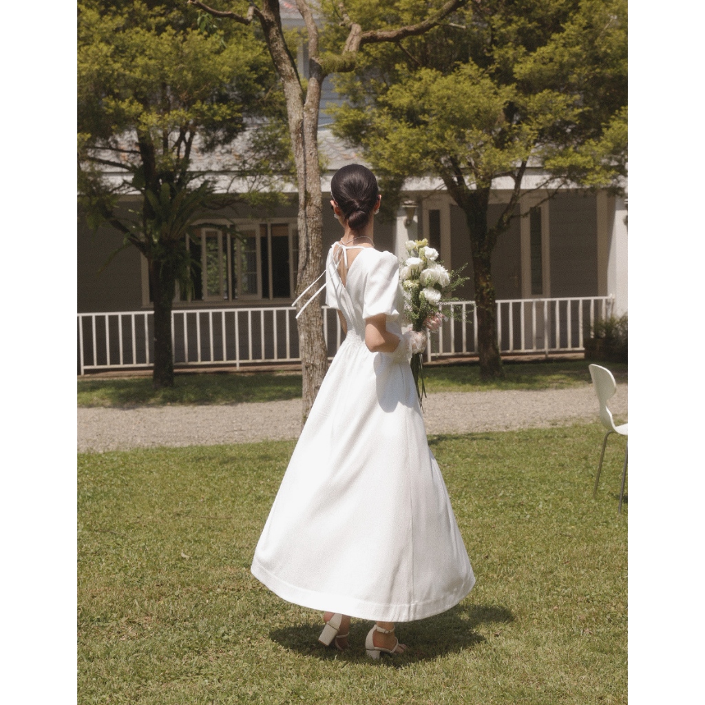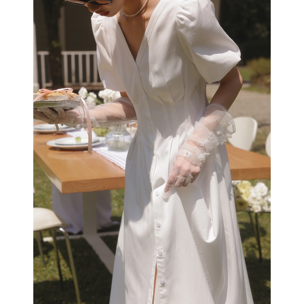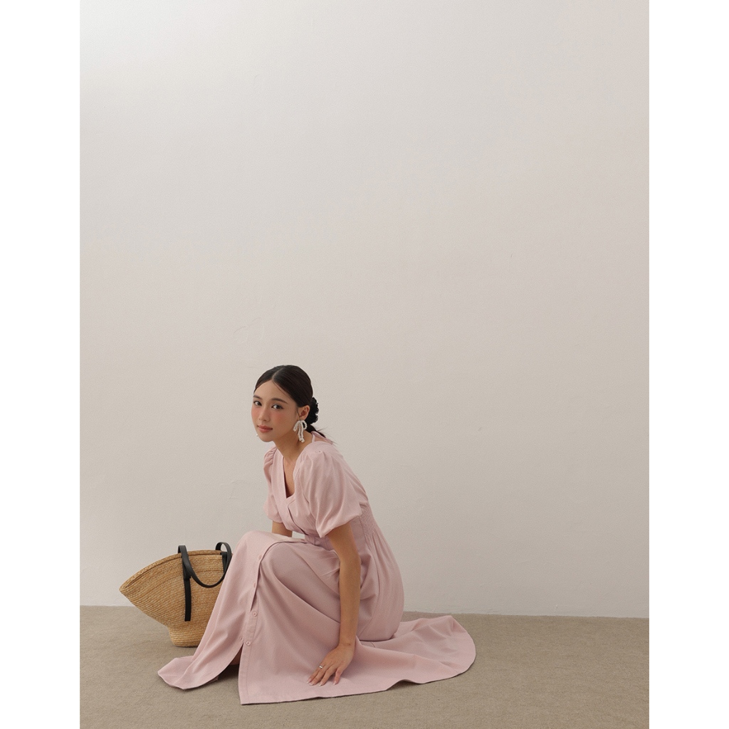 AIR SPACE LADY 澎袖收腰排釦長洋裝(白/粉紅) 女裝 現貨白,S|白,M|白,L|粉紅,S|粉紅,M|粉紅,LAIR SPACE