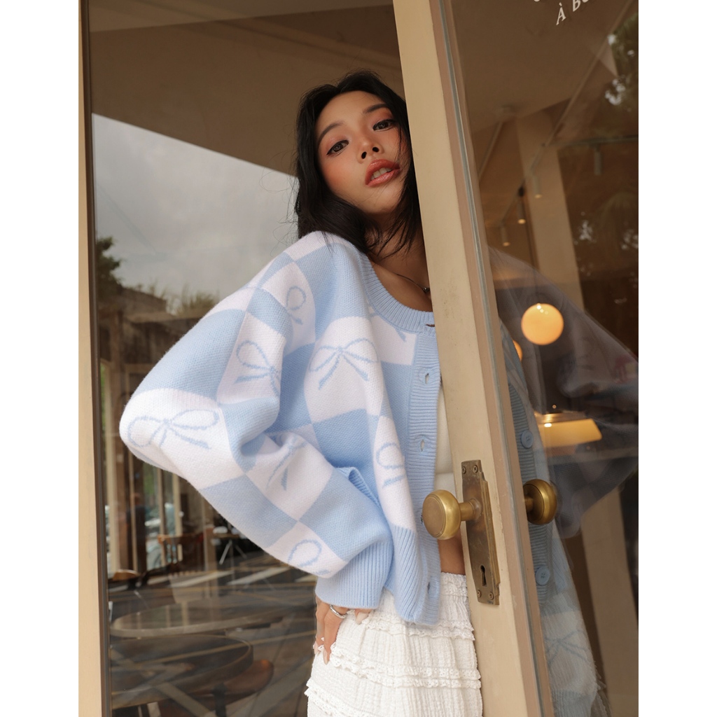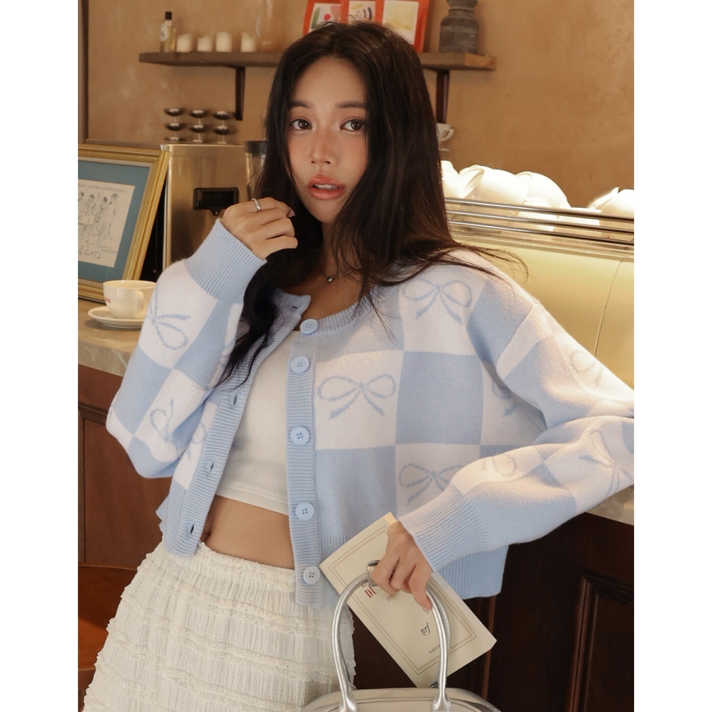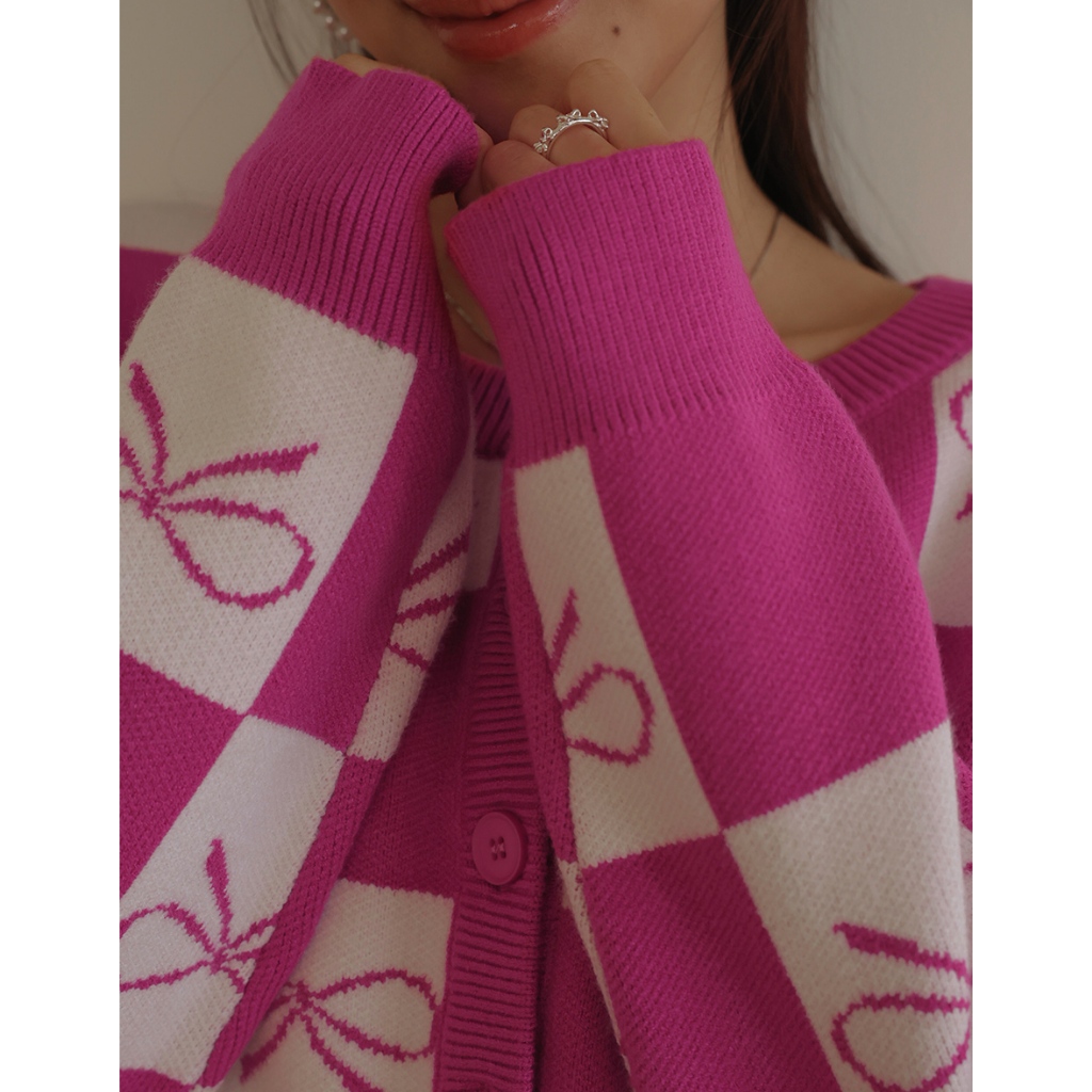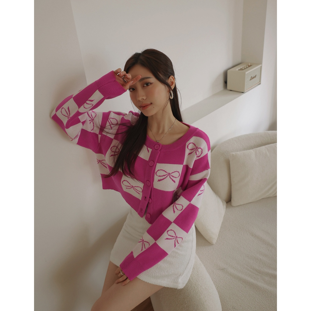 AIR SPACE LADY 蝴蝶結格紋針織開襟衫(藍/粉紅) 女裝 現貨藍,F|粉紅,FAIR SPACE