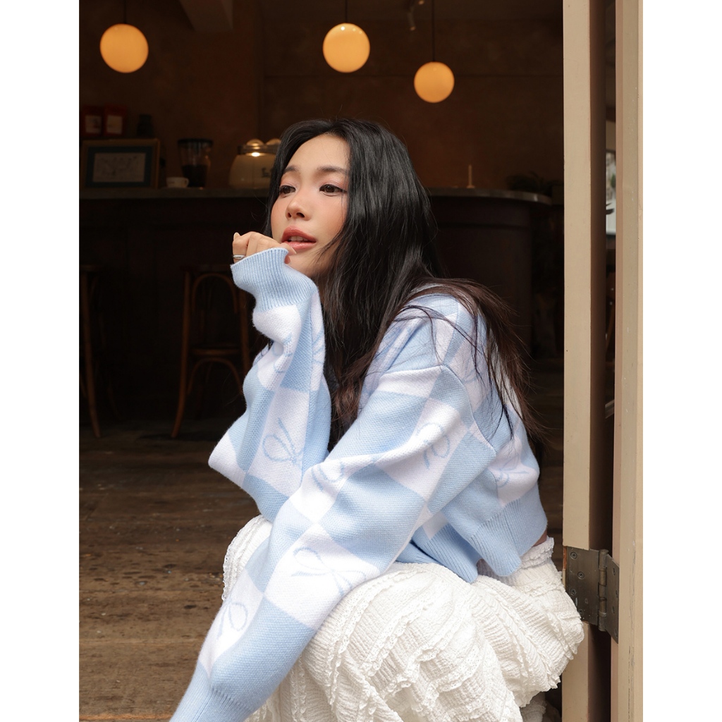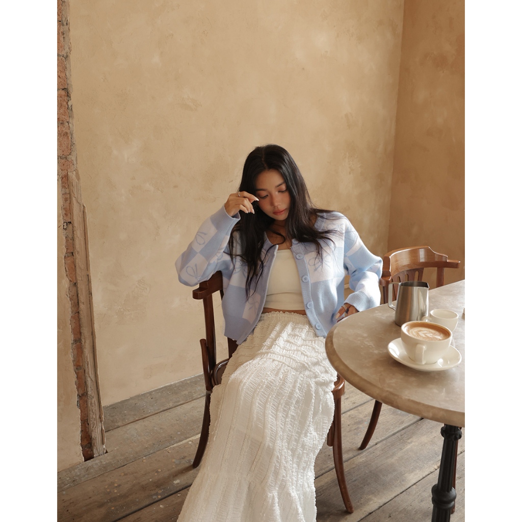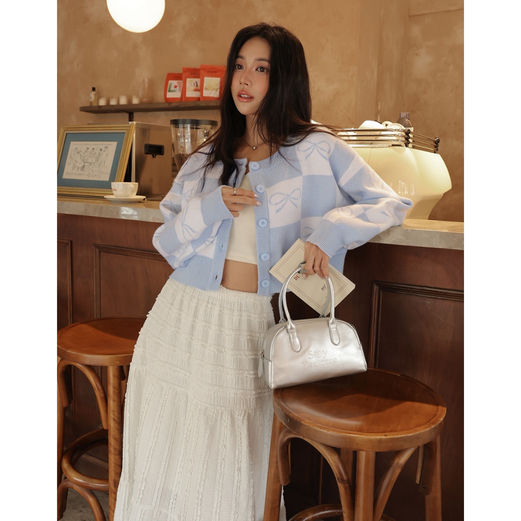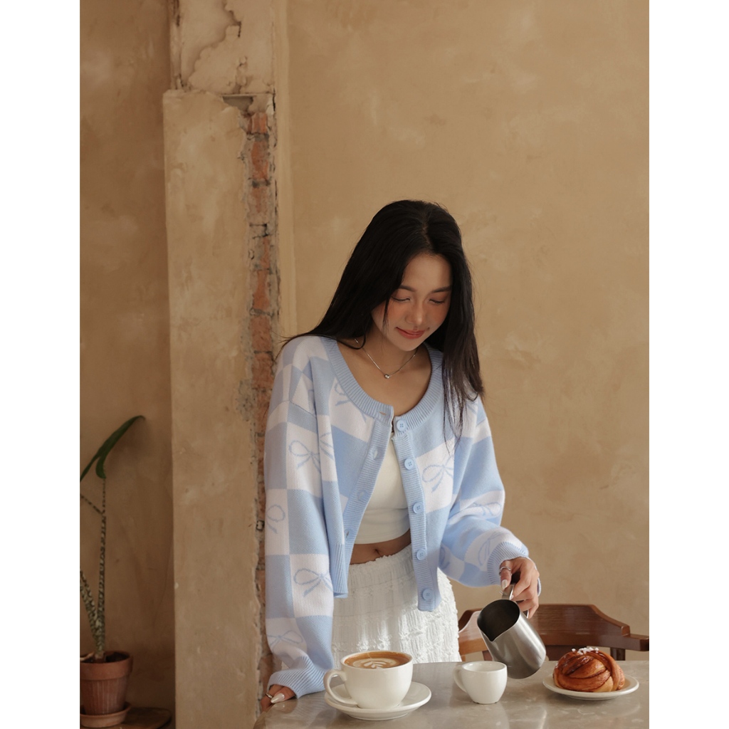 AIR SPACE LADY 蝴蝶結格紋針織開襟衫(藍/粉紅) 女裝 現貨藍,F|粉紅,FAIR SPACE
