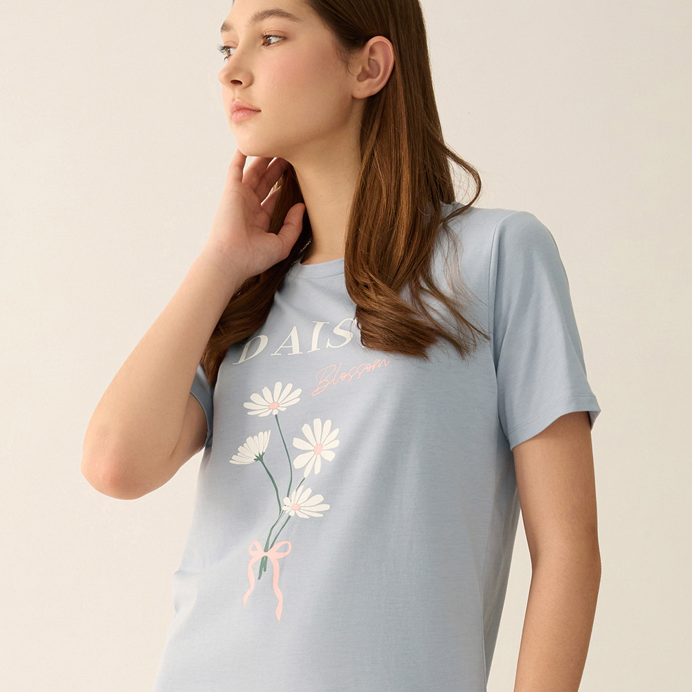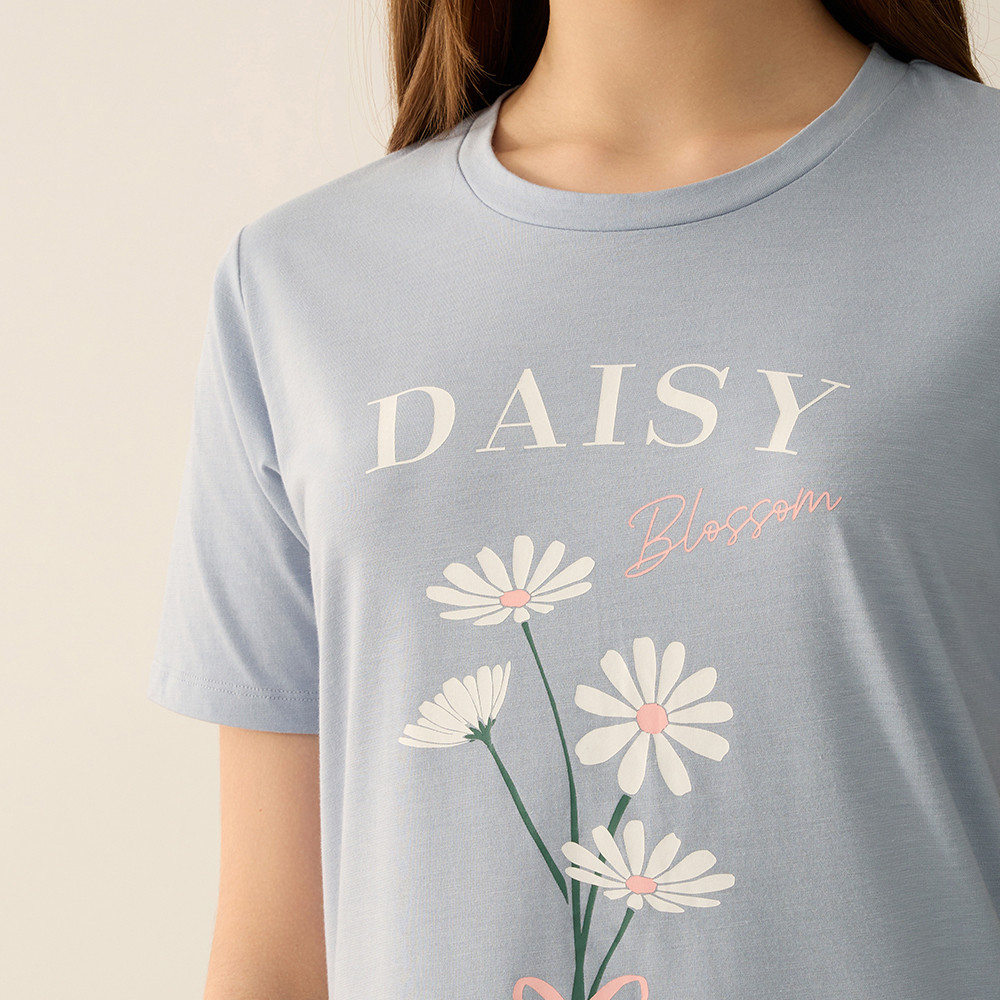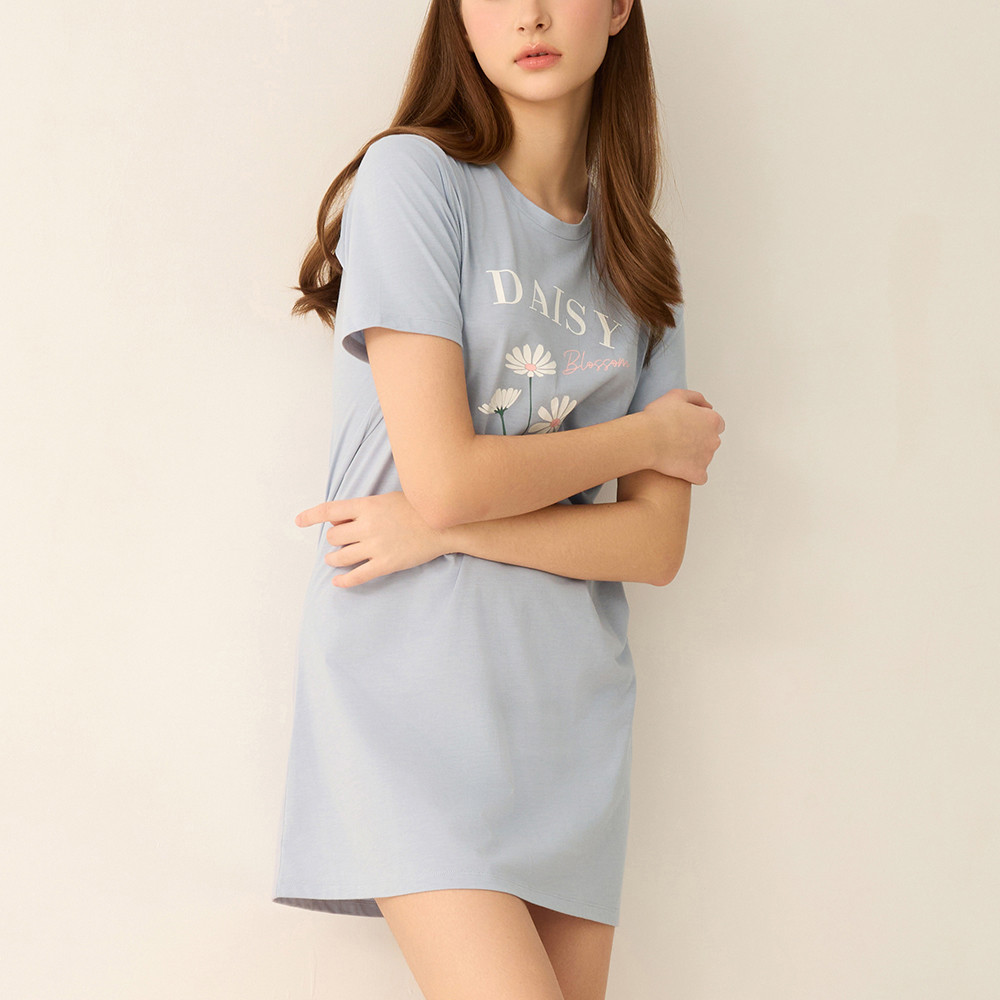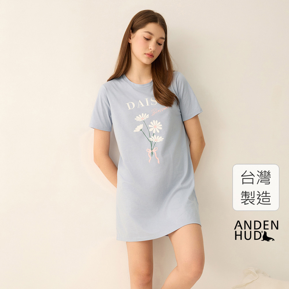 【Anden Hud】連身_夏日暖陽.吸濕排汗圓領中長版短袖睡衣(淺灰藍-大雛菊) 純棉台灣製S|M|L|XLPajamasAnden Hud 台灣製內著 官方旗艦店