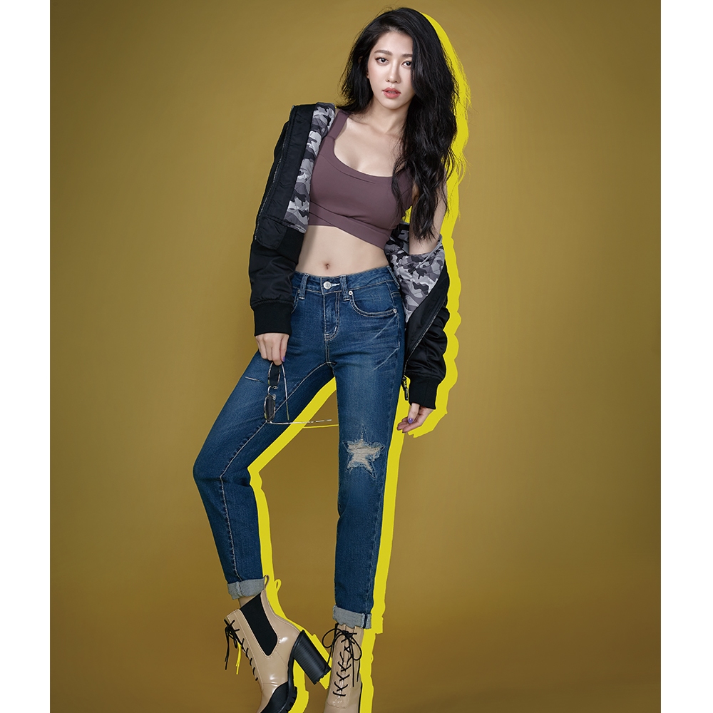 VICTORIA 特彈星星割破補丁男友褲-中藍VW51032L|S|M|L|XLBIG TRAIN 官方旗艦店
