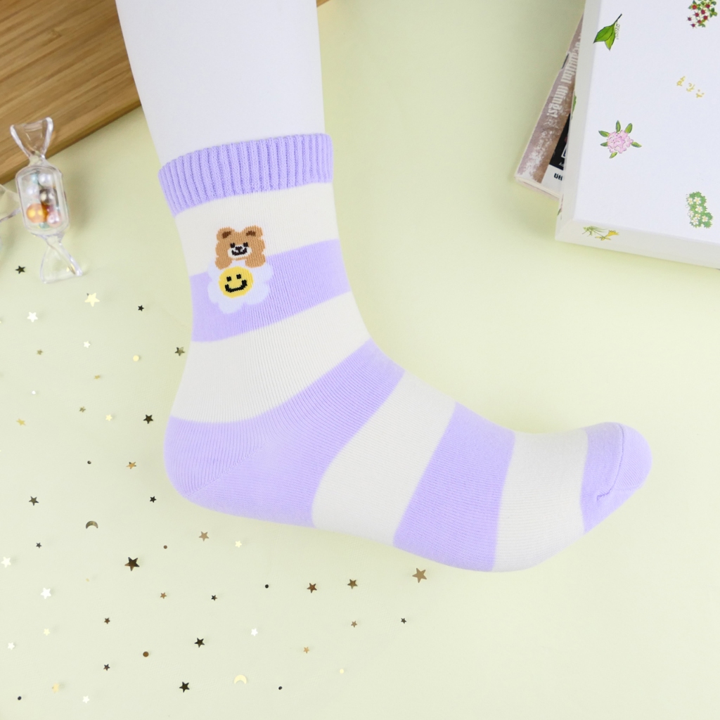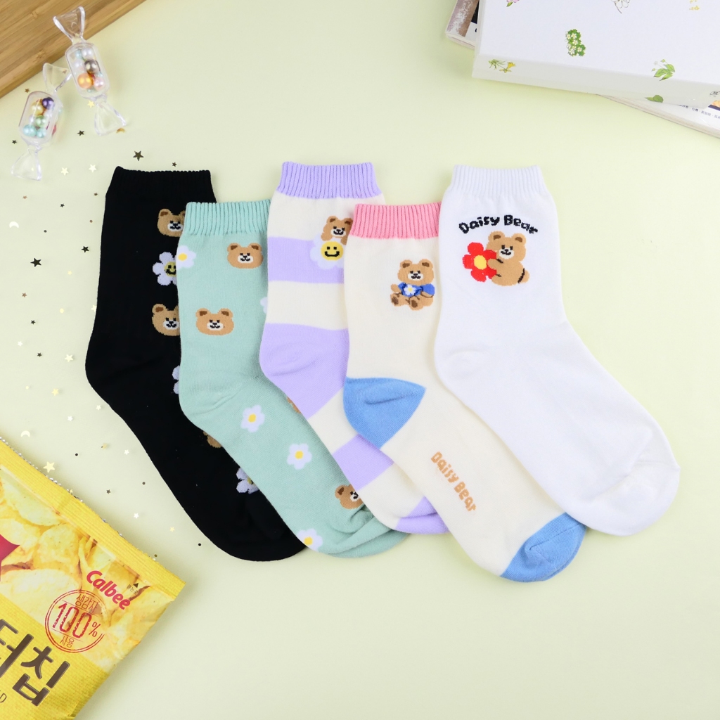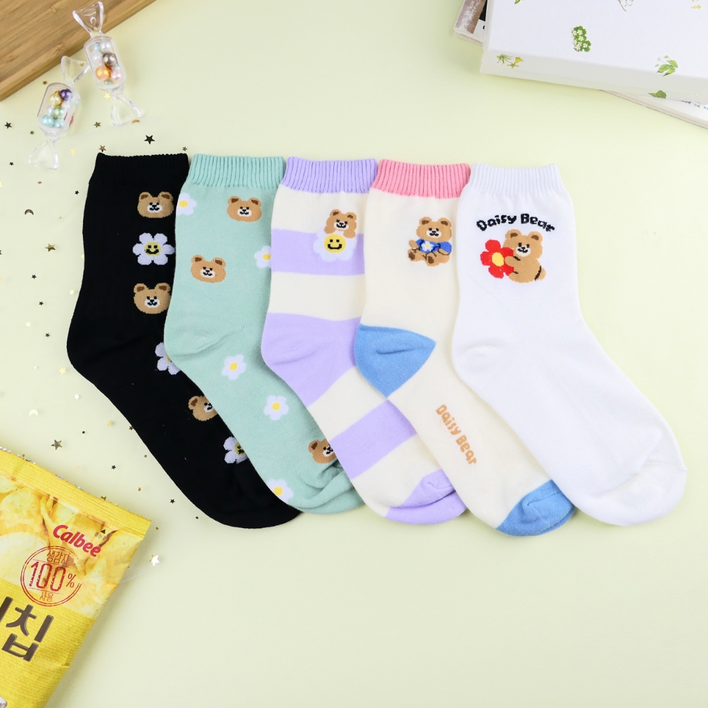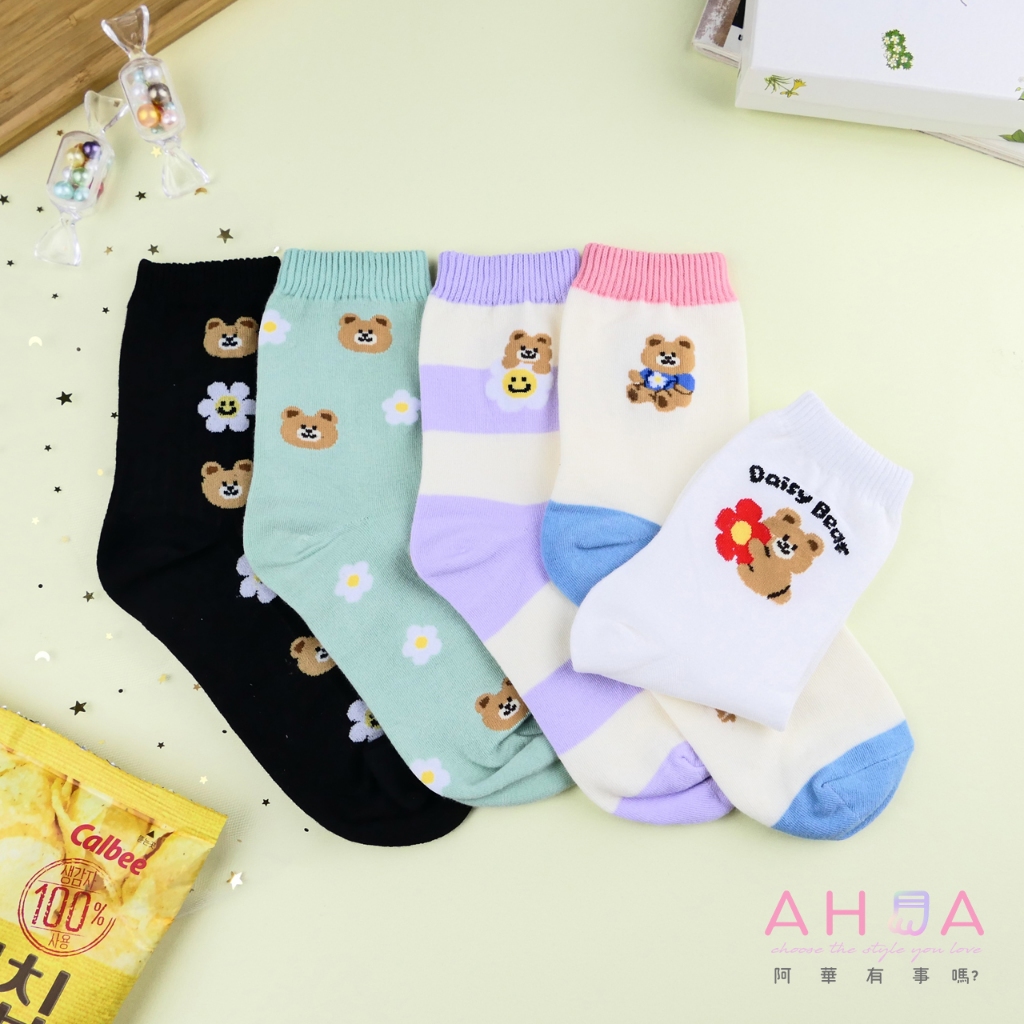 AHUA 阿華有事嗎 雛菊花朵小熊系列中筒襪 K2336 正韓襪子 百搭純棉襪 韓系必備 少女襪白底英文小熊|米黃底粉襪口|紫底米黃條紋|綠底滿白小熊雛菊|黑底直條小熊雛菊SocksAHUA 韓國襪子品牌旗艦店
