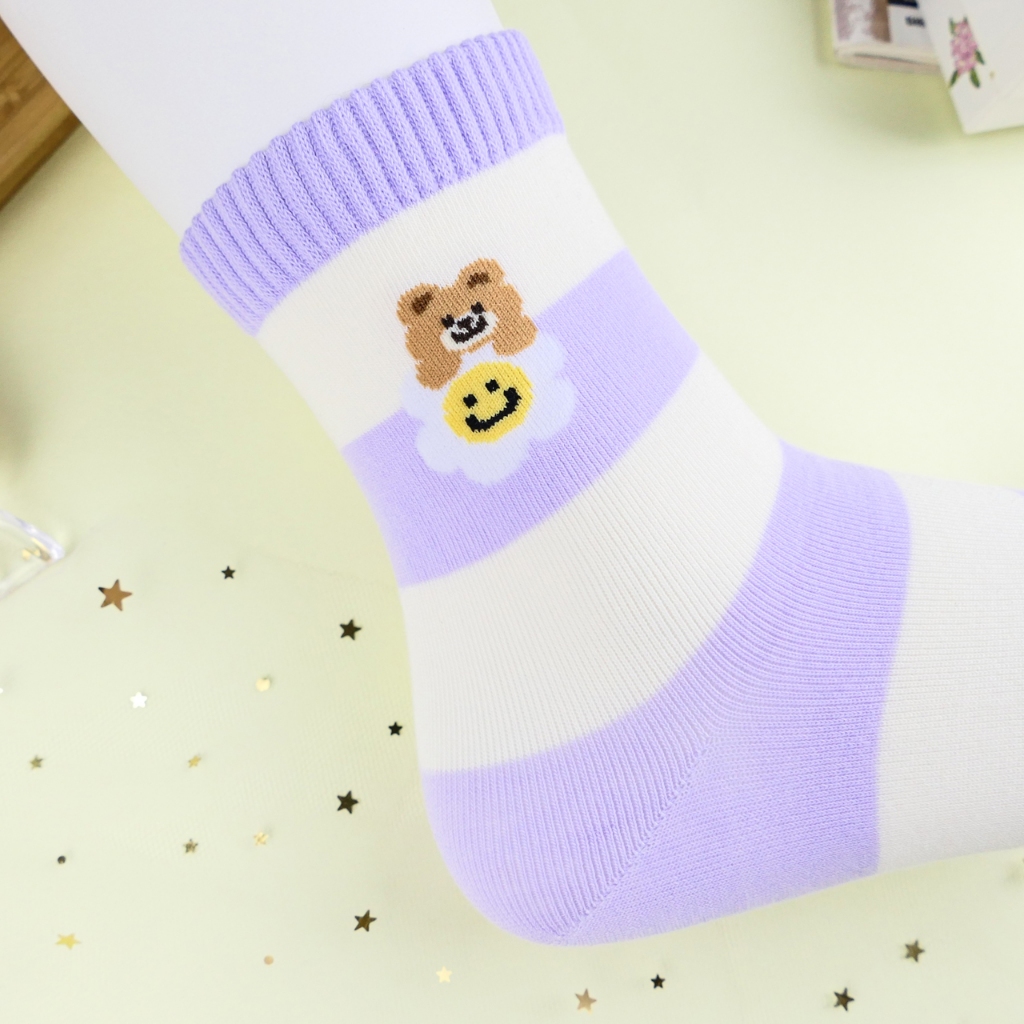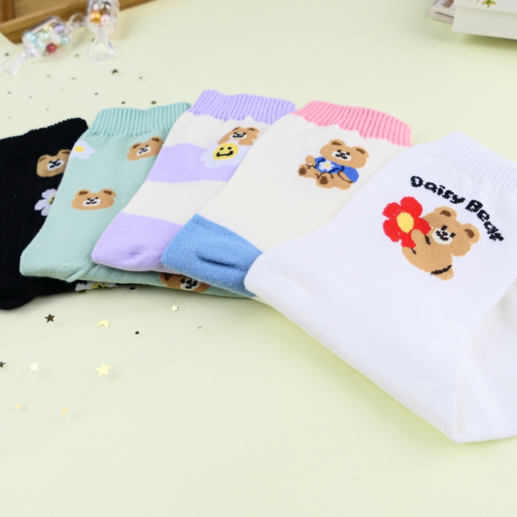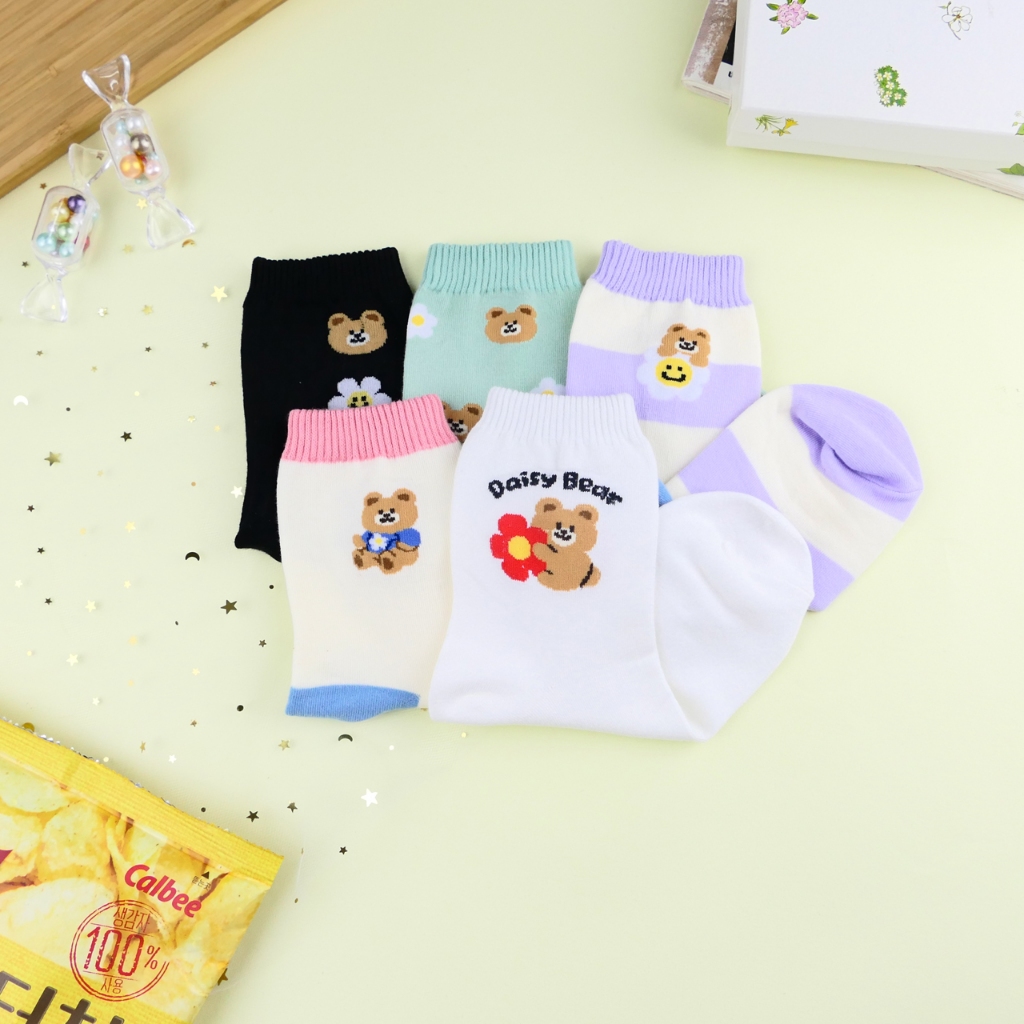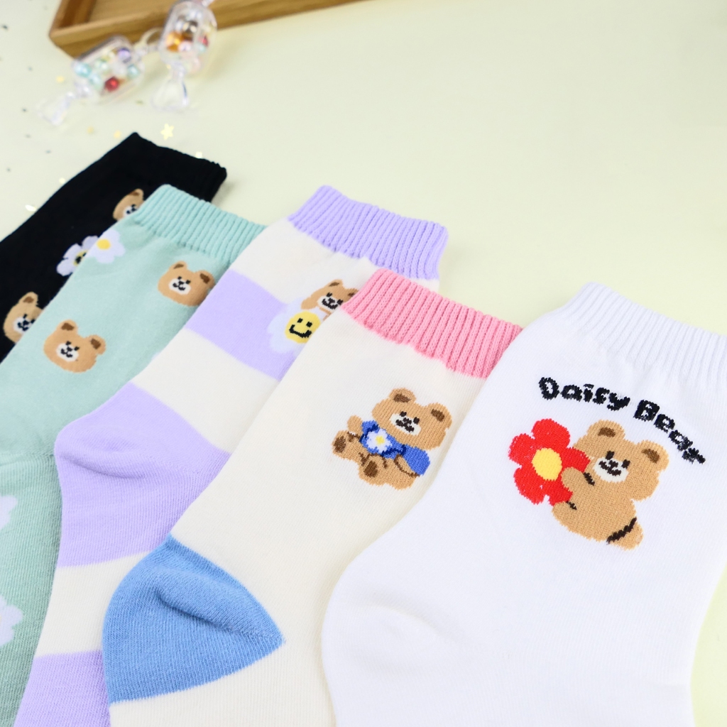 AHUA 阿華有事嗎 雛菊花朵小熊系列中筒襪 K2336 正韓襪子 百搭純棉襪 韓系必備 少女襪白底英文小熊|米黃底粉襪口|紫底米黃條紋|綠底滿白小熊雛菊|黑底直條小熊雛菊SocksAHUA 韓國襪子品牌旗艦店