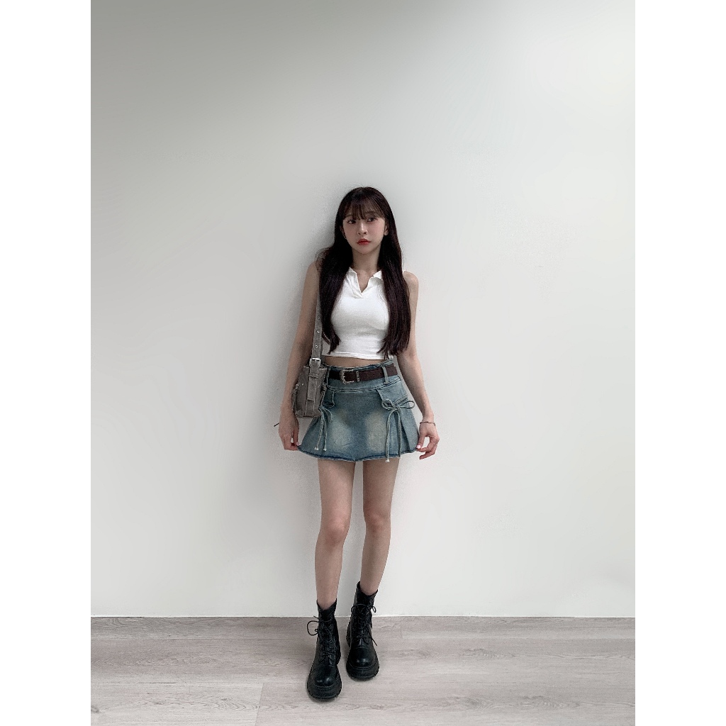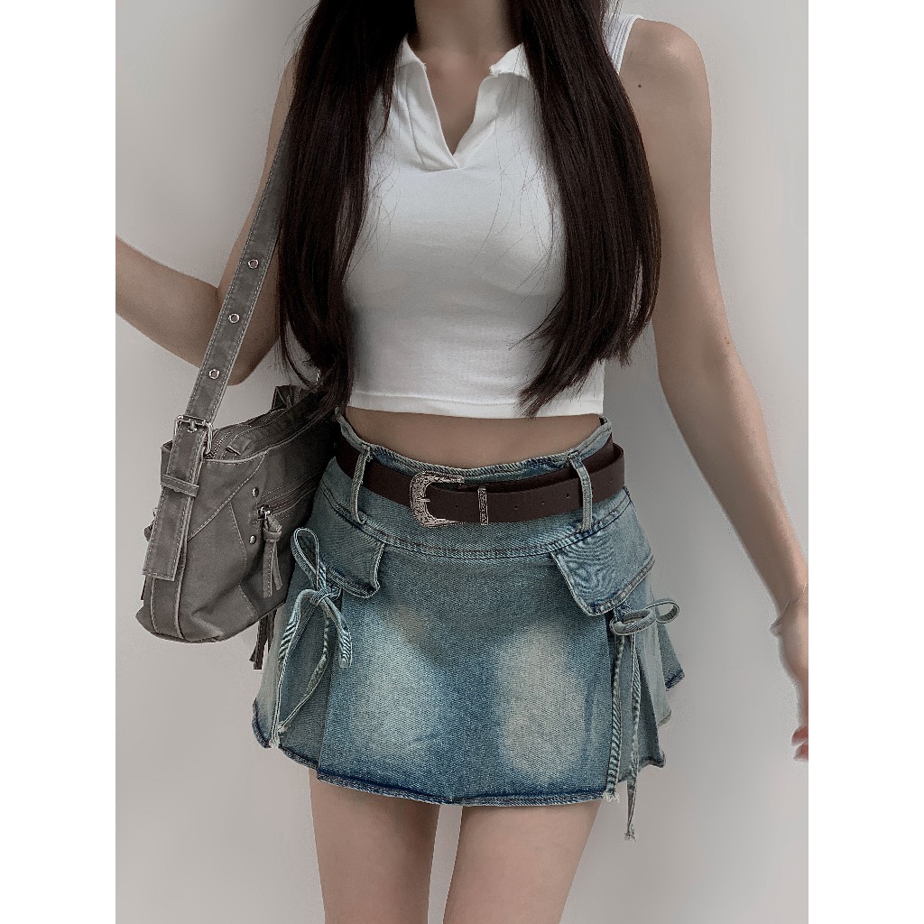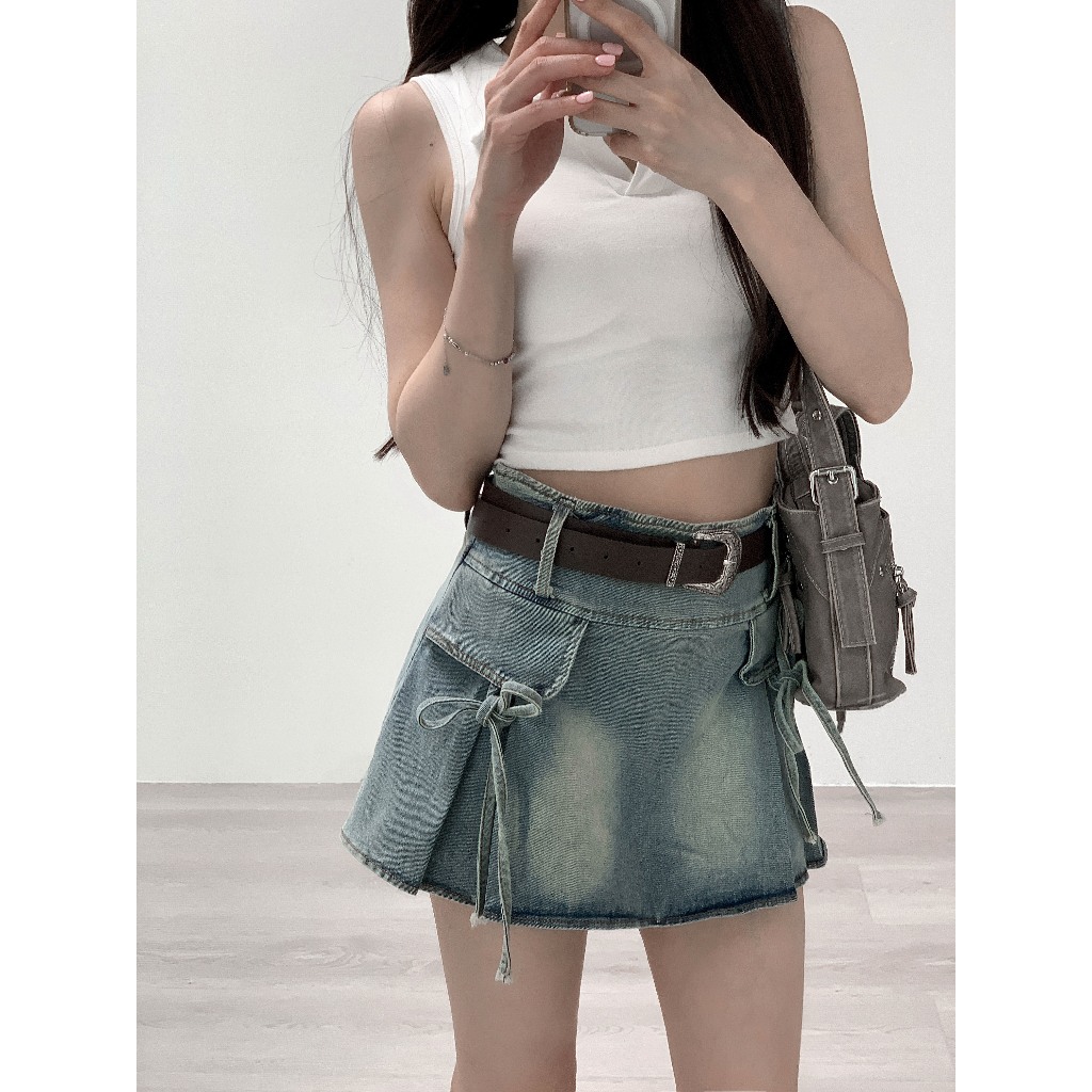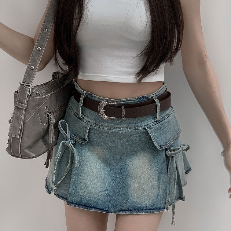 【Aa.chic熱賣商品】雙蝴蝶結皮帶牛仔短裙(單一色).下身/短裙/牛仔/百搭/復古/日常/穿搭【C028913】單一色(現貨),S|單一色(現貨),M|單一色(現貨),LAa Chic