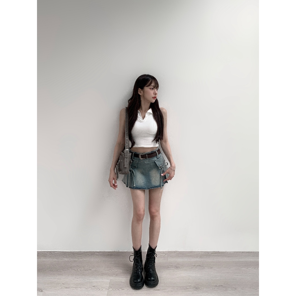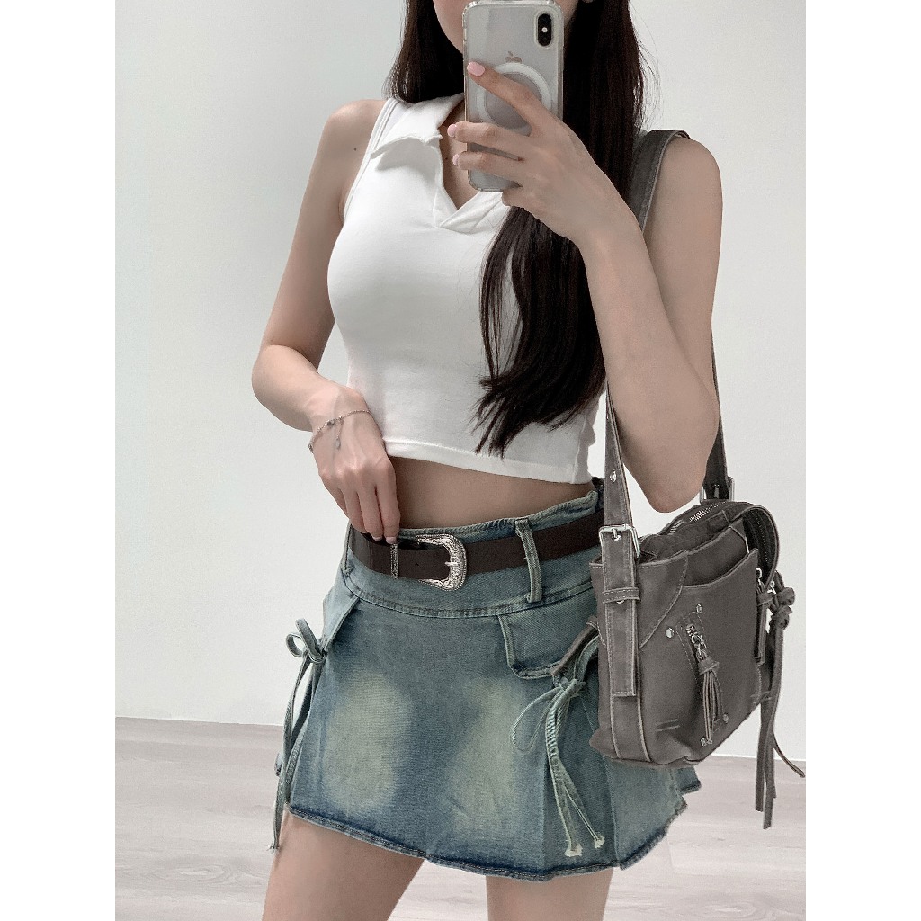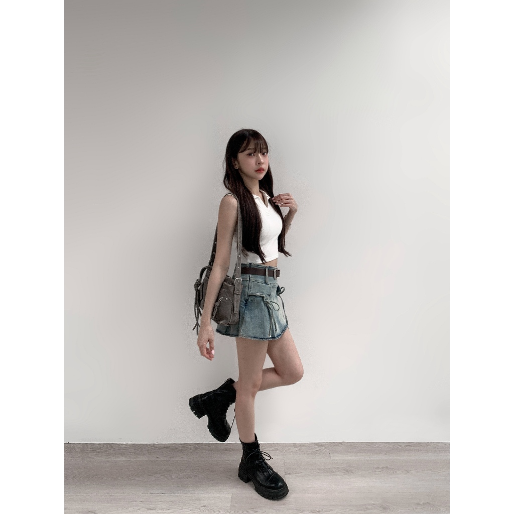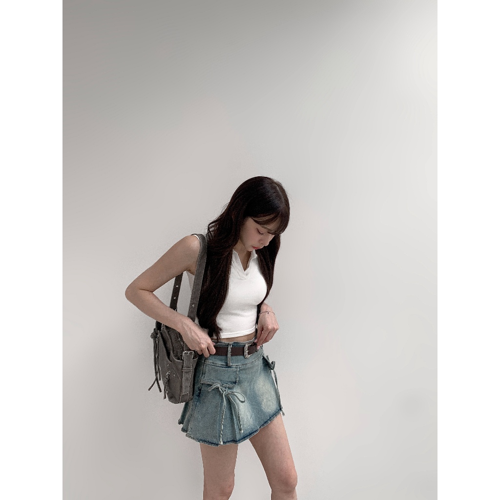 【Aa.chic熱賣商品】雙蝴蝶結皮帶牛仔短裙(單一色).下身/短裙/牛仔/百搭/復古/日常/穿搭【C028913】單一色(現貨),S|單一色(現貨),M|單一色(現貨),LAa Chic