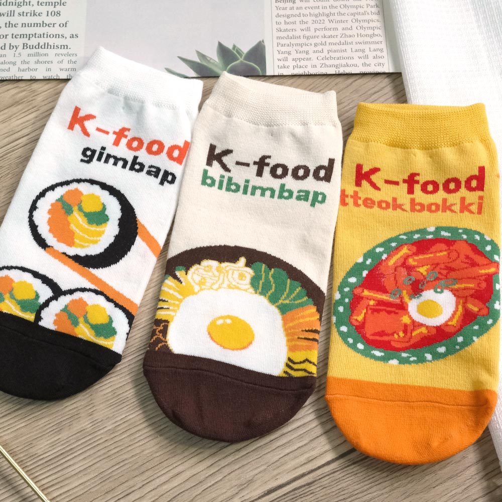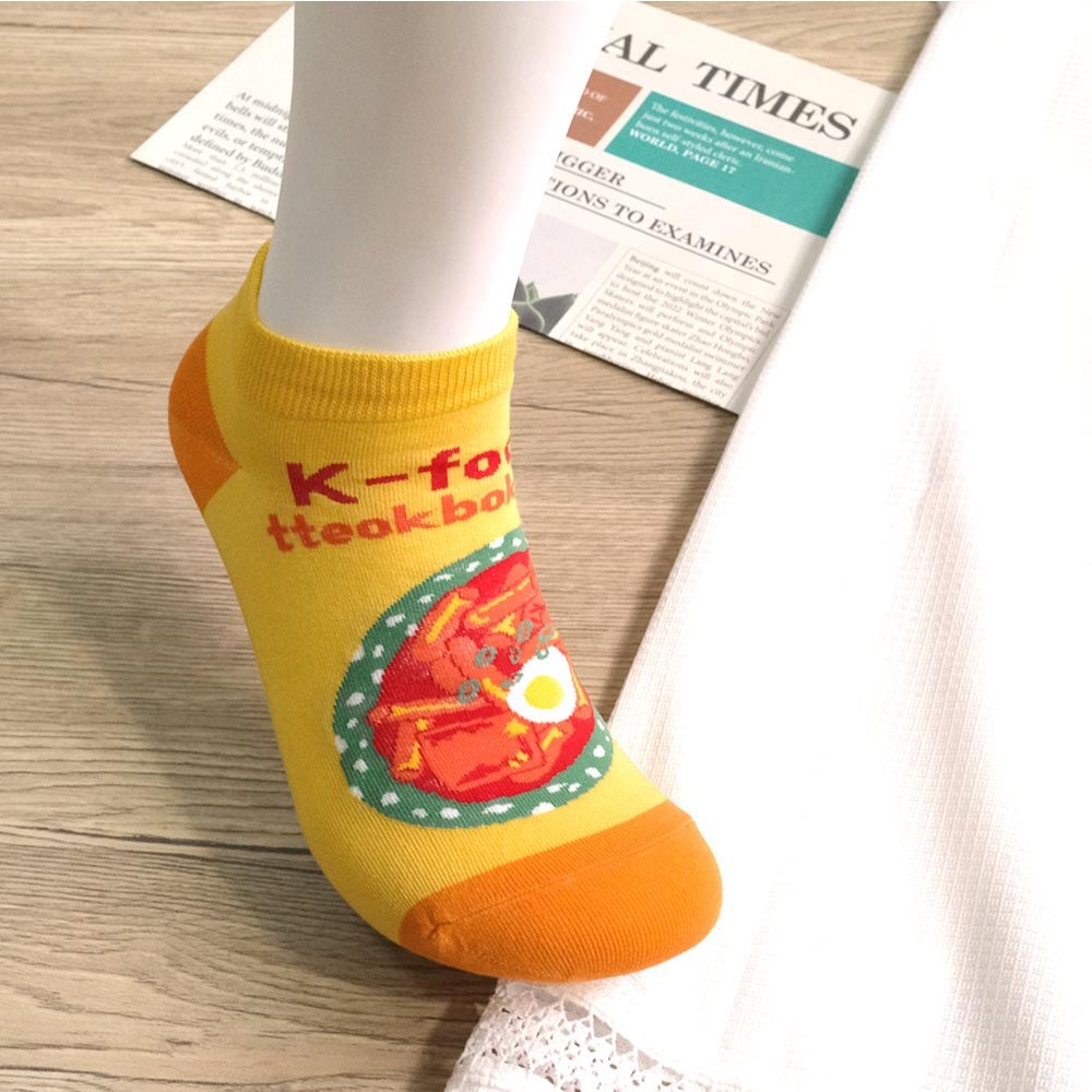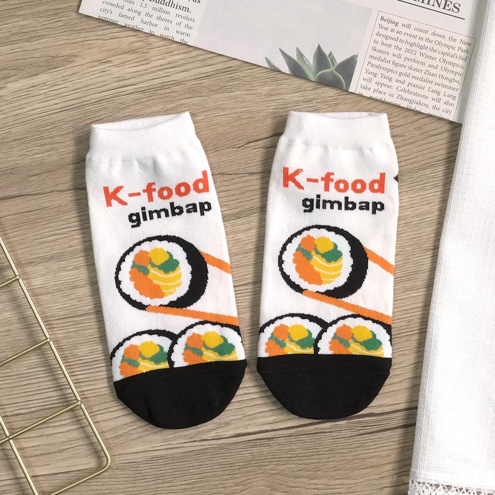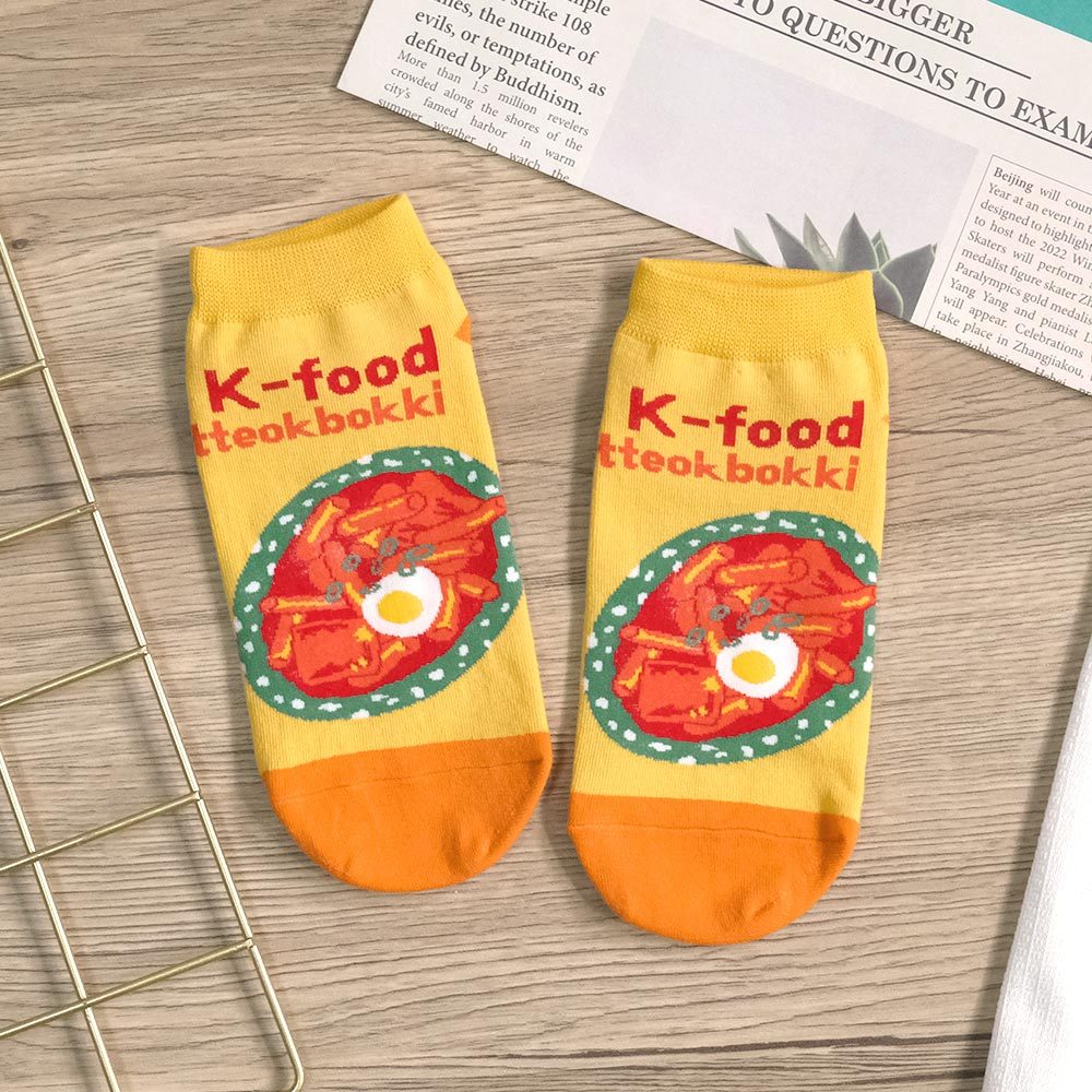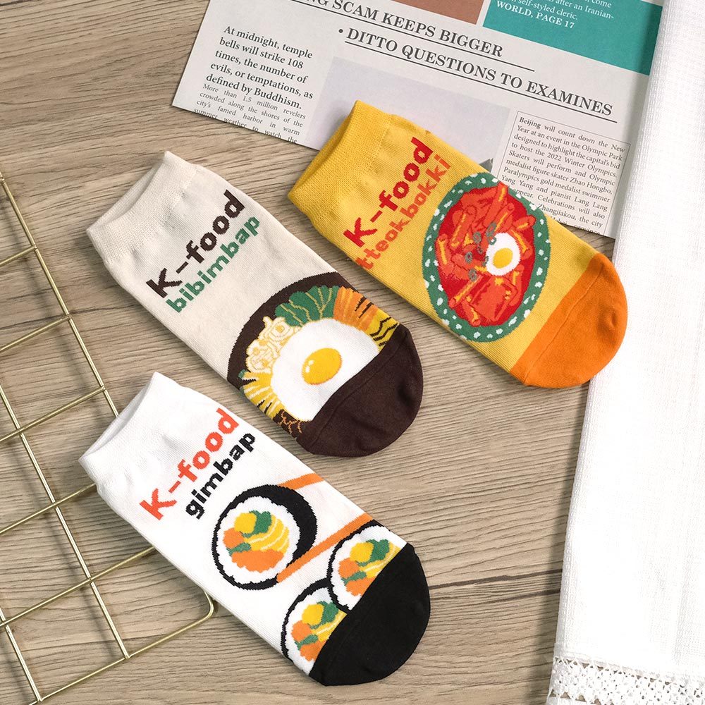 AHUA阿華有事嗎 Q版韓國美食拼色短襪 K2280 正韓襪子 百搭純棉襪 韓妞必備 少女襪白底黑前跟飯捲|米黃底咖前跟石鍋拌飯|黃底橘前跟辣炒年糕SocksAHUA 韓國襪子品牌旗艦店