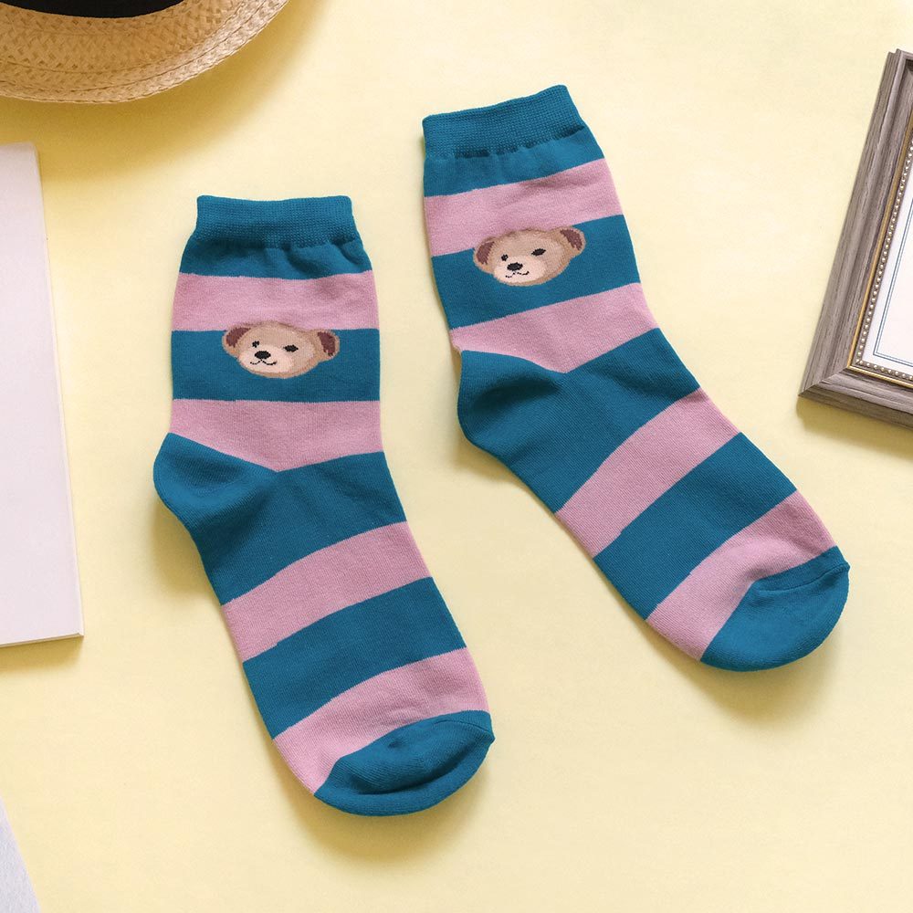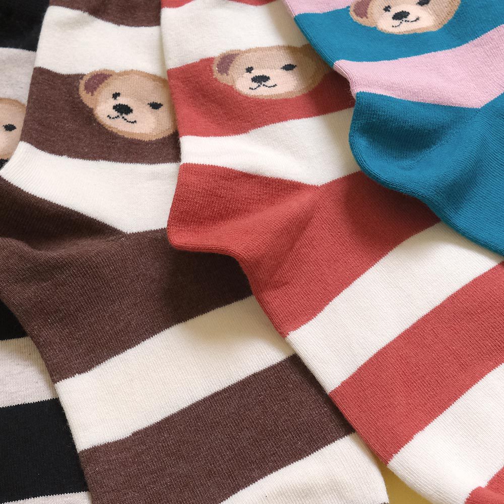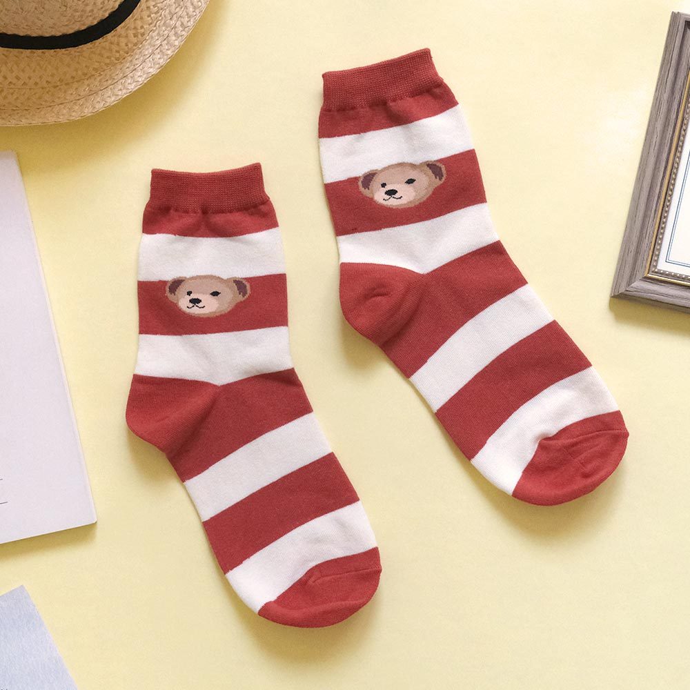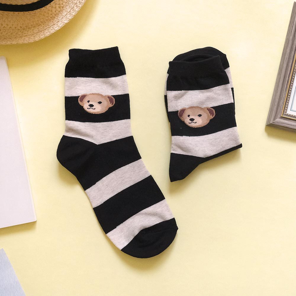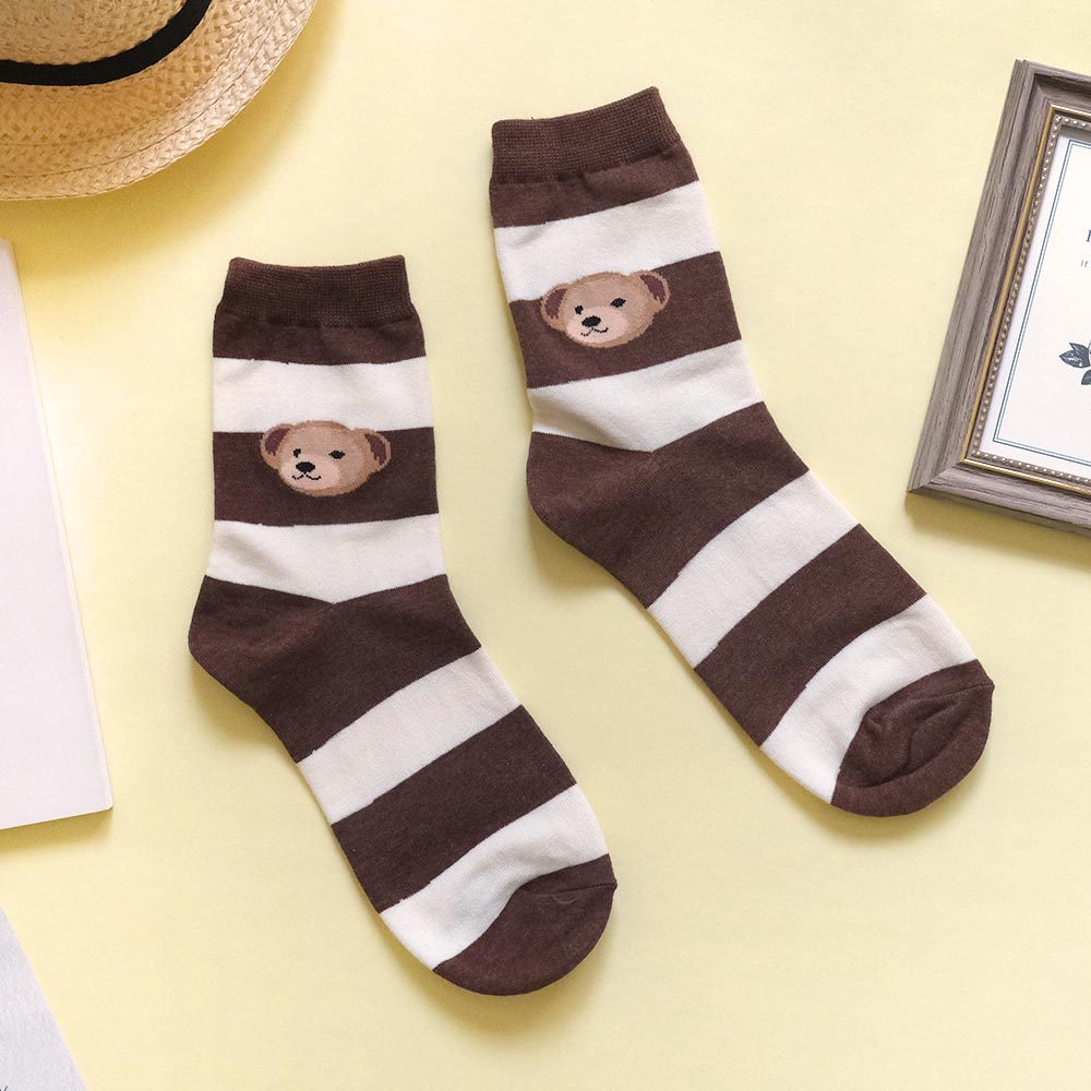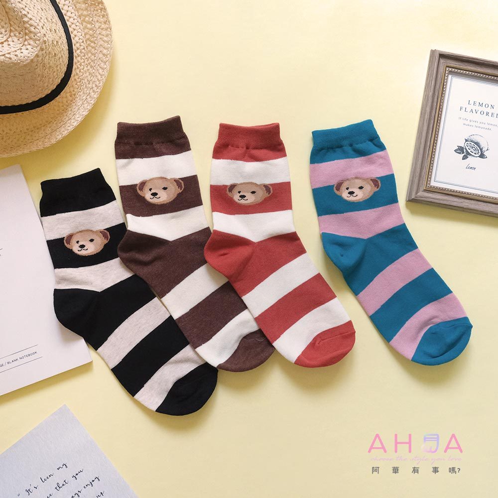 AHUA阿華有事嗎 撞色條紋大頭熊熊中筒襪 K2188 正韓襪子 百搭純棉襪 韓妞必備 少女襪黑底米白條紋|咖啡底米黃條紋|藍綠底粉條紋|磚紅底米黃條紋SocksAHUA 韓國襪子品牌旗艦店